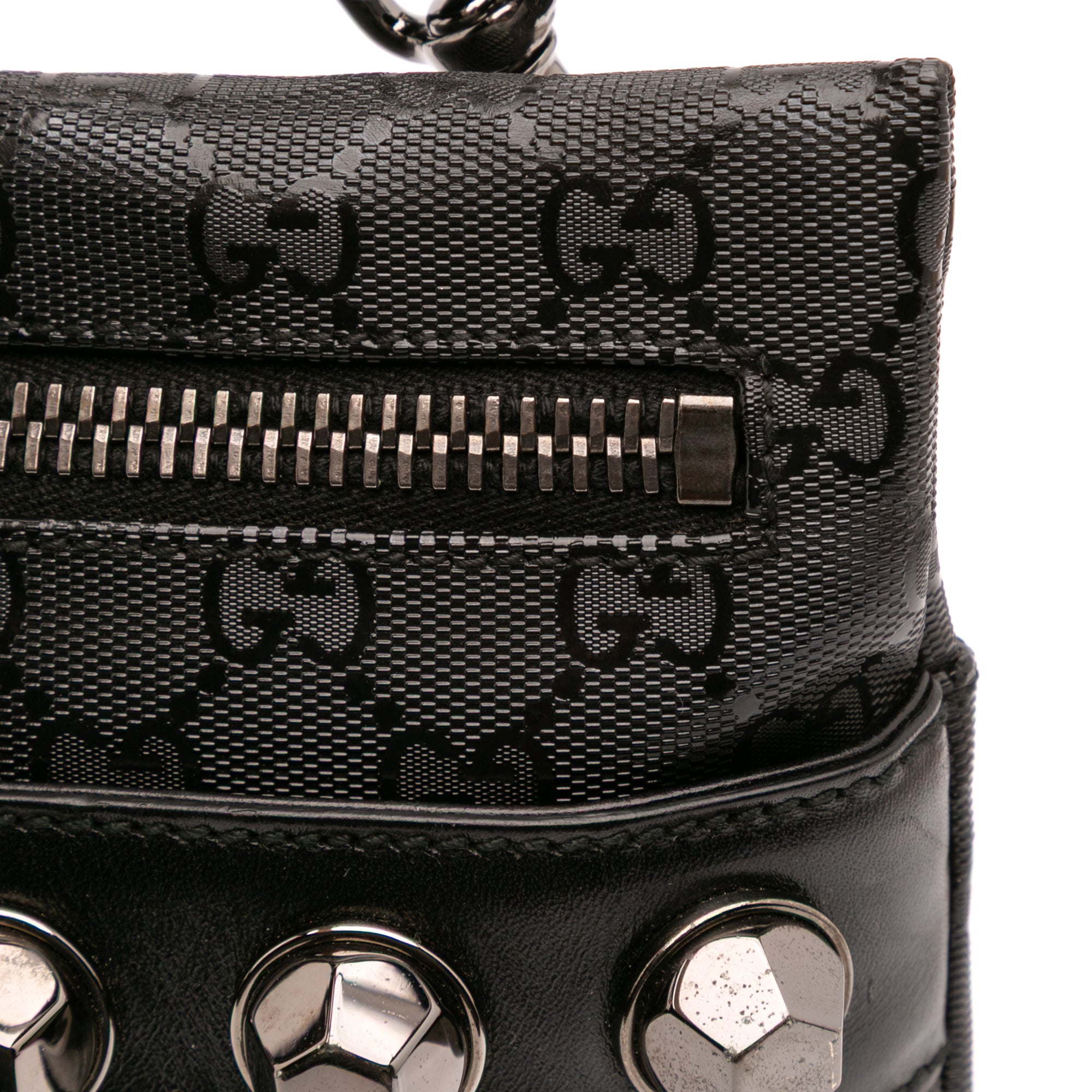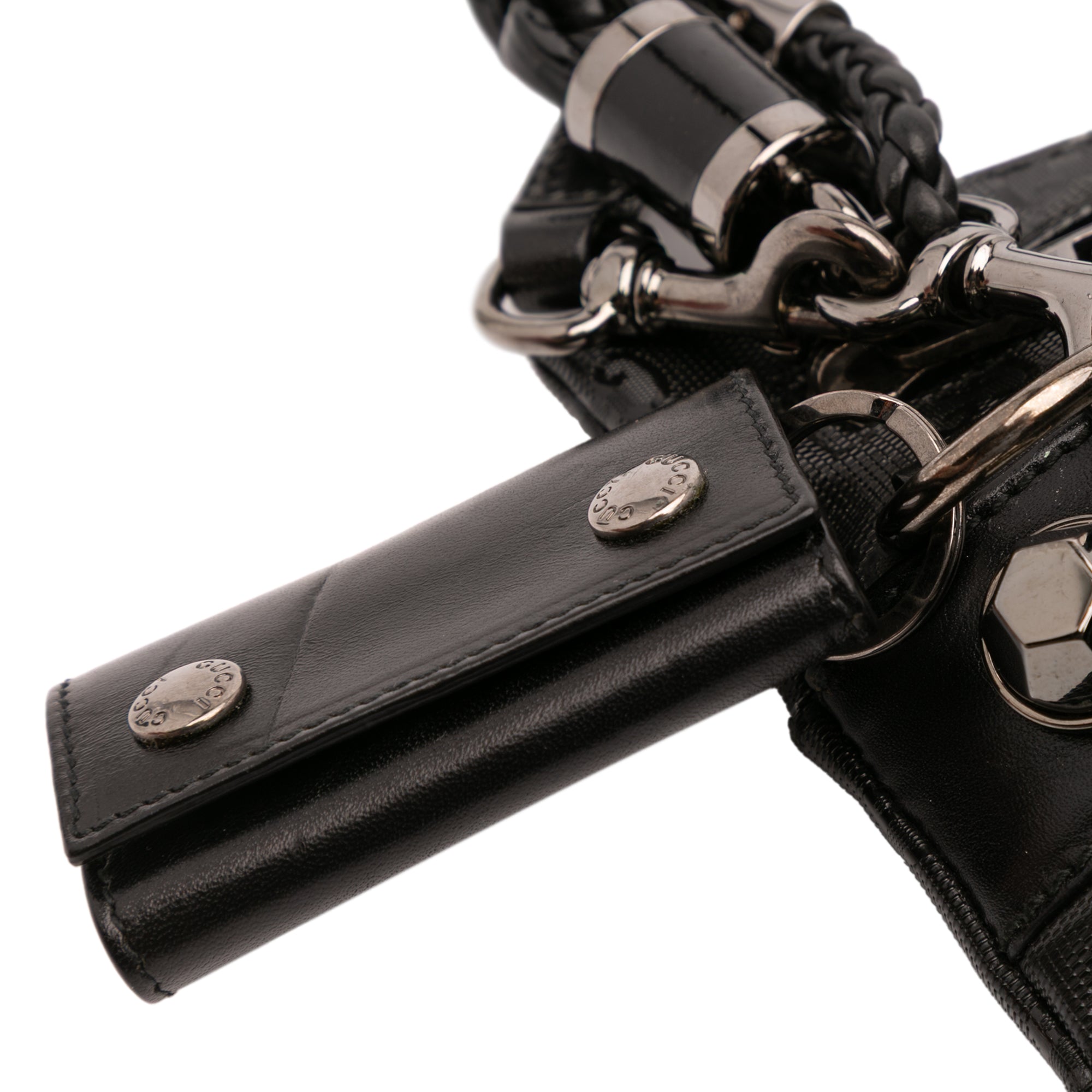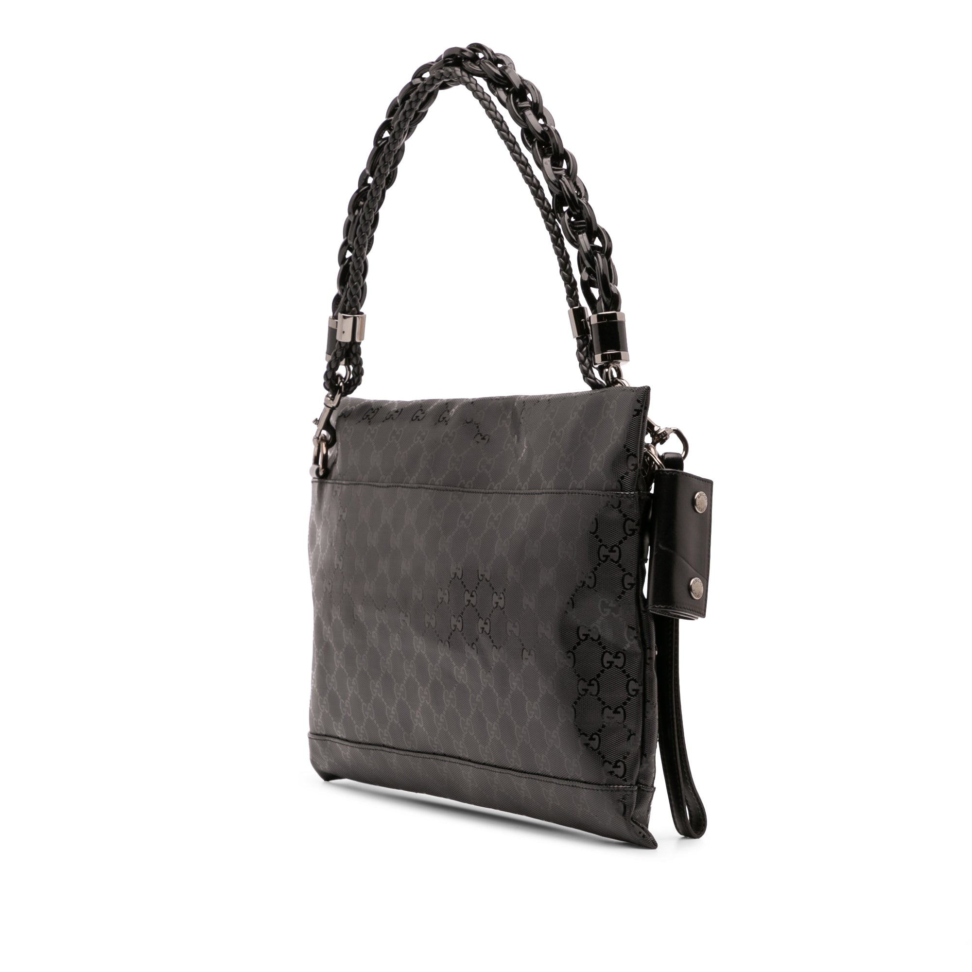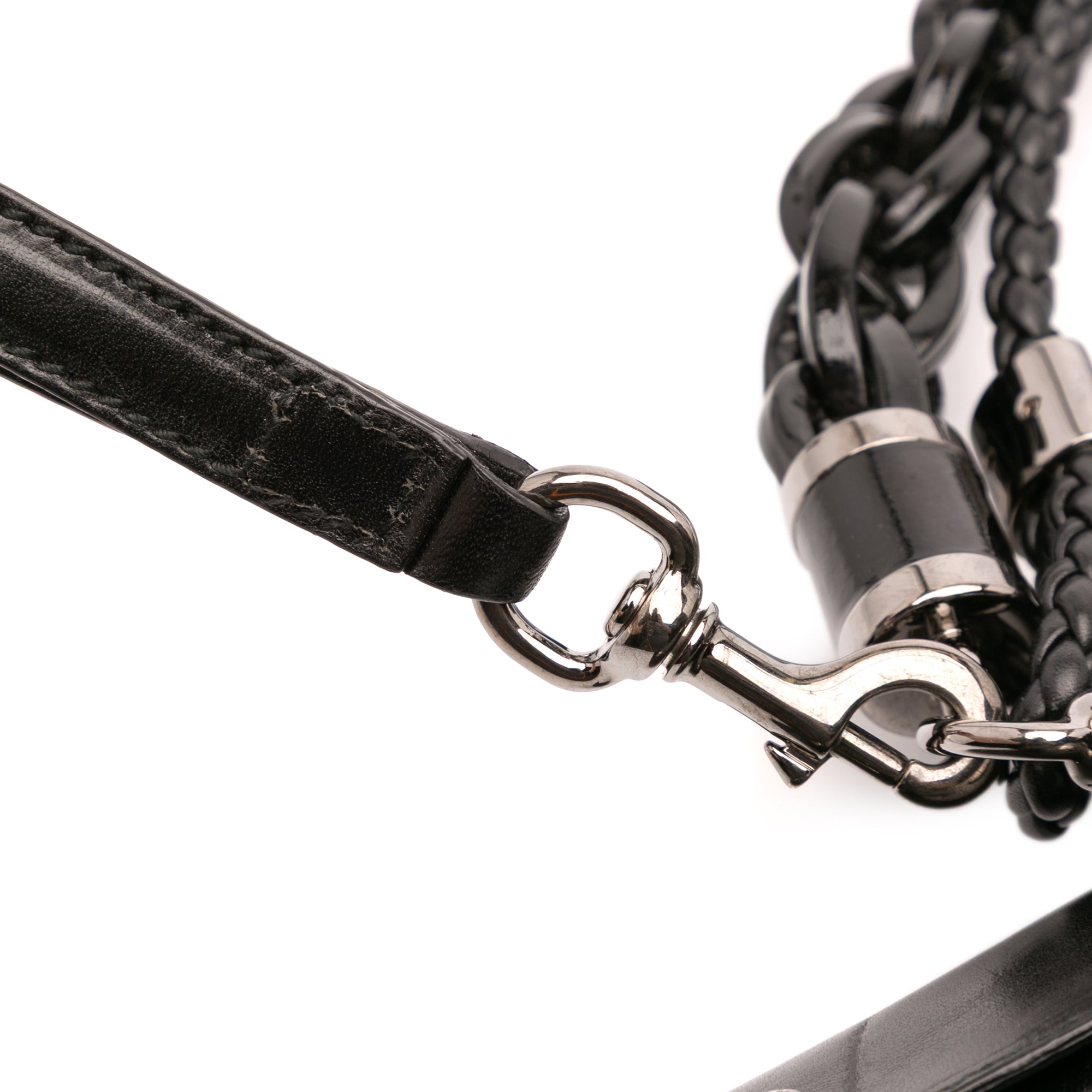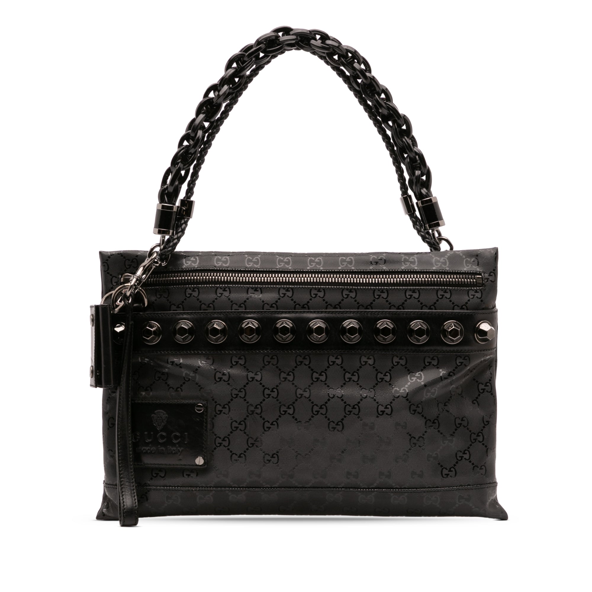 This shoulder bag features a coated canvas body with leather trim, stud details, braided straps, a front zip closure, and an interior zip pocket. Retail Price: 670.00