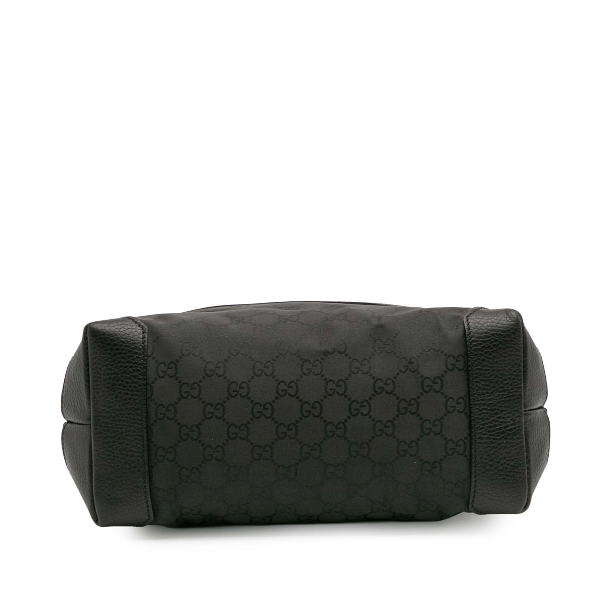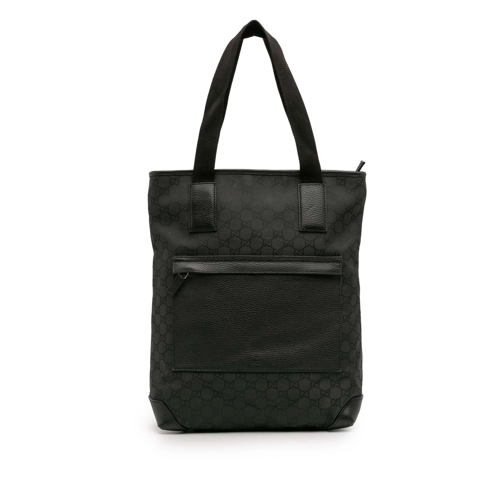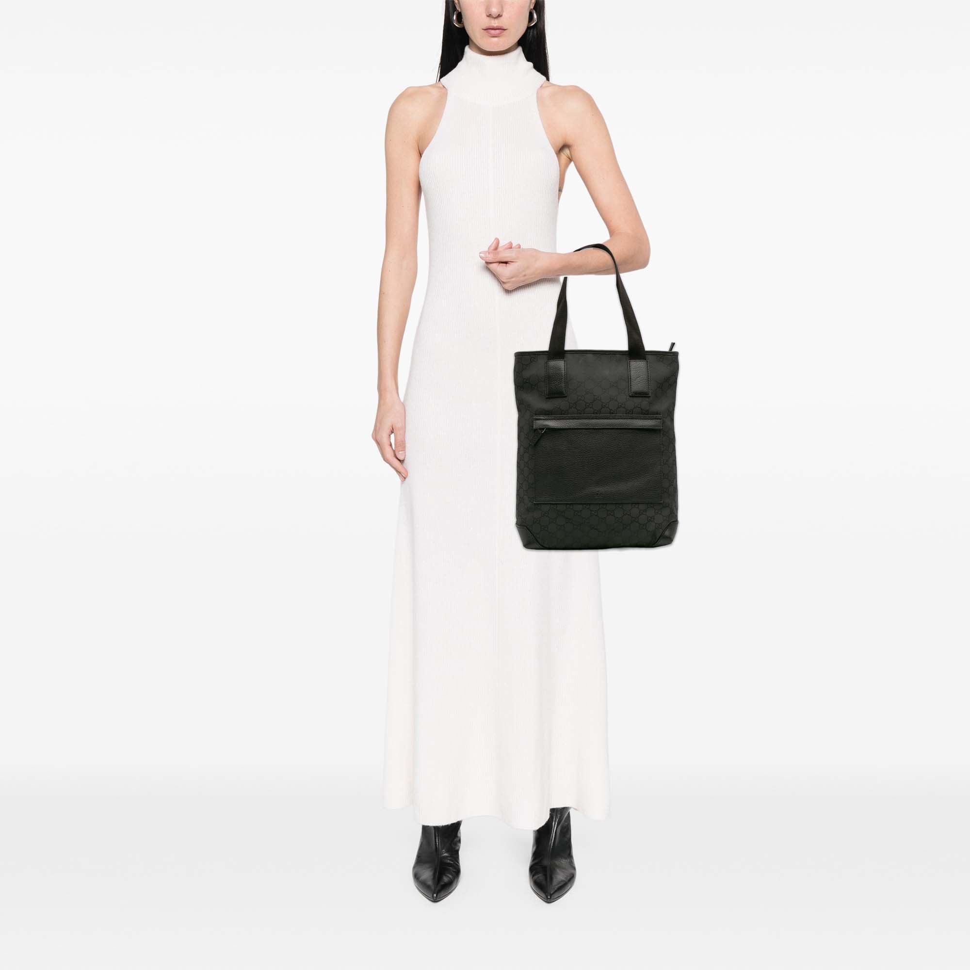 This tote bag features a nylon body with leather trim, flat straps, a top zip closure, an exterior front zip compartment, and an interior zip pocket. Inclusion: Dust bag. Retail Price: 995.00