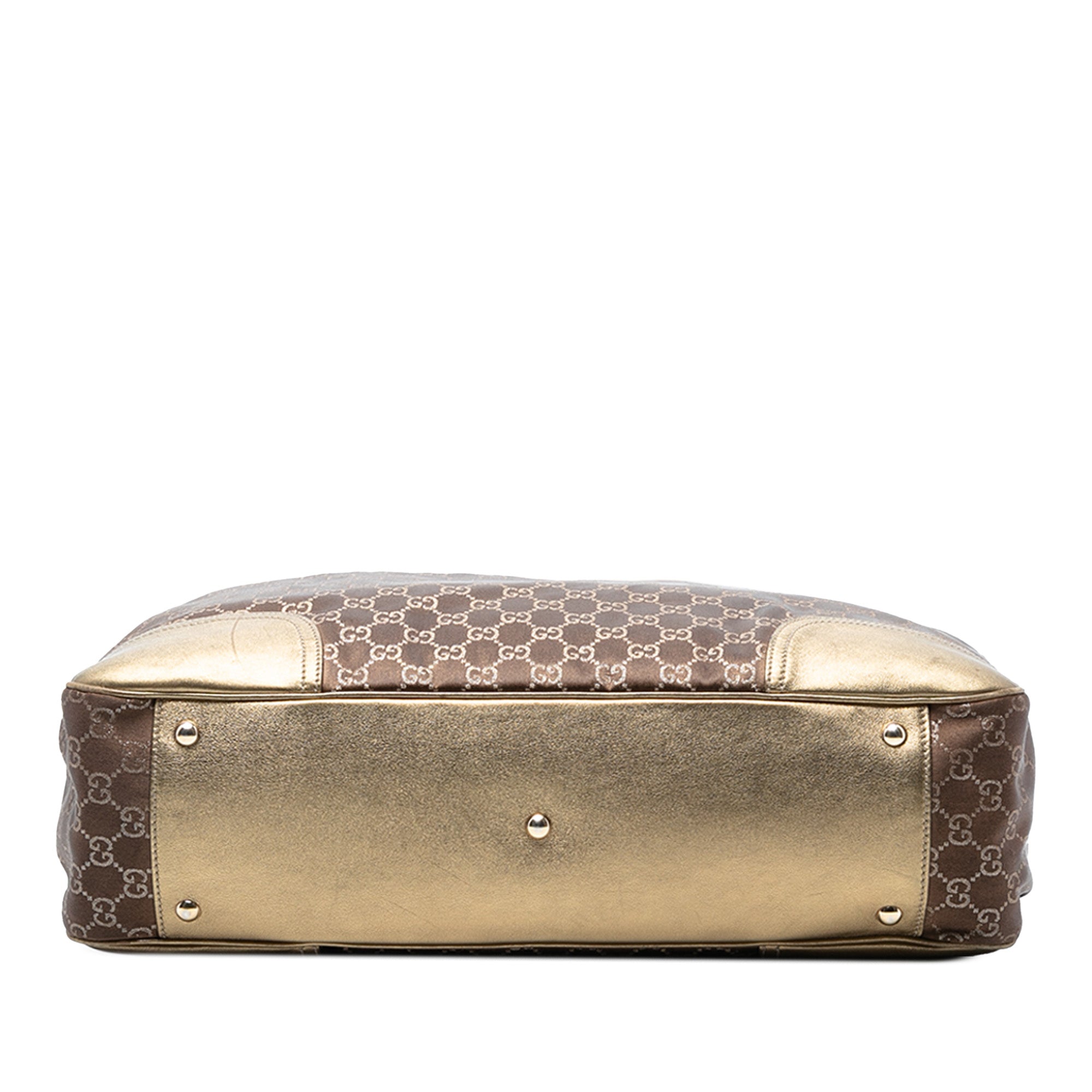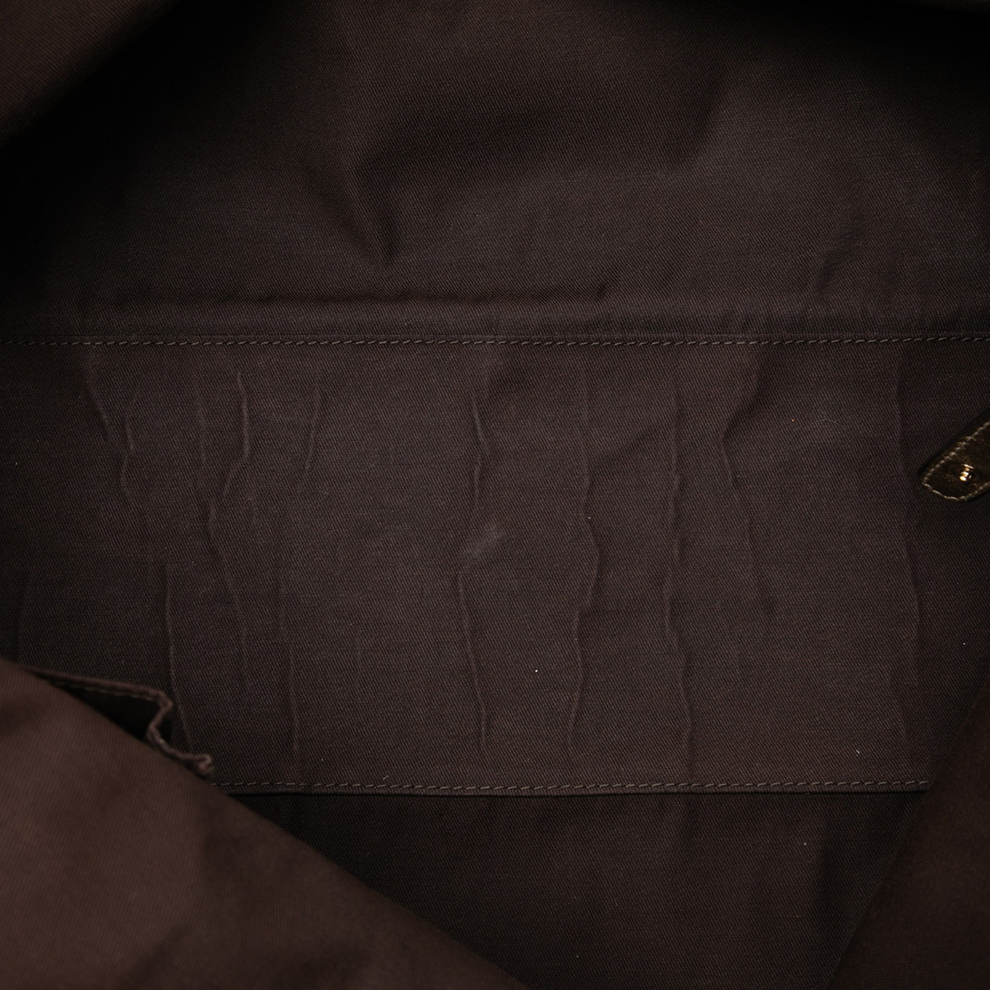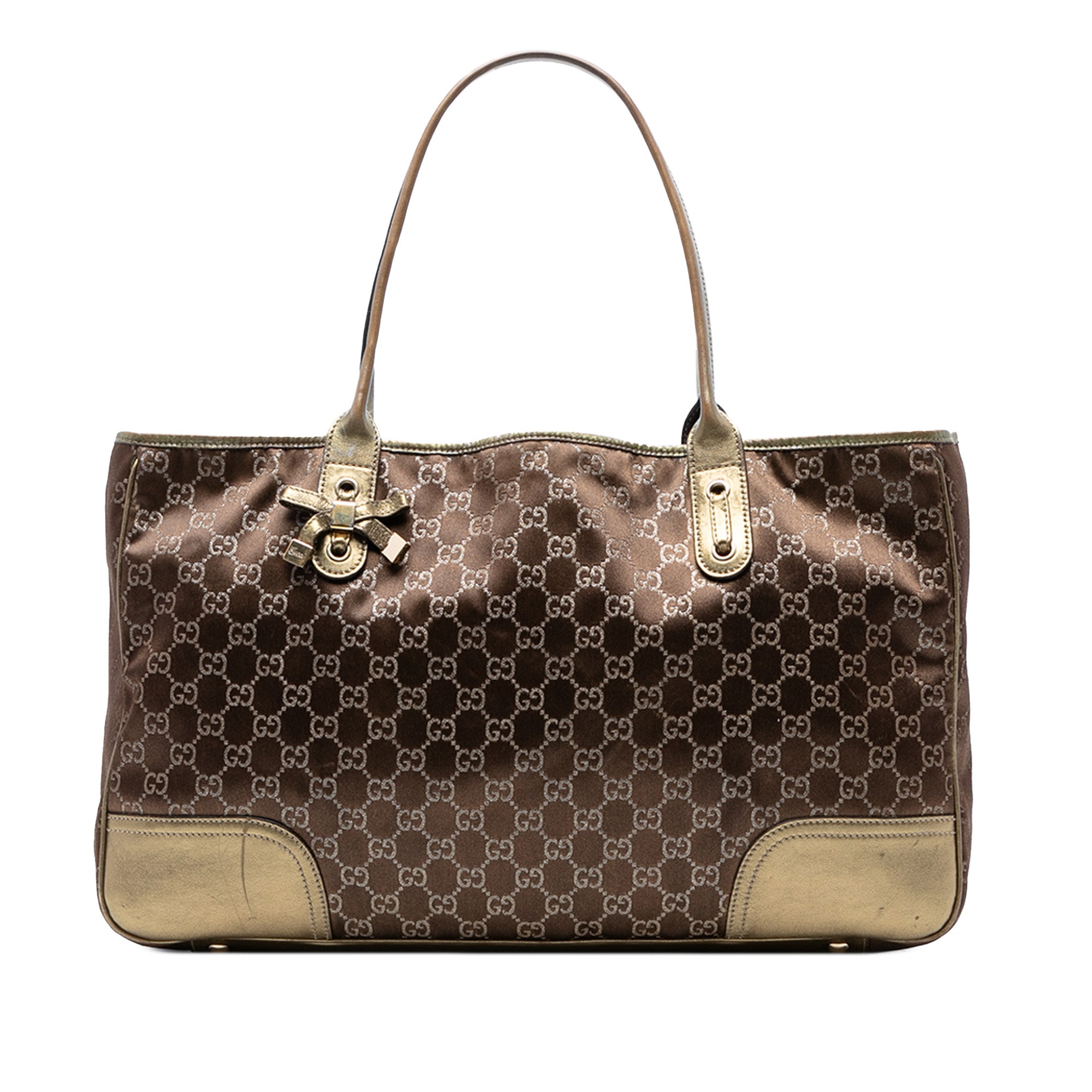 The Princy tote bag features a satin body with leather trim, rolled leather handles, an open top, and interior zip and slip pockets. Retail Price: 1000.00