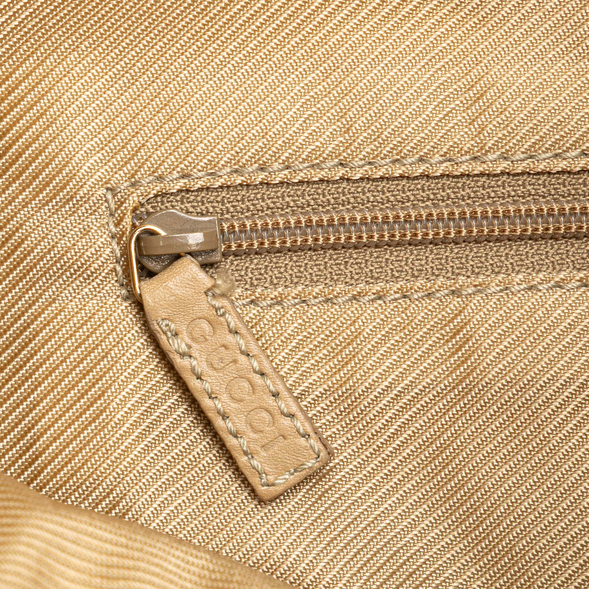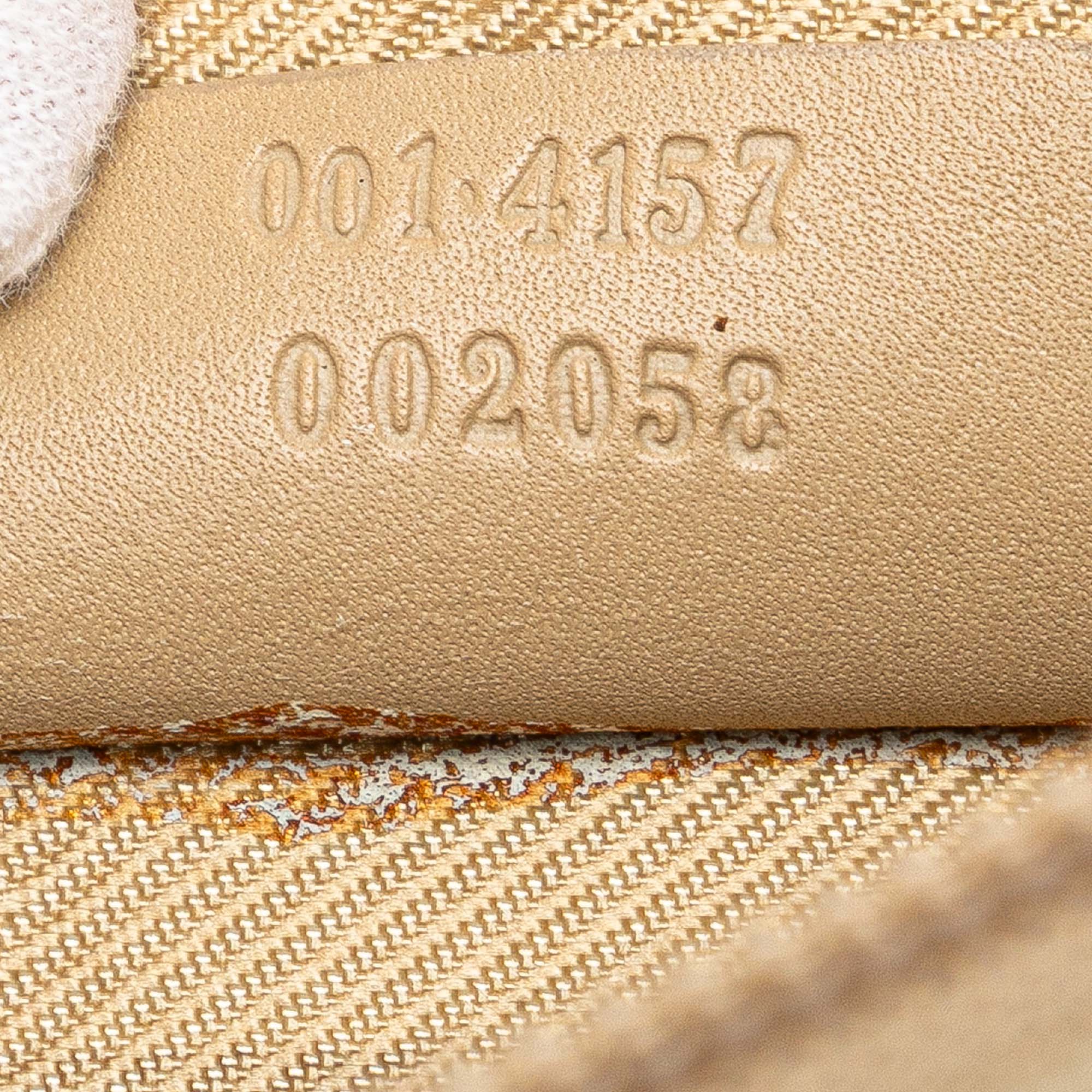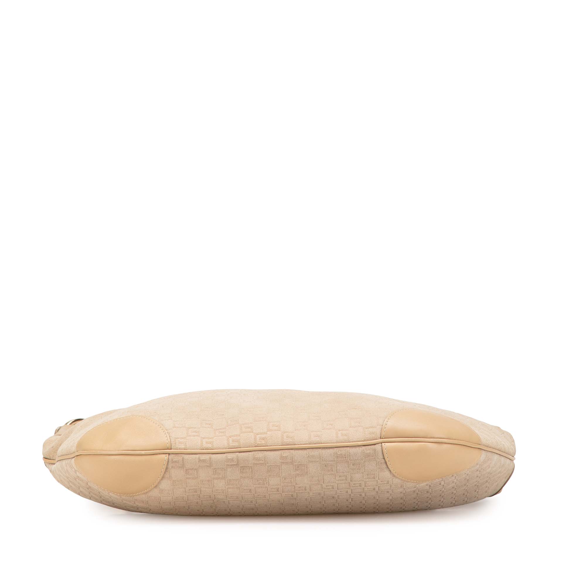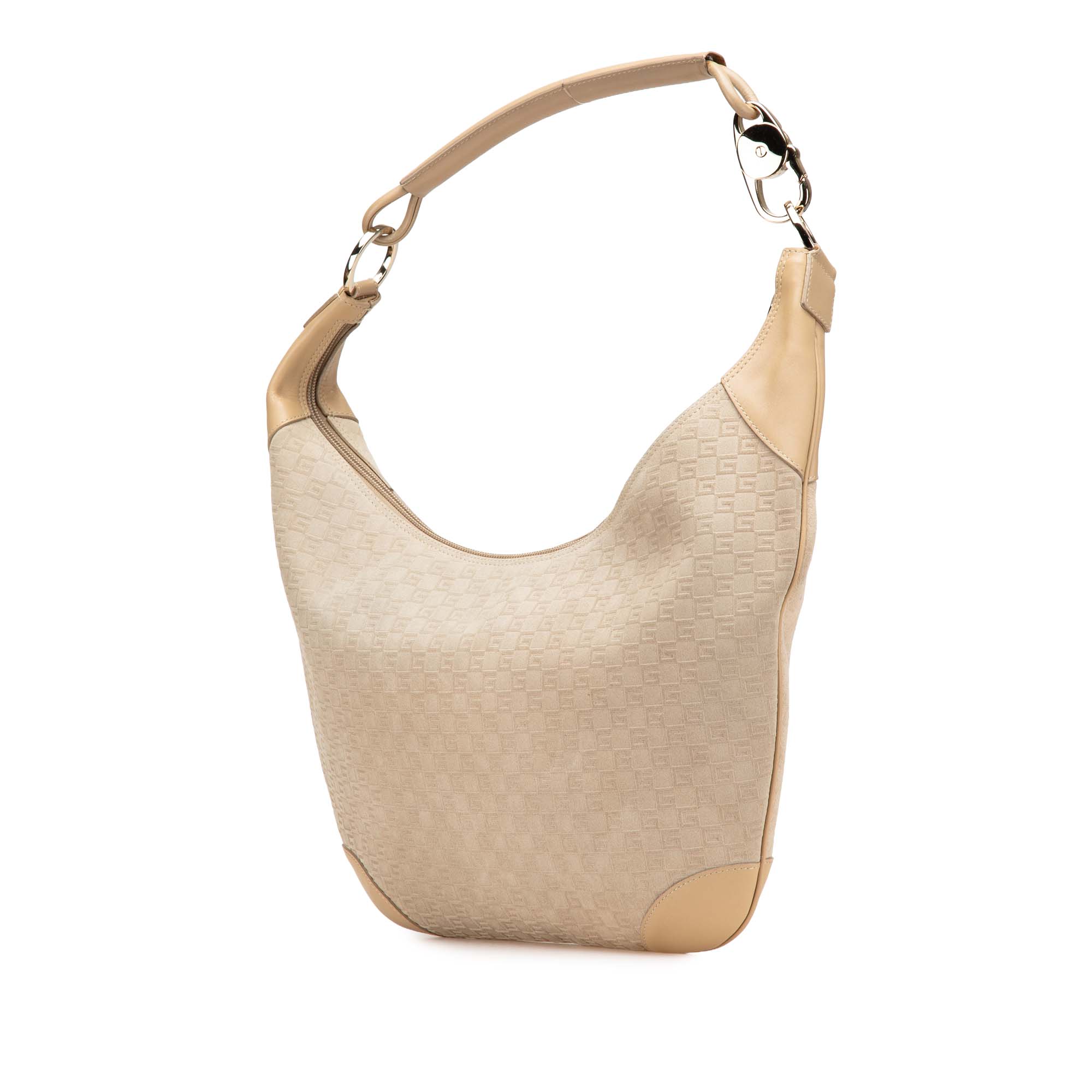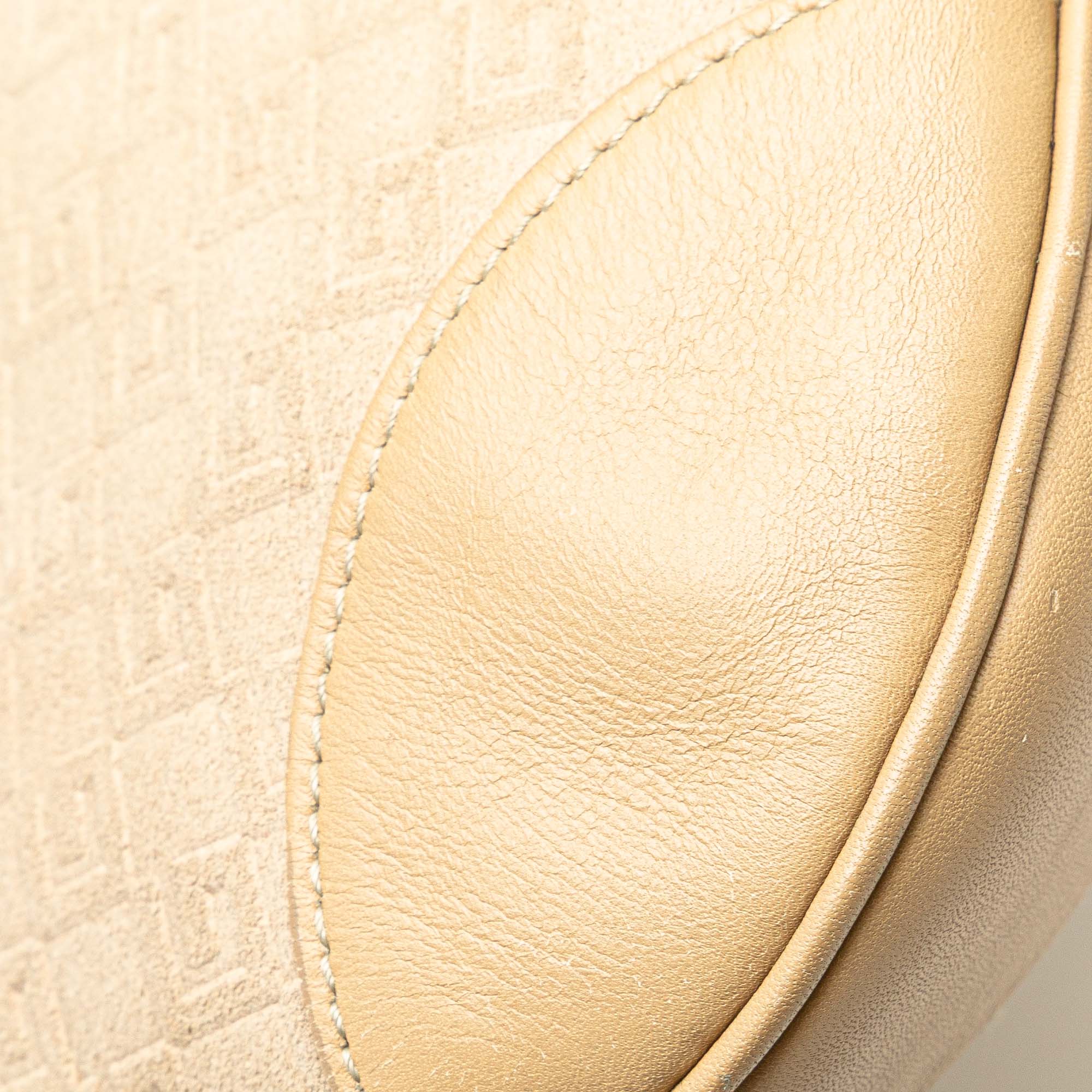 This shoulder bag features a canvas body with leather trim, a rolled leather handle, a top zip closure, and an interior zip pocket. Retail Price: 790.00
