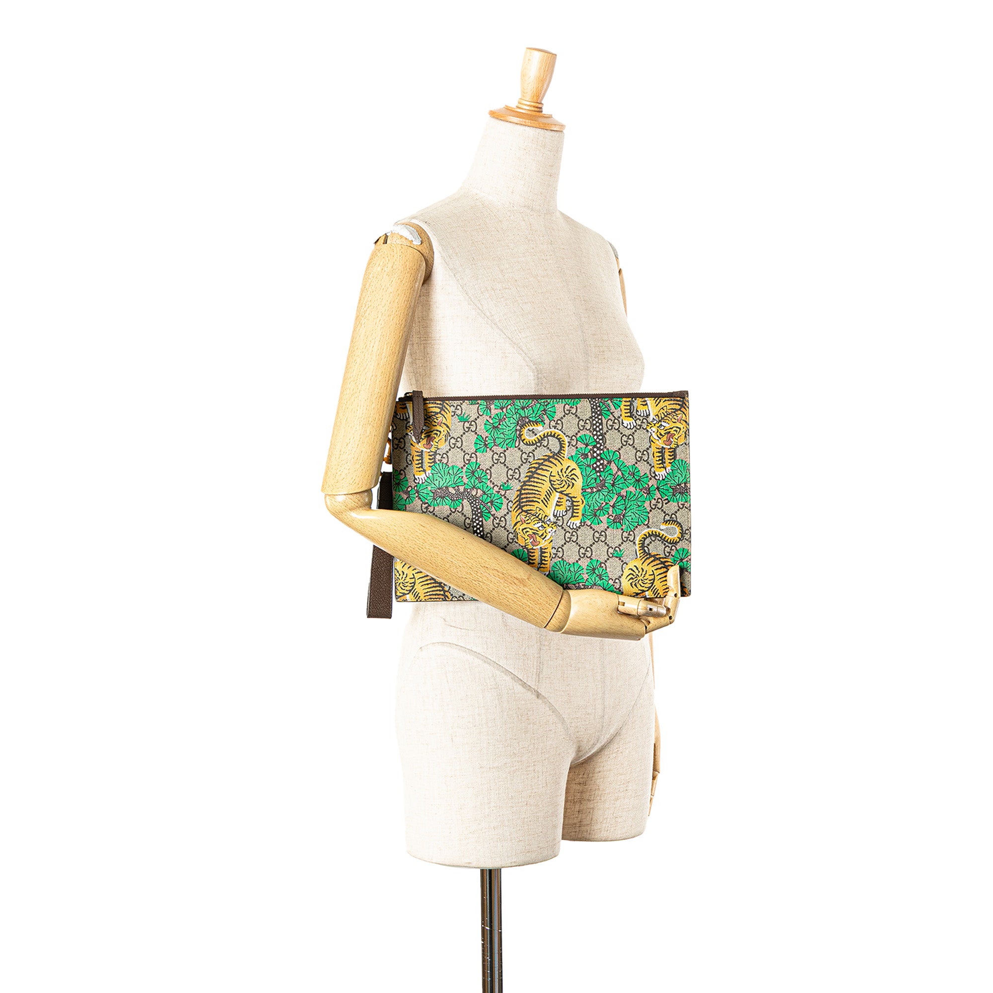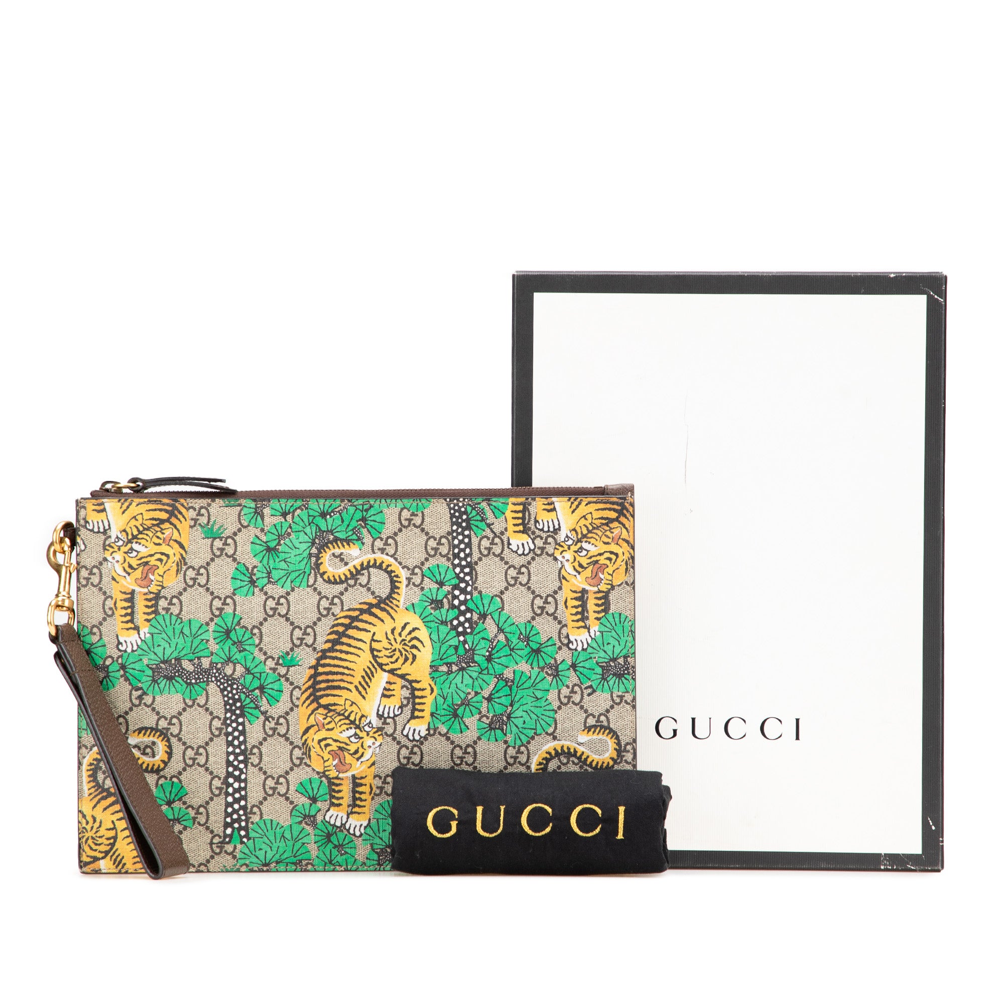 This clutch bag features a printed coated canvas body, a flat leather wrist strap, a top zip closure, and interior slip pockets. Inclusion: Dust bag, box. Retail Price: 850.00