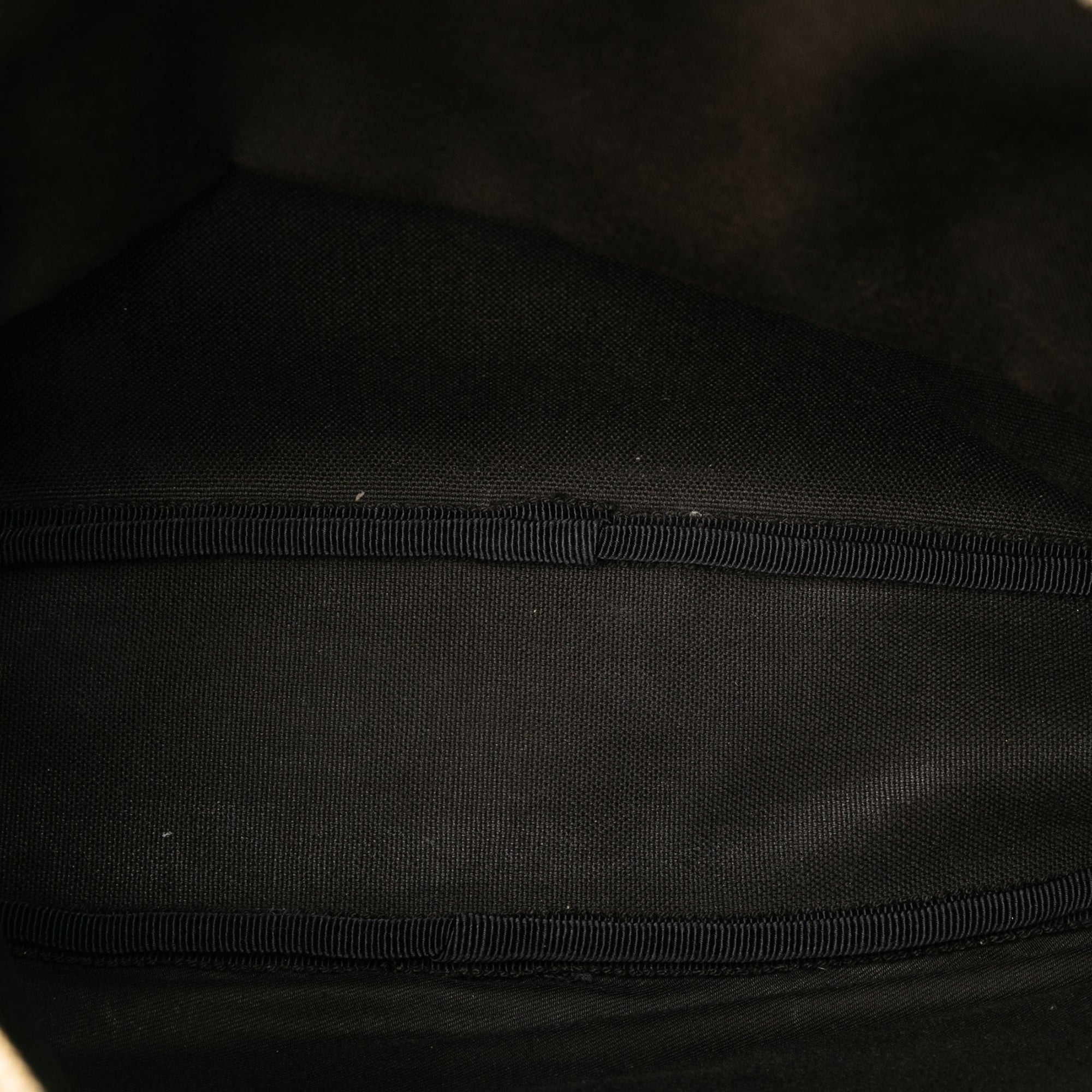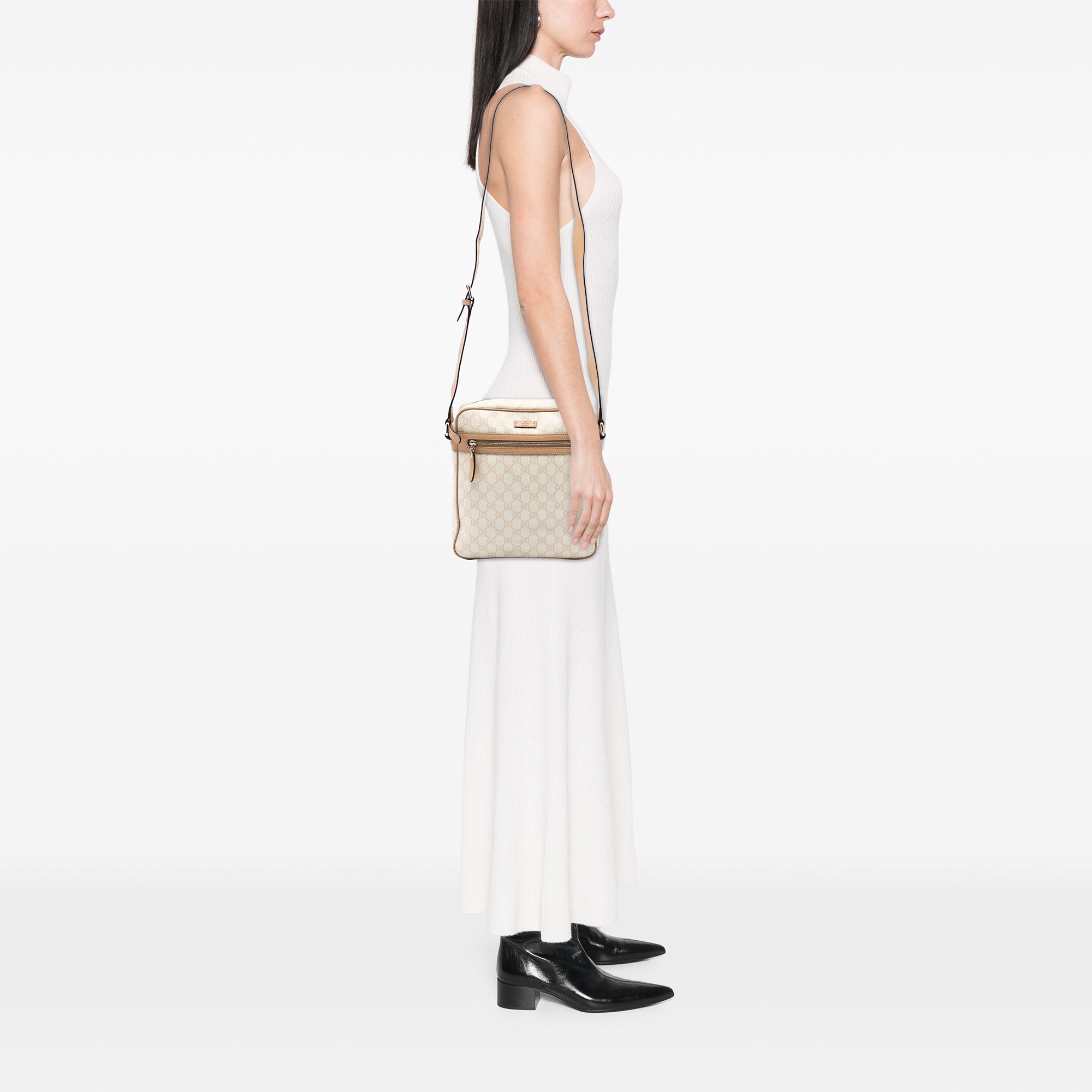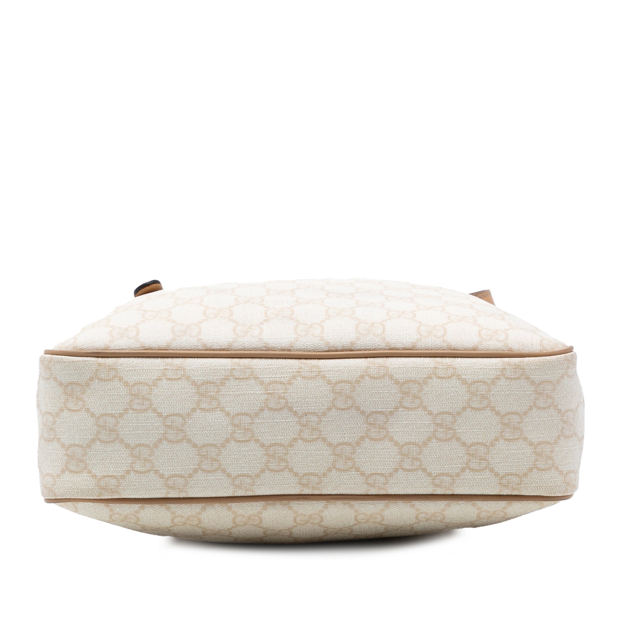 This crossbody bag features a coated canvas body with leather trim, an adjustable flat strap, a top zip closure, and an exterior front zip pocket. Retail Price: 1350.00