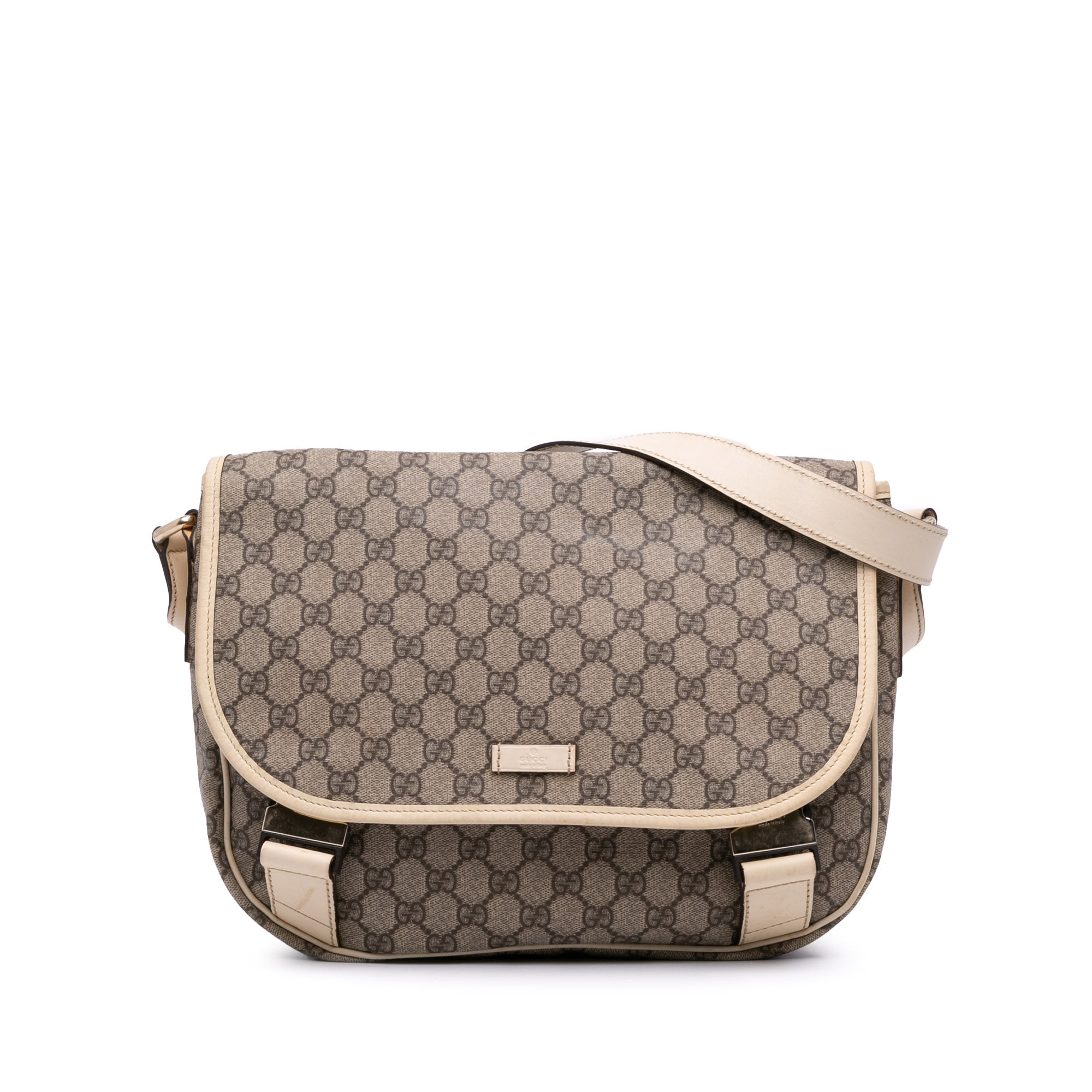 This crossbody bag features a coated canvas body with leather trim, a flat adjustable strap, top flap with dual buckle closures, and an interior slip pocket. Retail Price: 1200.00