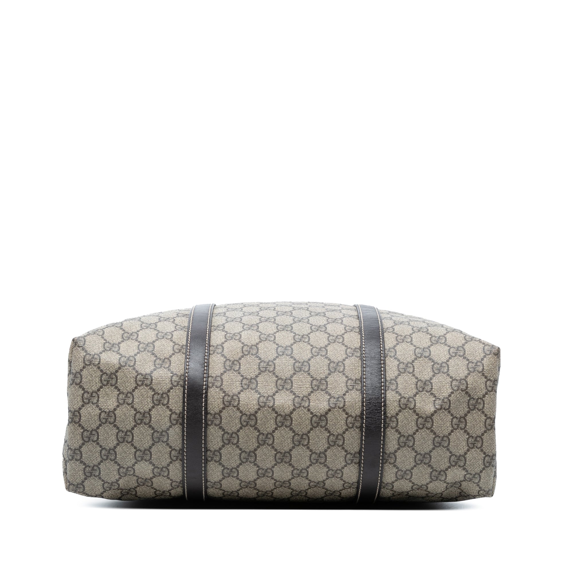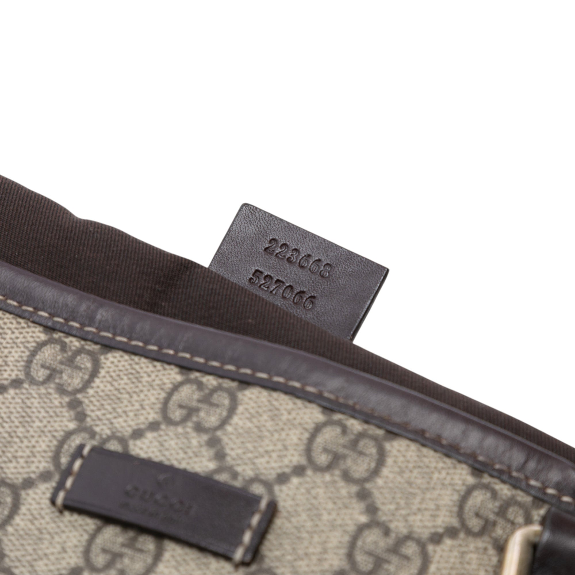 This tote bag features a coated canvas body with leather trim, rolled leather handles, an open top with magnetic snap closure, and interior zip and slip pockets and compartments. Retail Price: 830.00