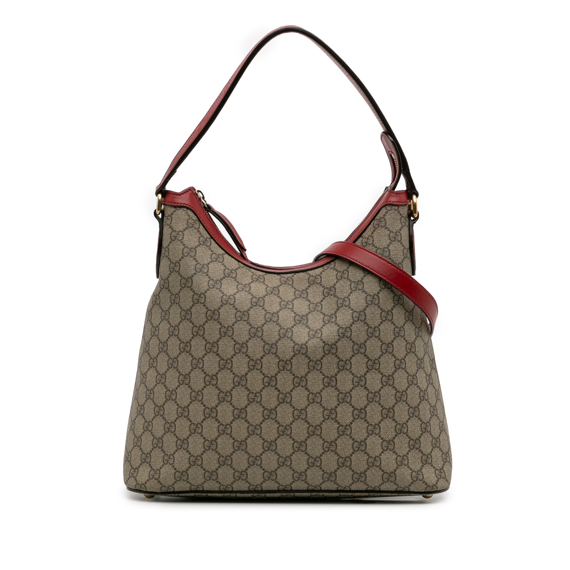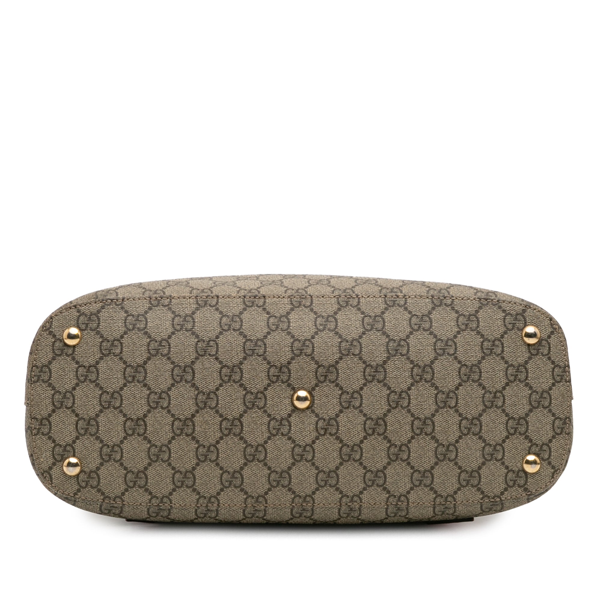 This satchel features a coated canvas body with leather trim, a flat leather top handle, a detachable flat leather strap, a top zip closure, an exterior back slip pocket, and interior zip and slip pockets. Retail Price: 1490.00