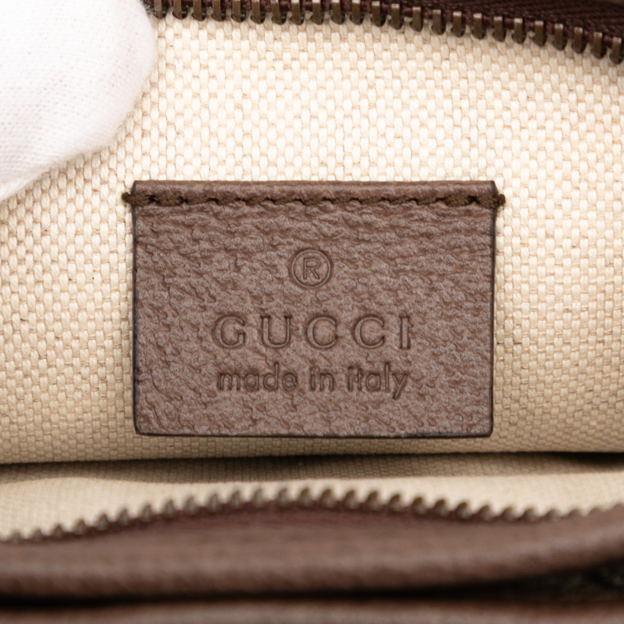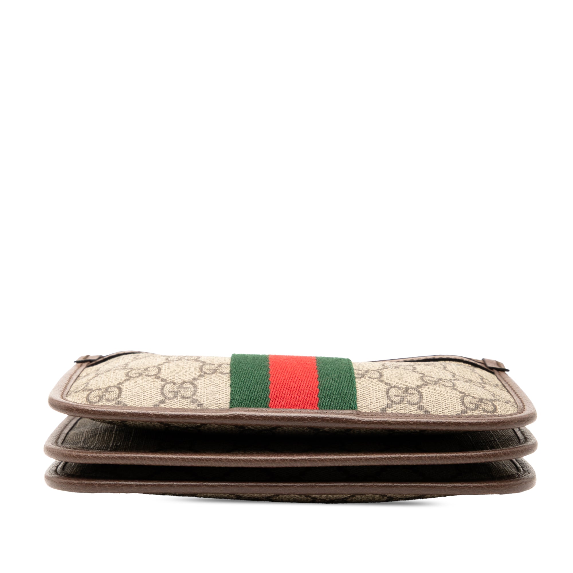 The Ophidia crossbody bag features a coated canvas body with leather trim, a flat leather strap, and top zip and snap closure compartments. Inclusion: Dust bag, box. Retail Price: 945.00
