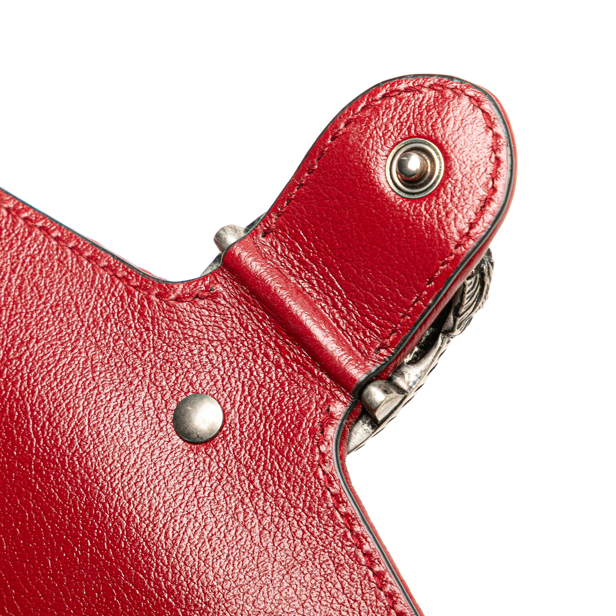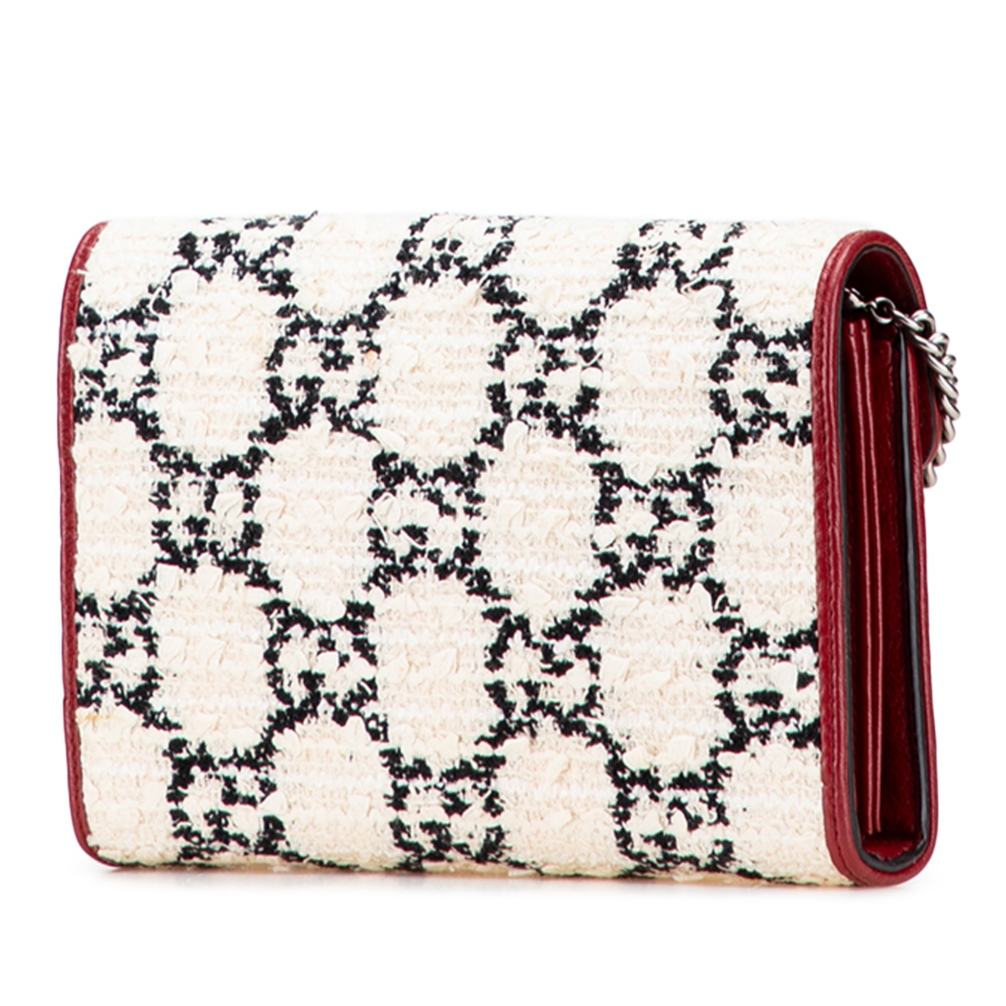 The Dionysus features a tweed body with leather trim, a silver-tone chain strap, a top flap with push-lock closure and tiger-head spur embellishment, an interior zip compartment, and interior slip pockets. Retail Price: 1800.00