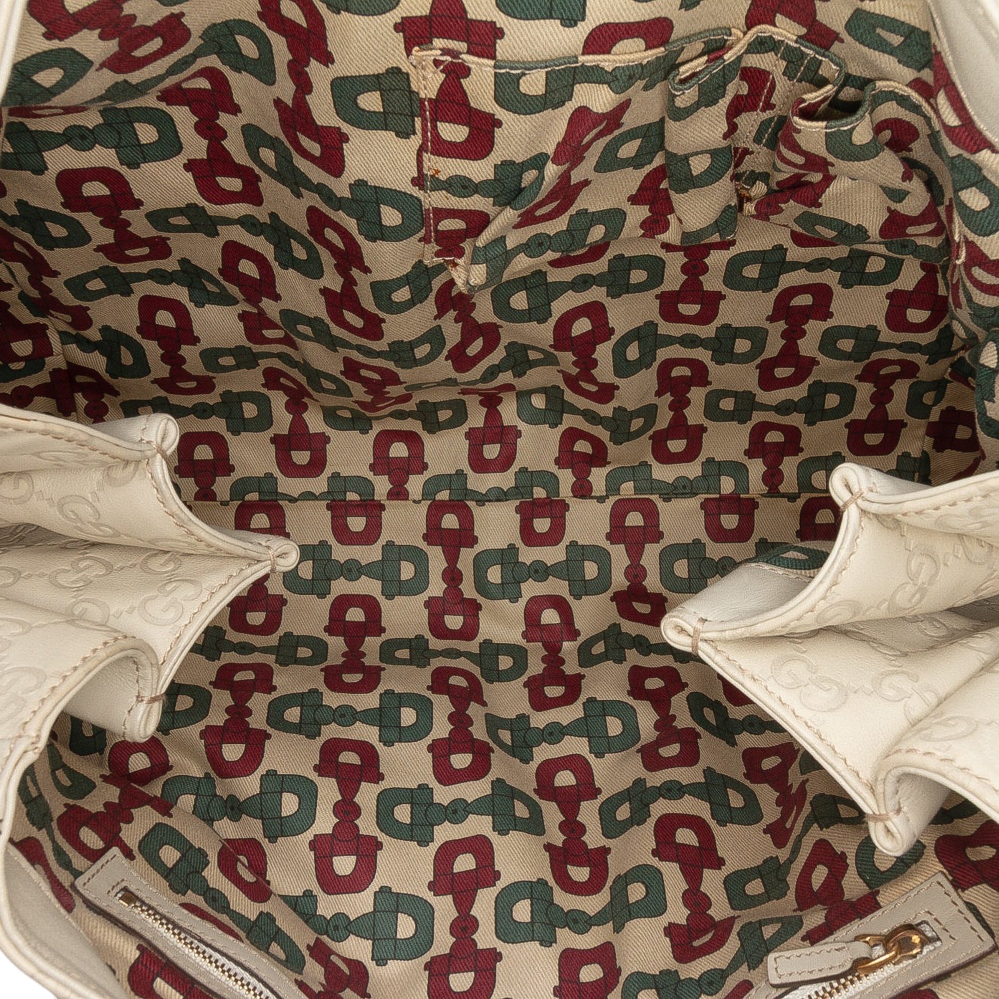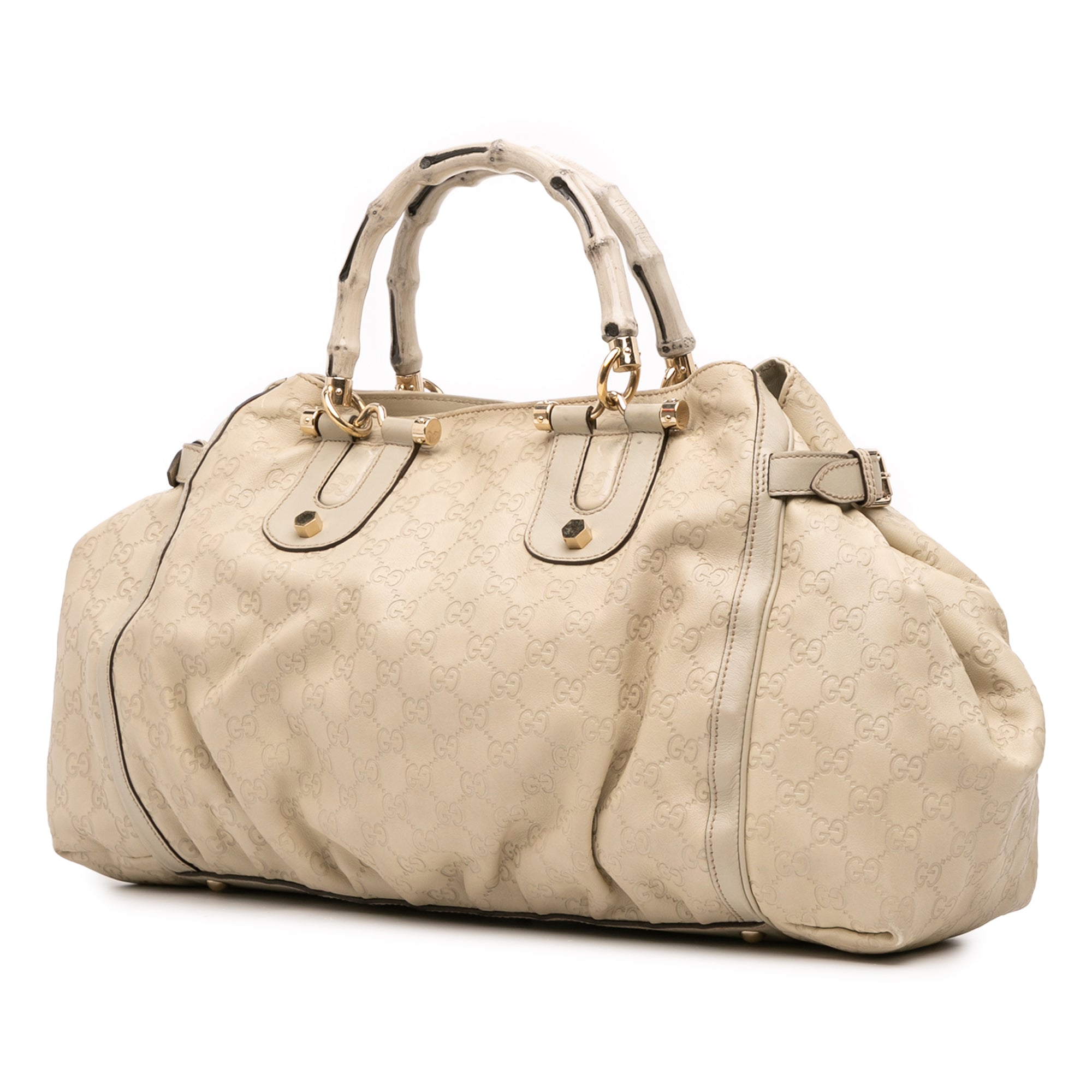 The Dialux Pop features an embossed leather body with side belt details, bamboo top handles, an open top, and interior zip and slip pockets. Retail Price: 1895.00