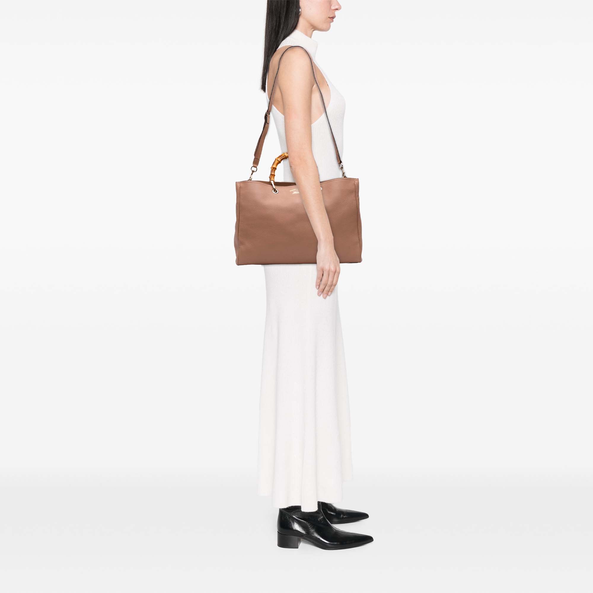 The Bamboo Shopper features a leather body, bamboo top handles, a detachable flat leather strap, an open top with a magnetic closure, an interior zip compartment, and interior zip and slip pockets. Retail Price: 2550.00