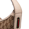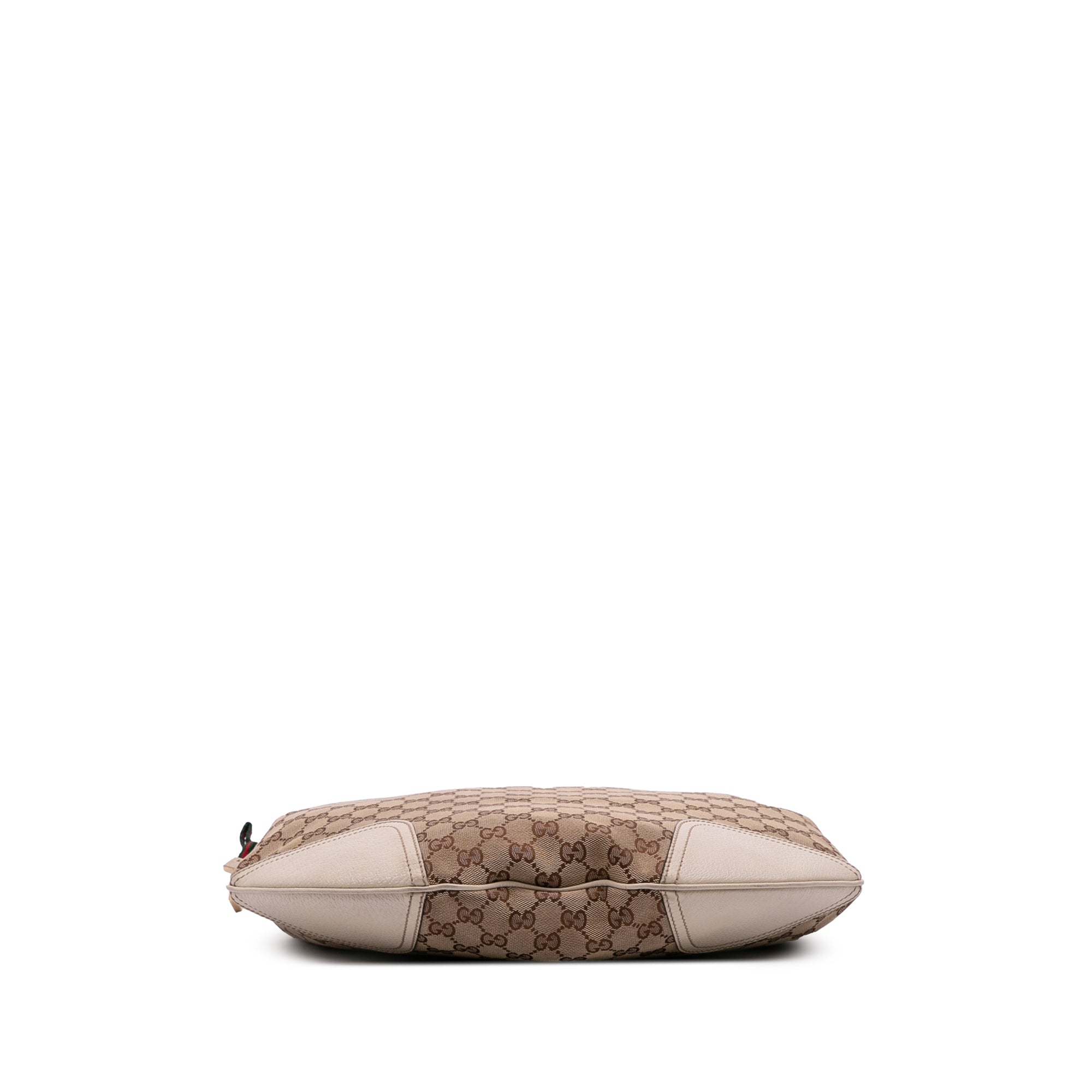 This hobo bag features a canvas body with leather trim, a flat leather strap, a top zip closure, and interior zip and slip pockets. Retail Price: 760.00