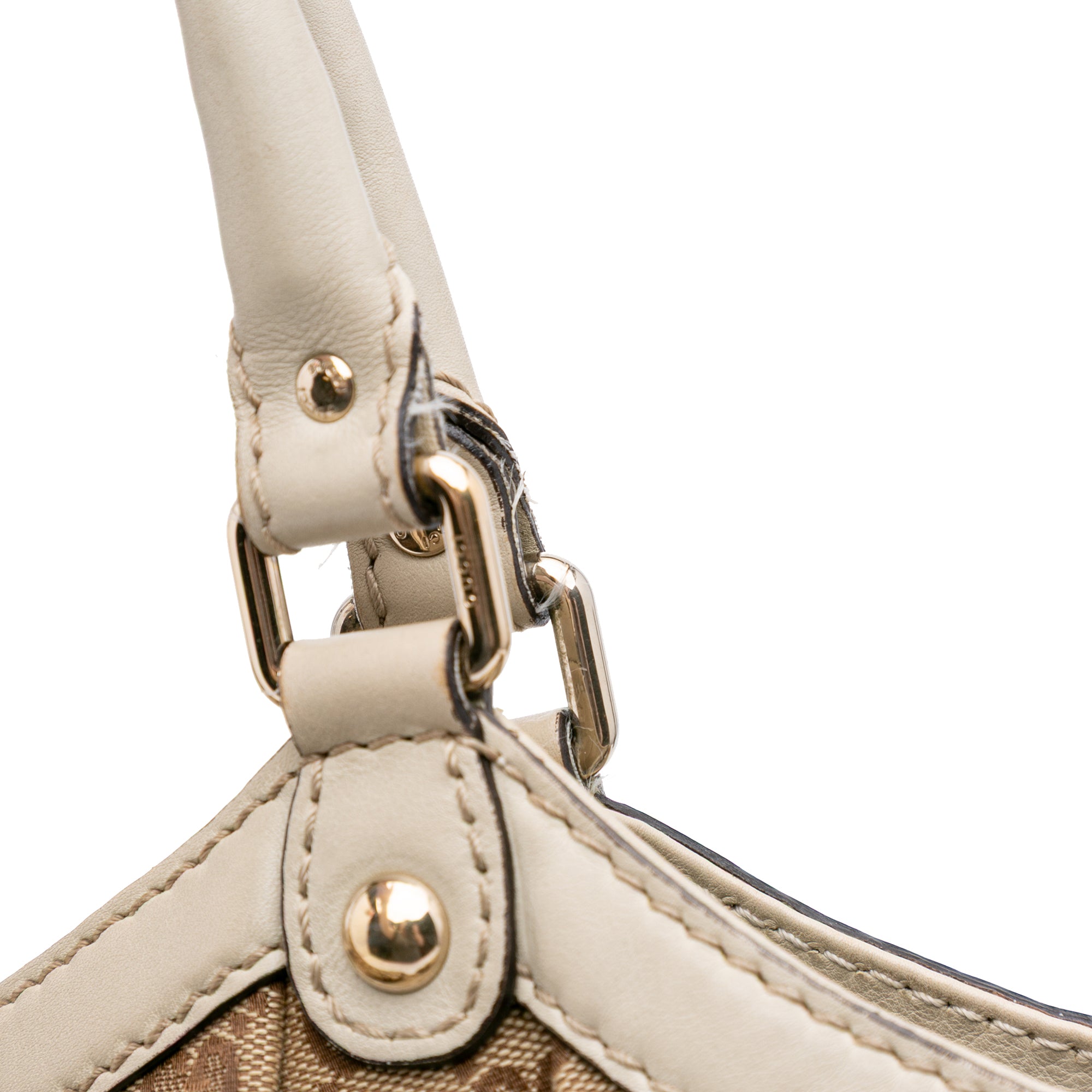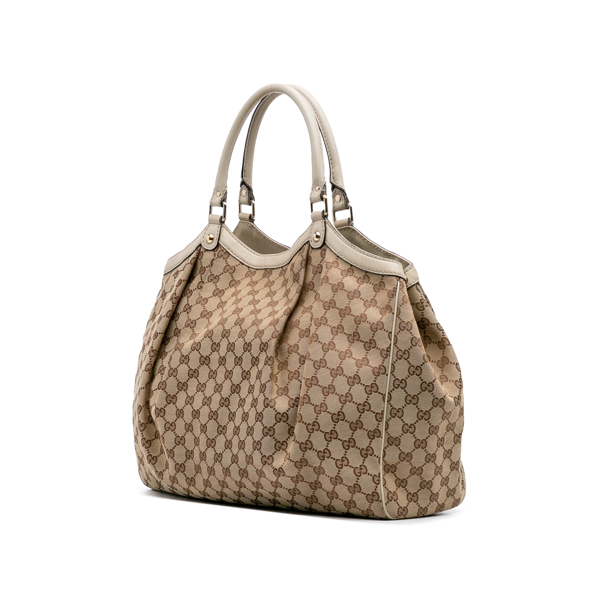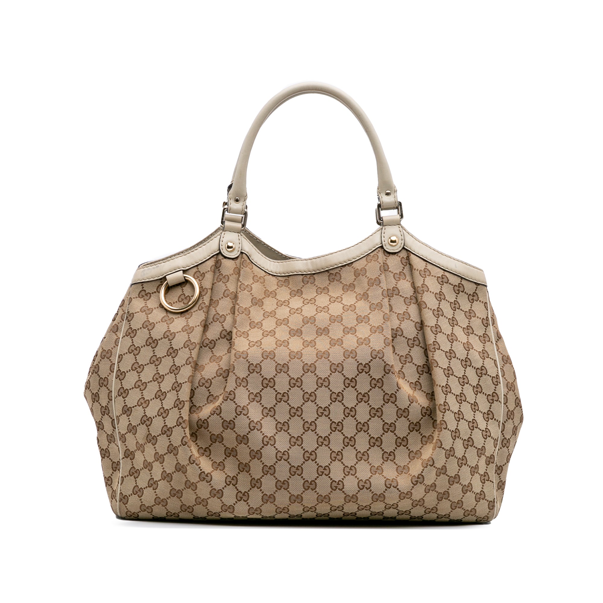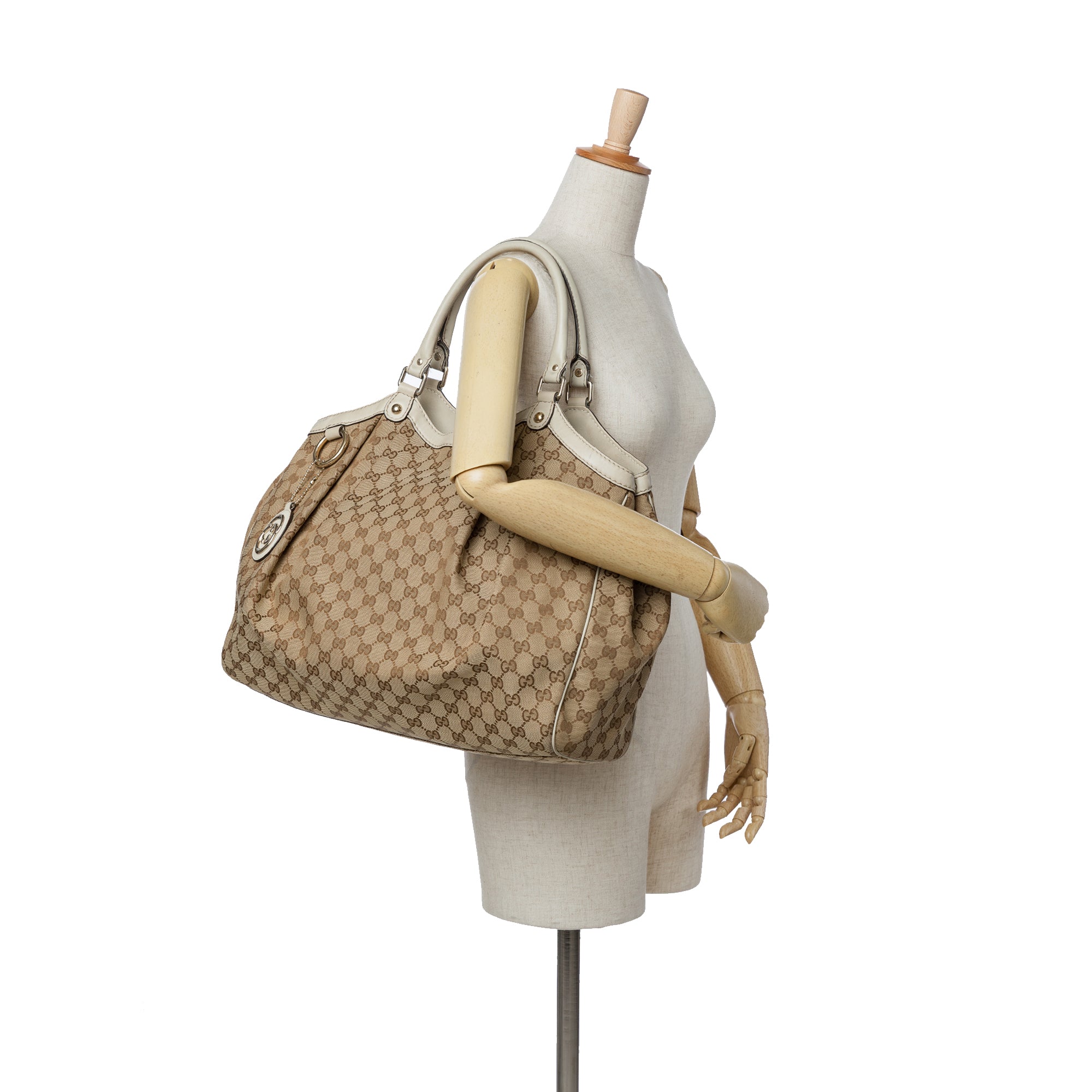 The Sukey tote bag features a canvas body with leather trim, rolled leather handles, an open top with magnetic snap closure, and an interior zip pocket. Retail Price: 900.00