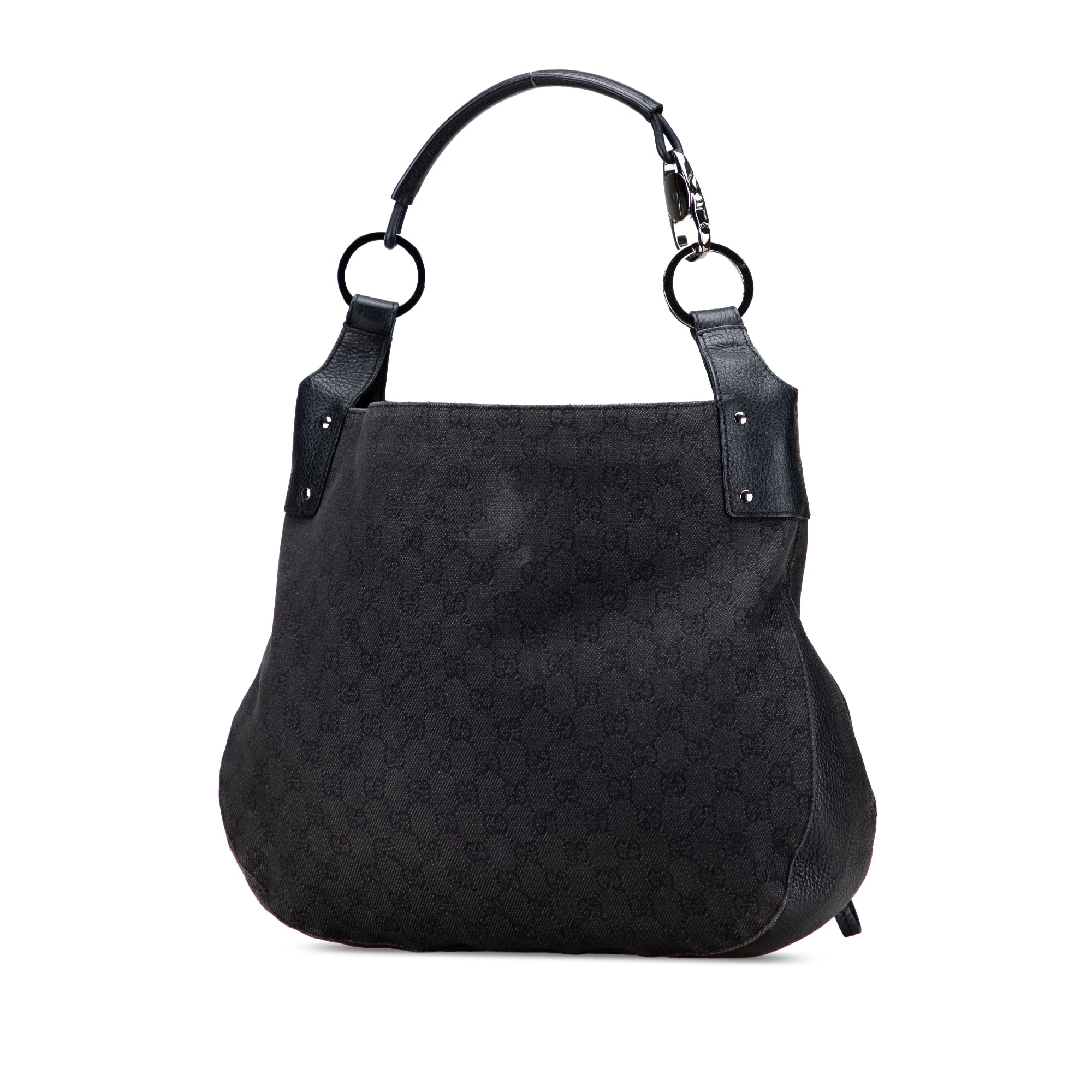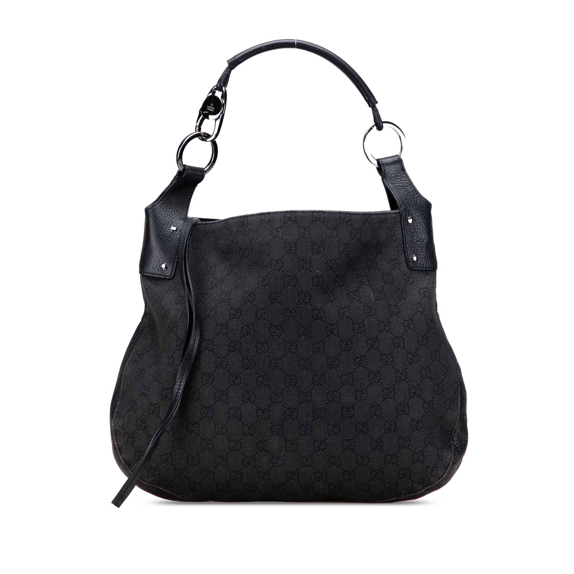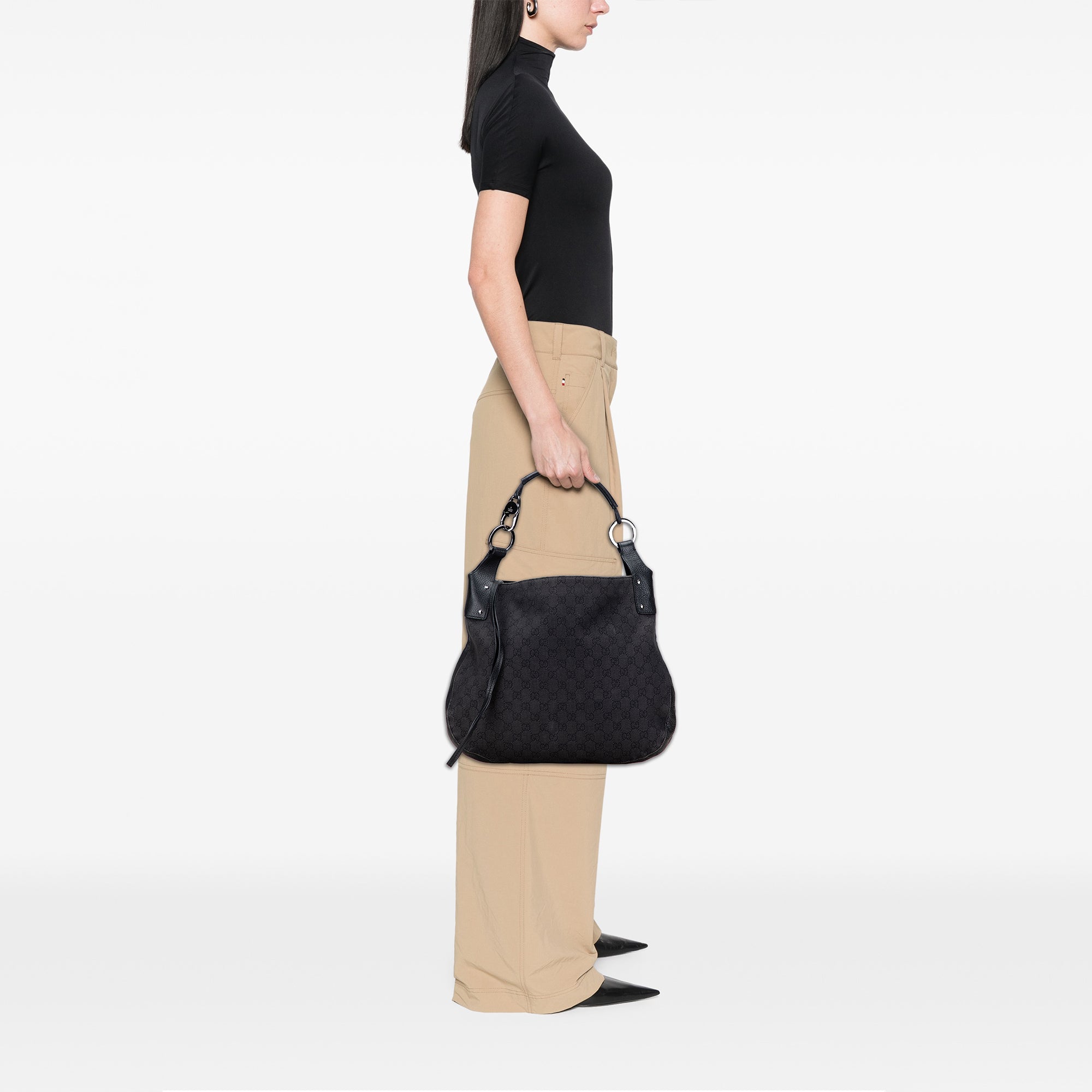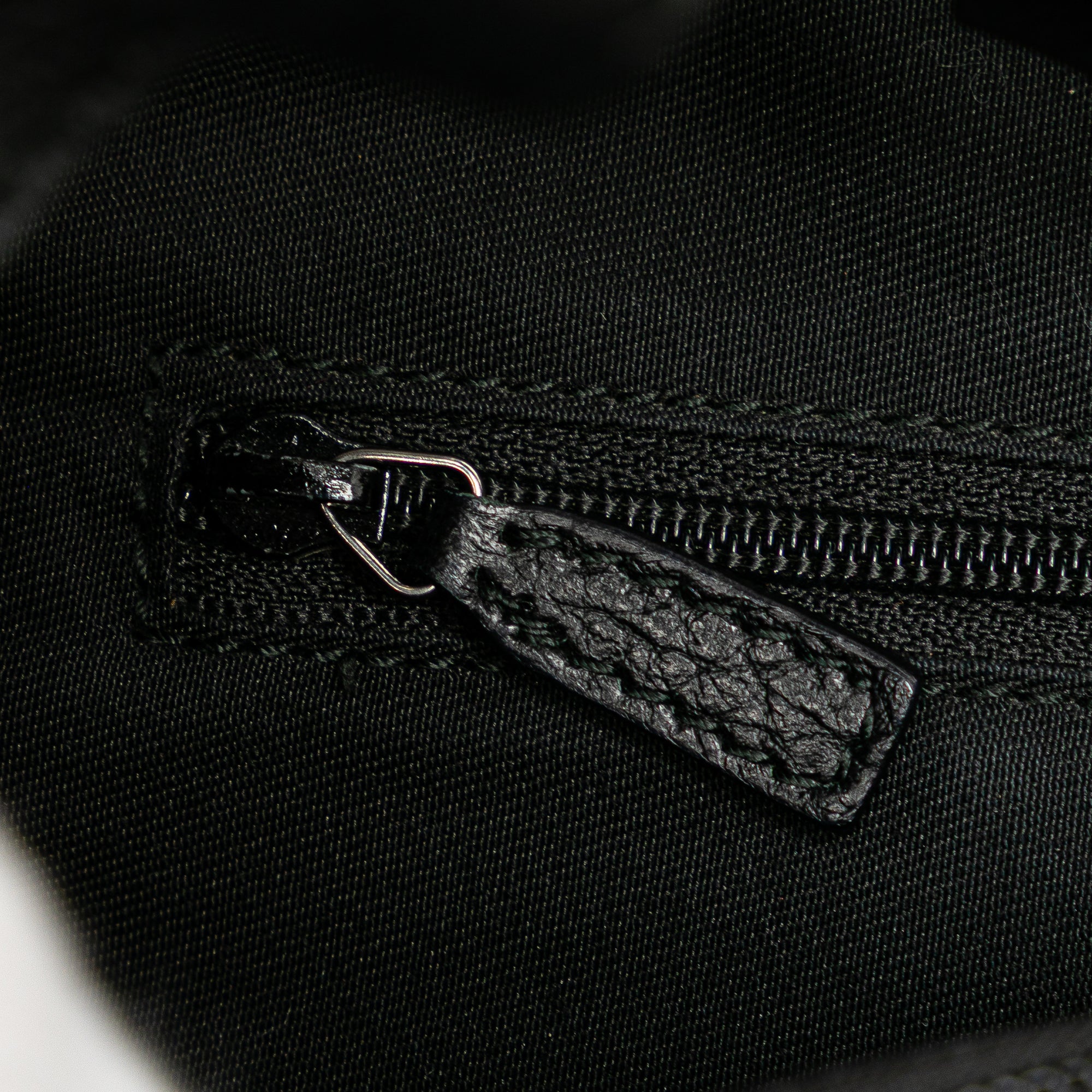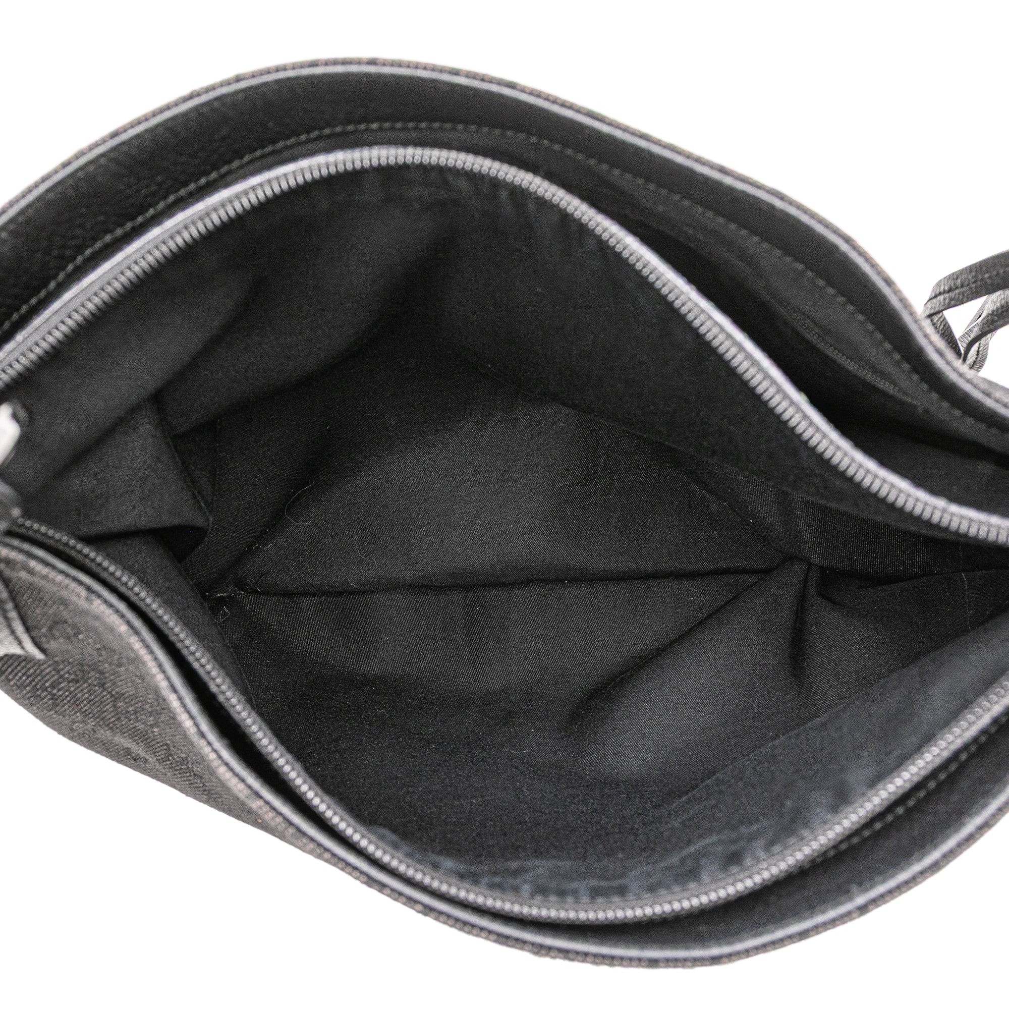 This hobo bag features a denim body with leather trim, a rolled leather handle, an open top, an interior center zip compartment, and an interior zip pocket. Retail Price: 870.00