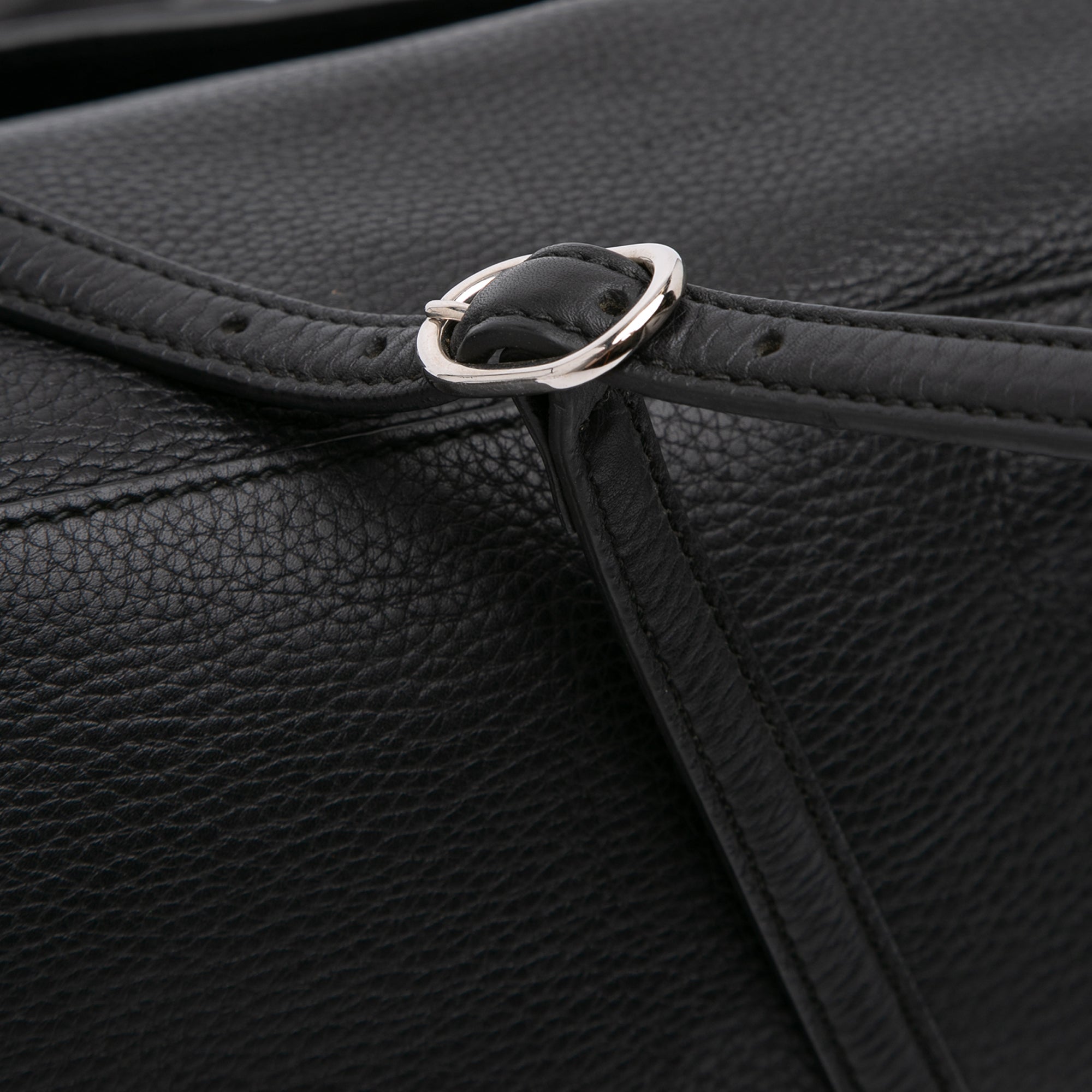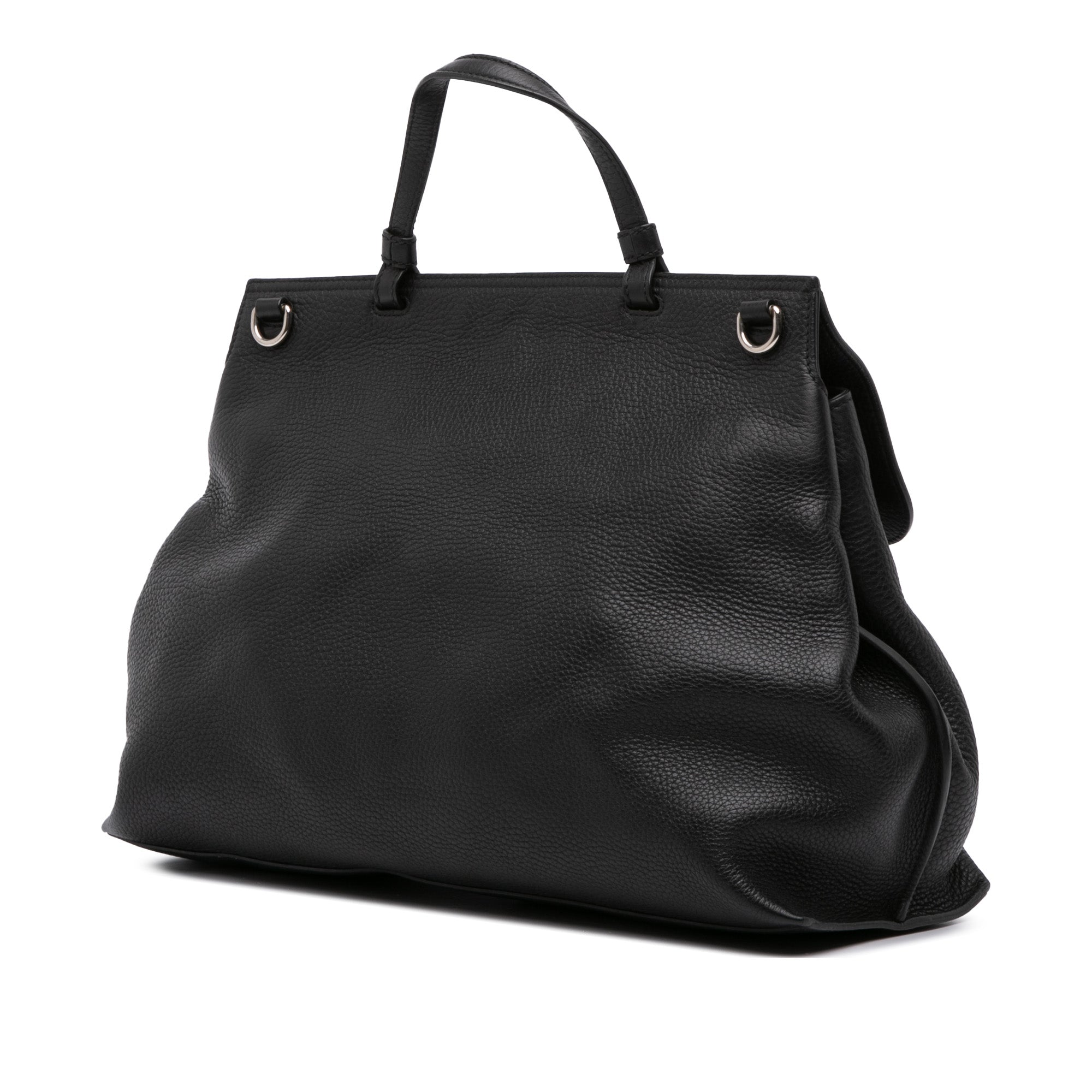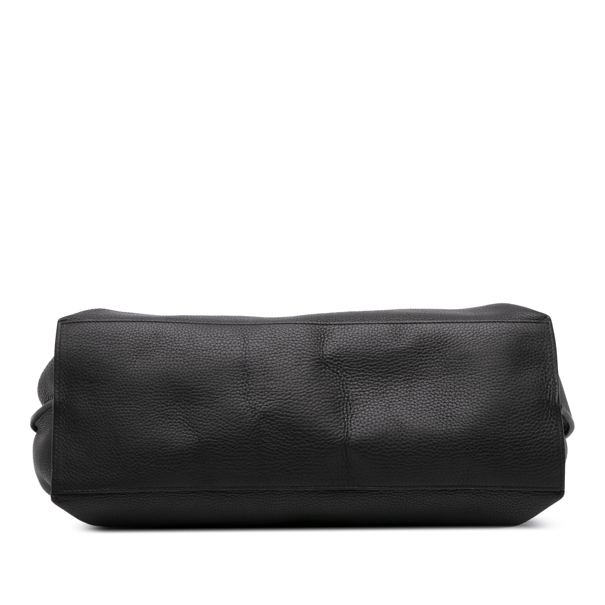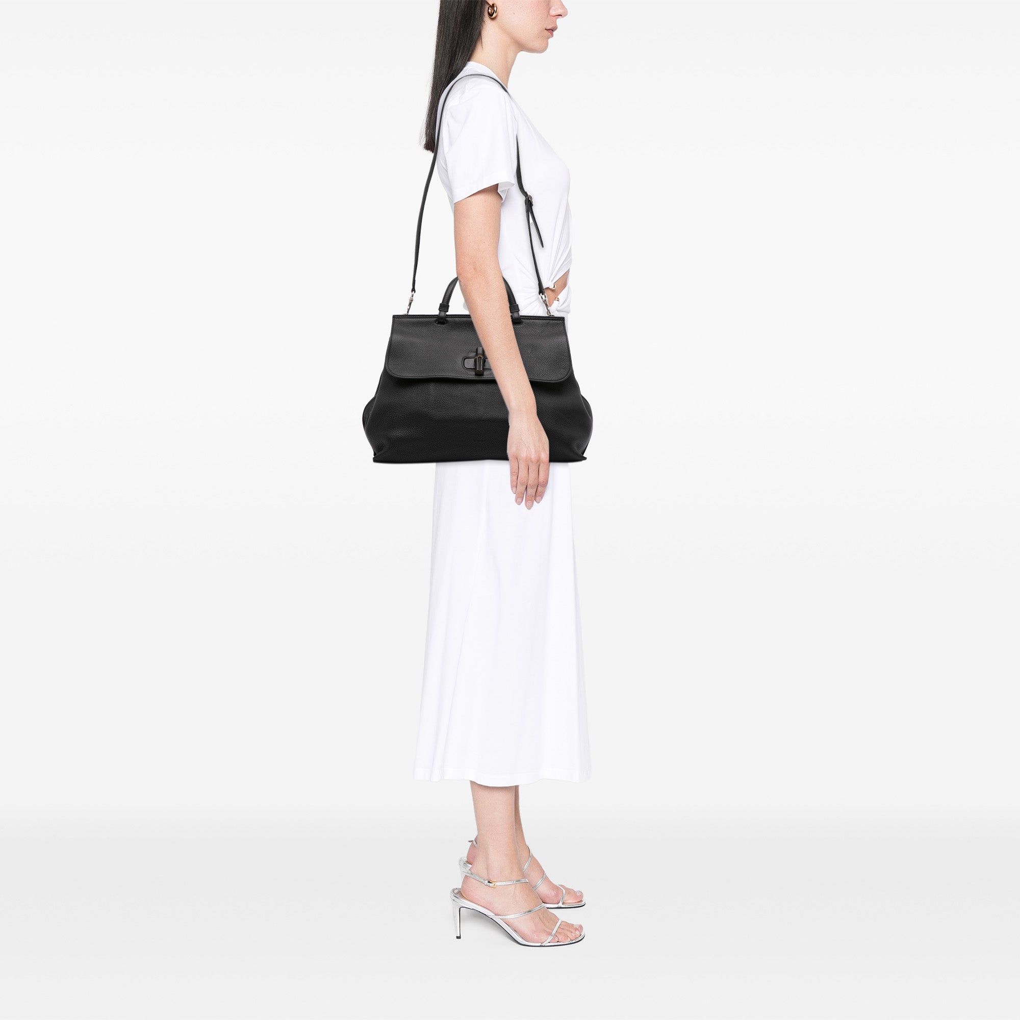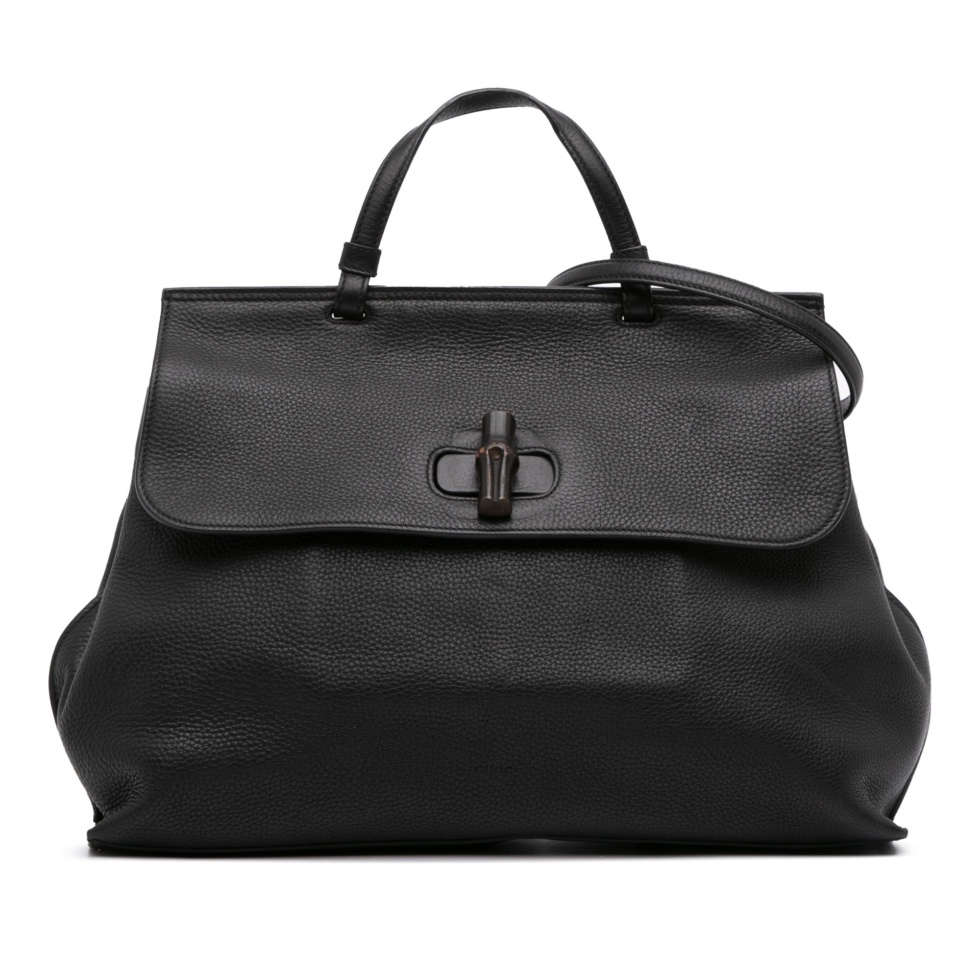 The Large Bamboo Daily Satchel features a leather body, a flat leather top handle, a detachable flat strap, a top flap with a bamboo twist lock closure, and interior zip and slip pockets. Retail Price: 2450.00