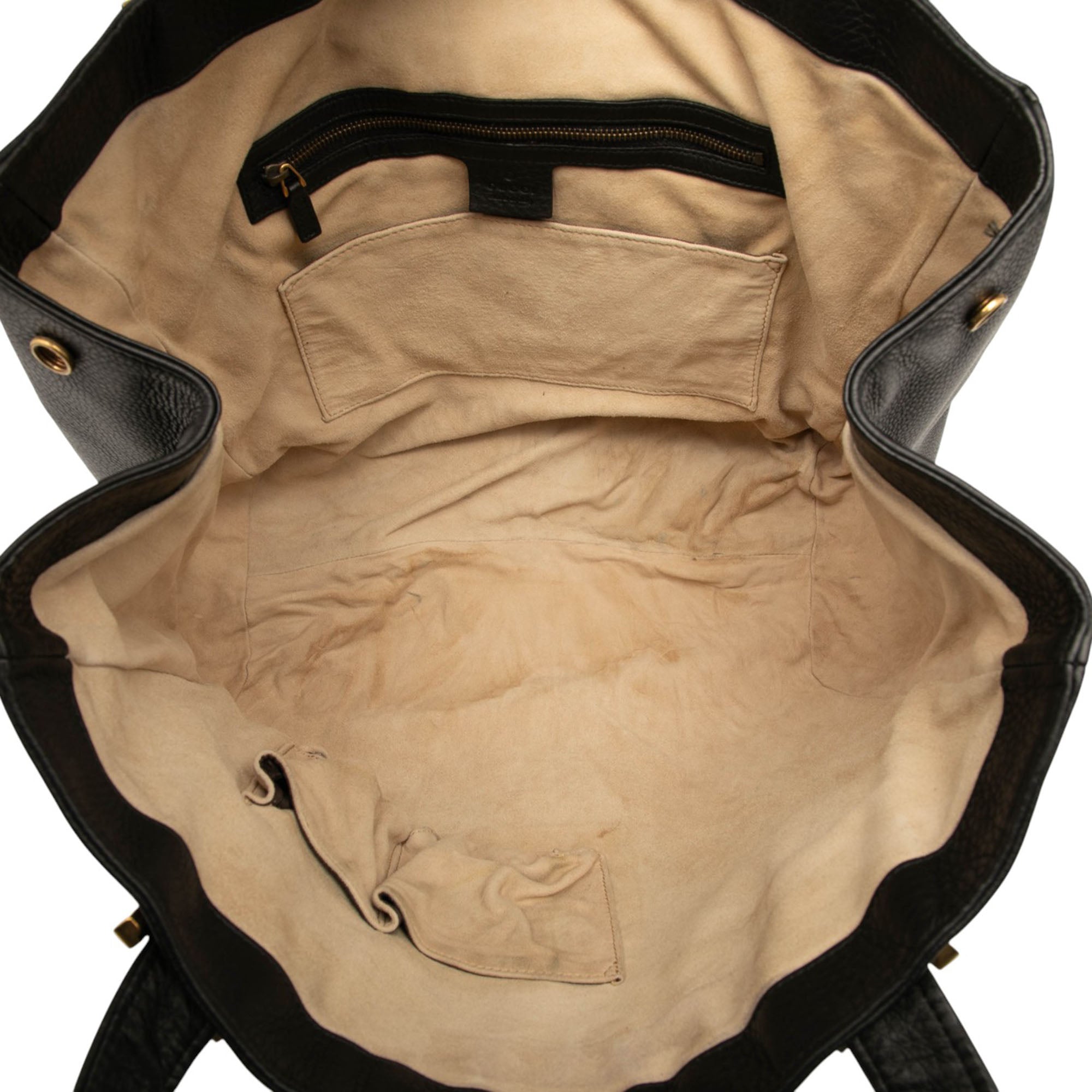 The 1973 tote bag features a leather body, flat straps, a top strap with a gold-tone double G detail and magnetic closure, and interior zip and slip pockets. Retail Price: 990.00