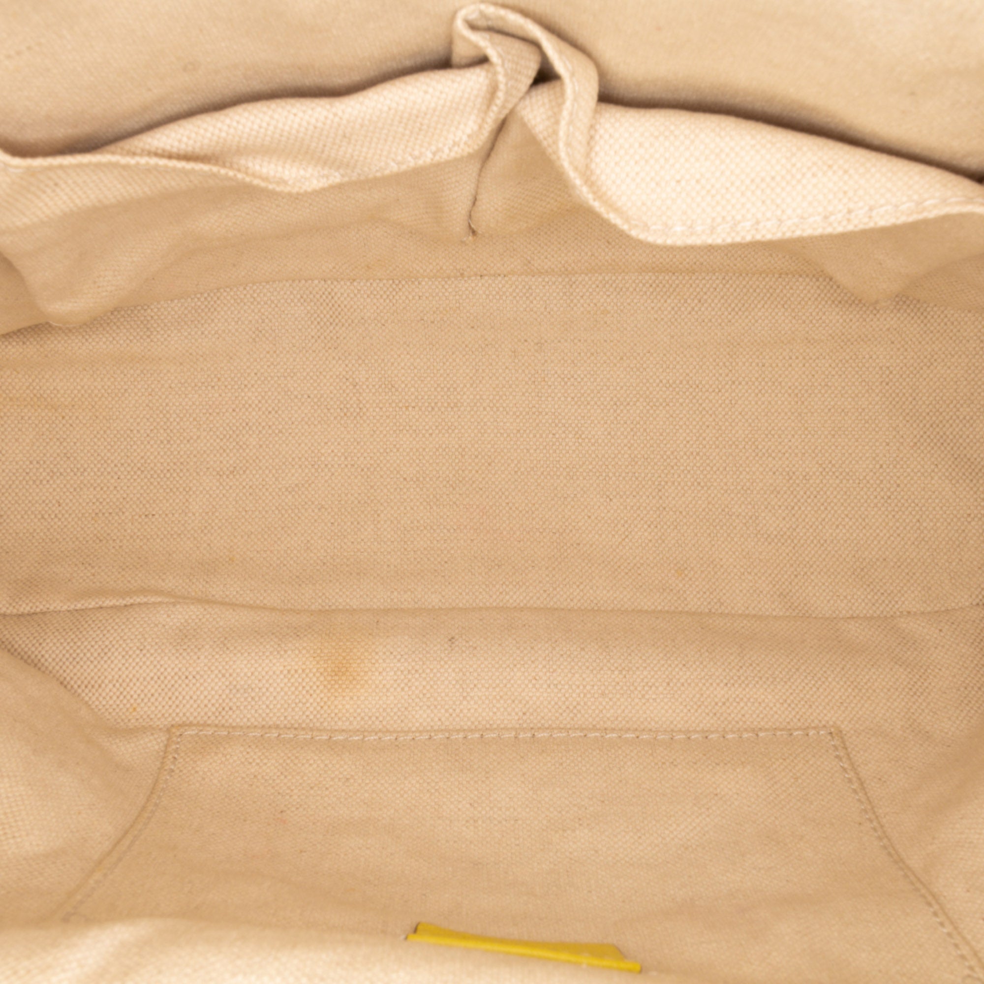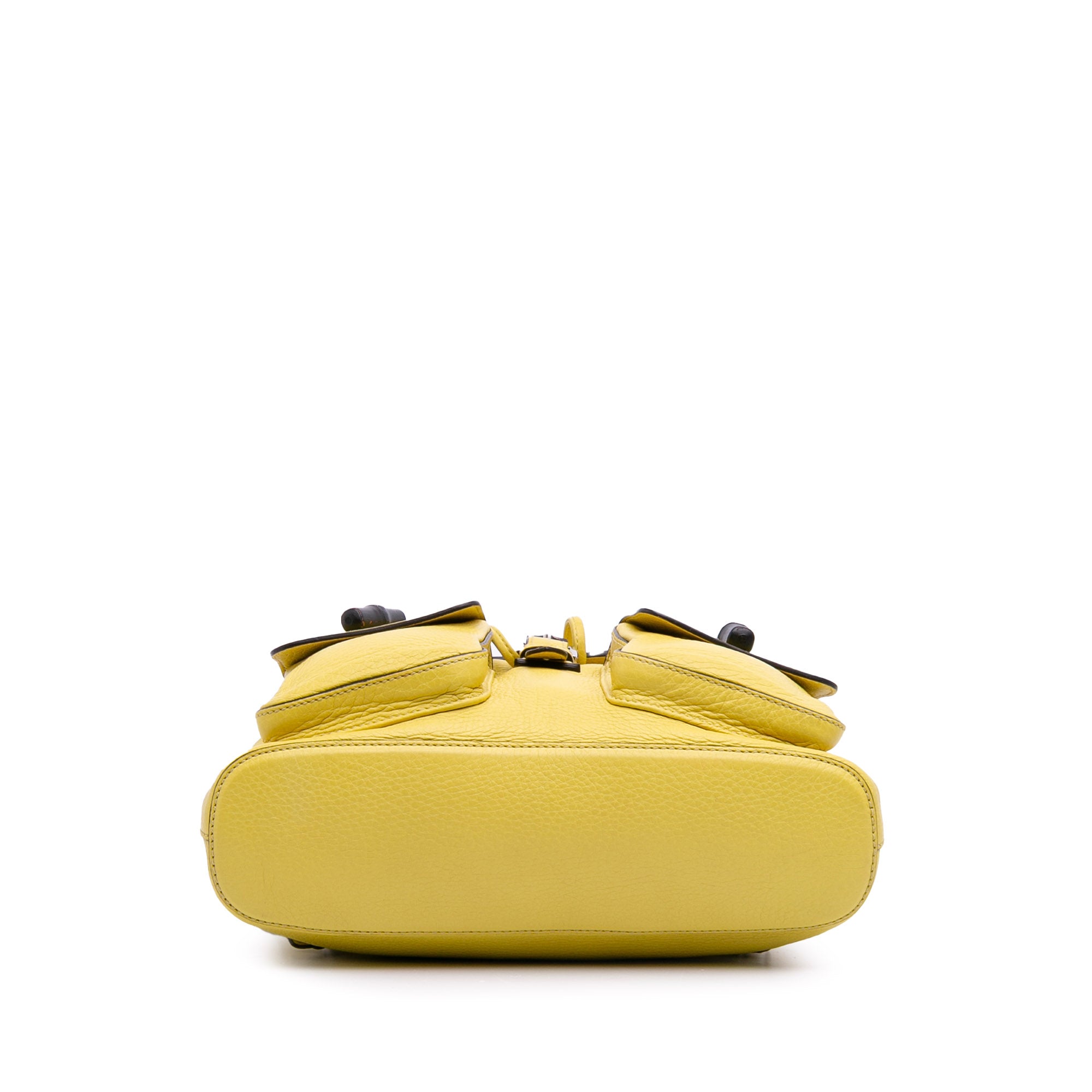 This backpack features a leather body, a bamboo top handle, adjustable flat leather back straps, a top drawstring closure with tassel pulls, a front flap with buckle closure, exterior flap pockets with bamboo turn-lock closures, and interior slip pockets. Retail Price: 2590.00