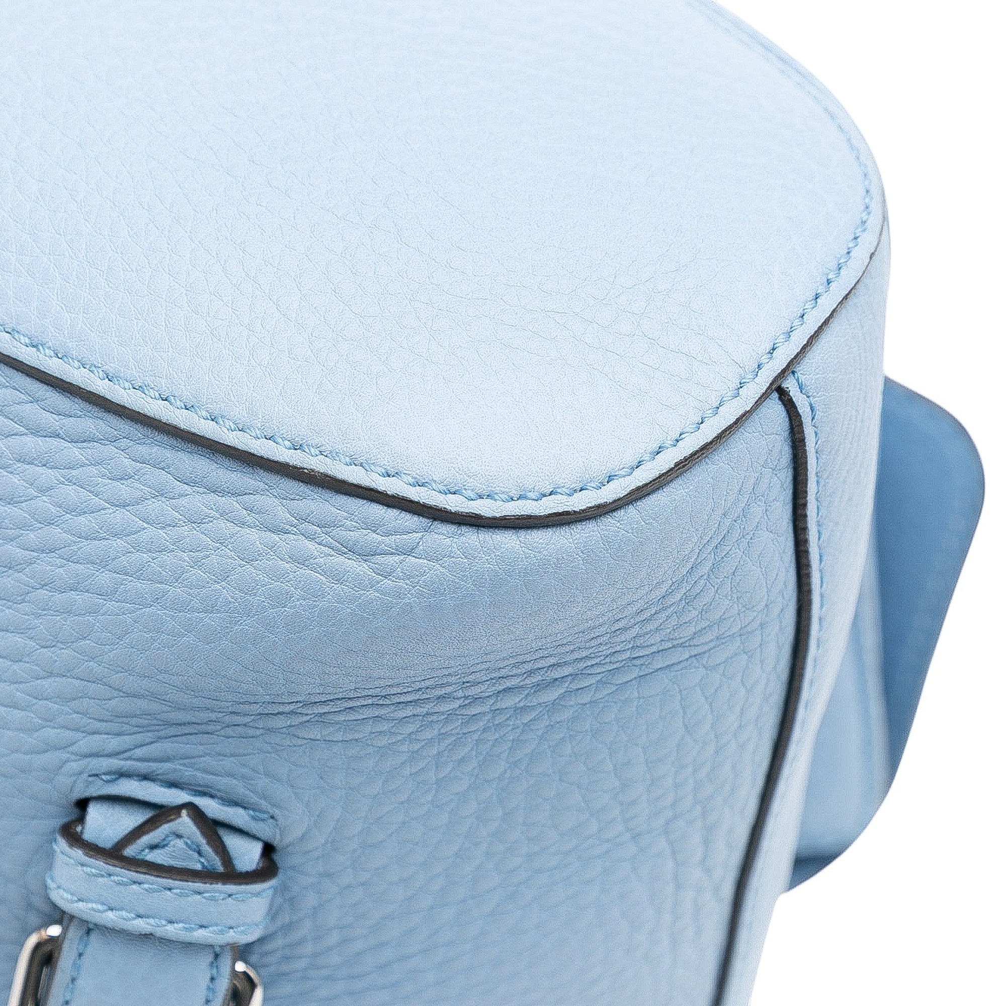 This backpack features a leather body, a bamboo top handle, adjustable flat leather back straps, a front flap with buckle closure, a top drawstring closure with tassel pulls, exterior flap pockets with bamboo turn-lock closures, and interior slip pockets. Retail Price: 2590.00