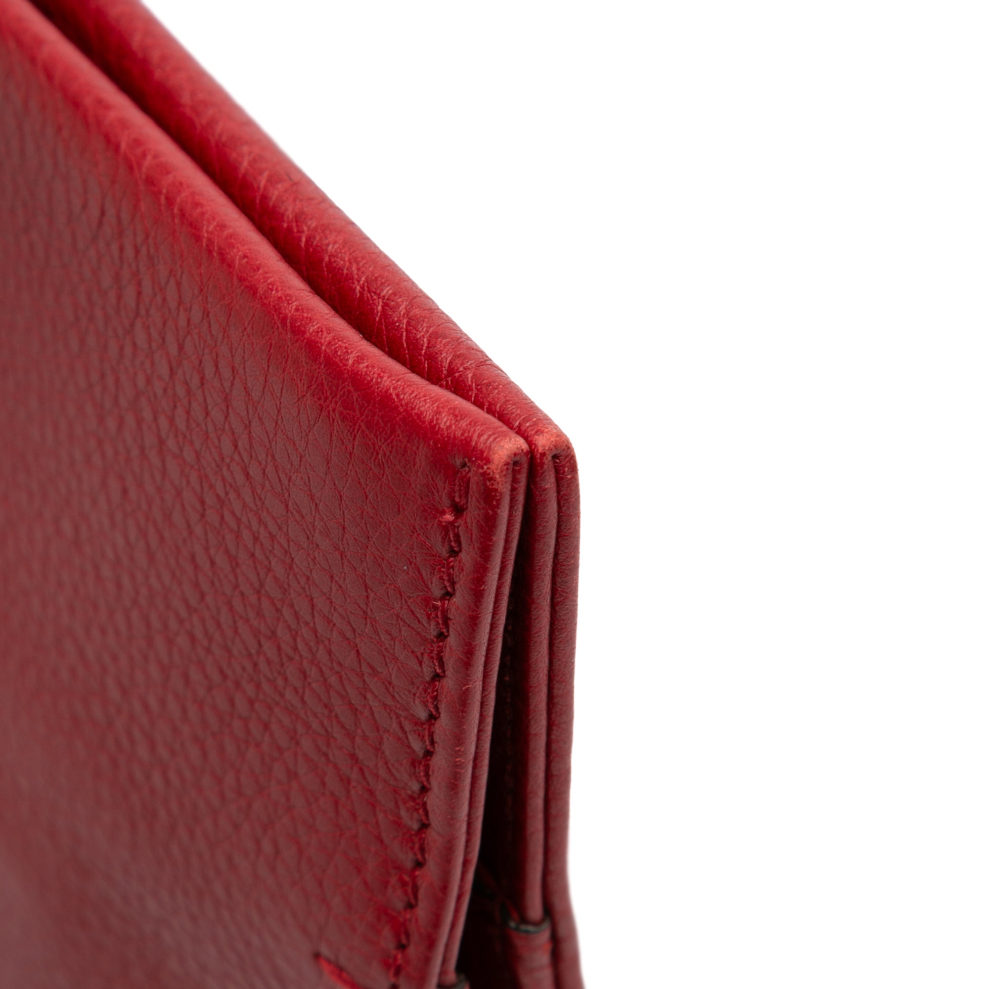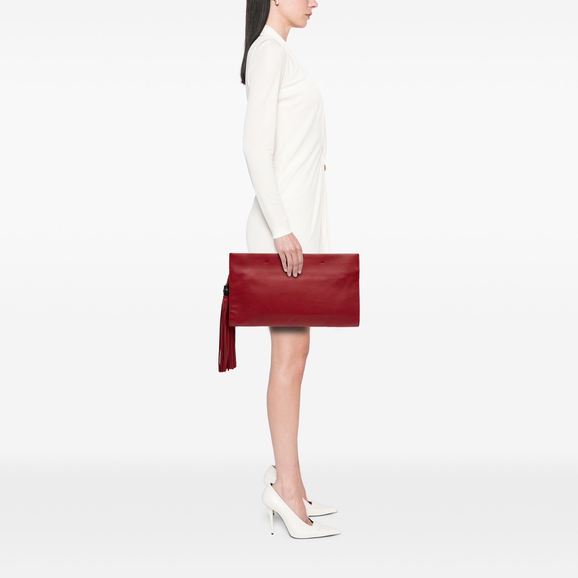 This clutch bag features a leather body with bamboo tassel detail, an open top with magnetic snap closure, and interior zip pockets. Retail Price: 500.00