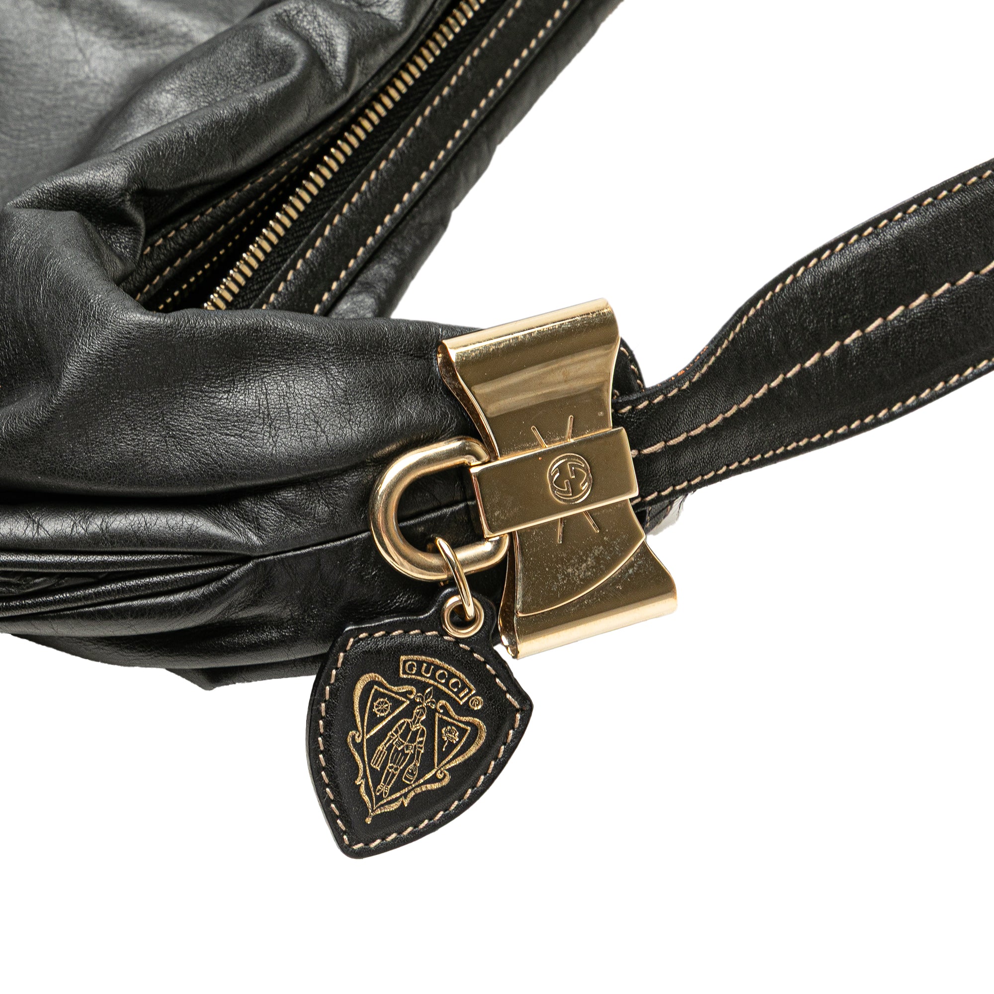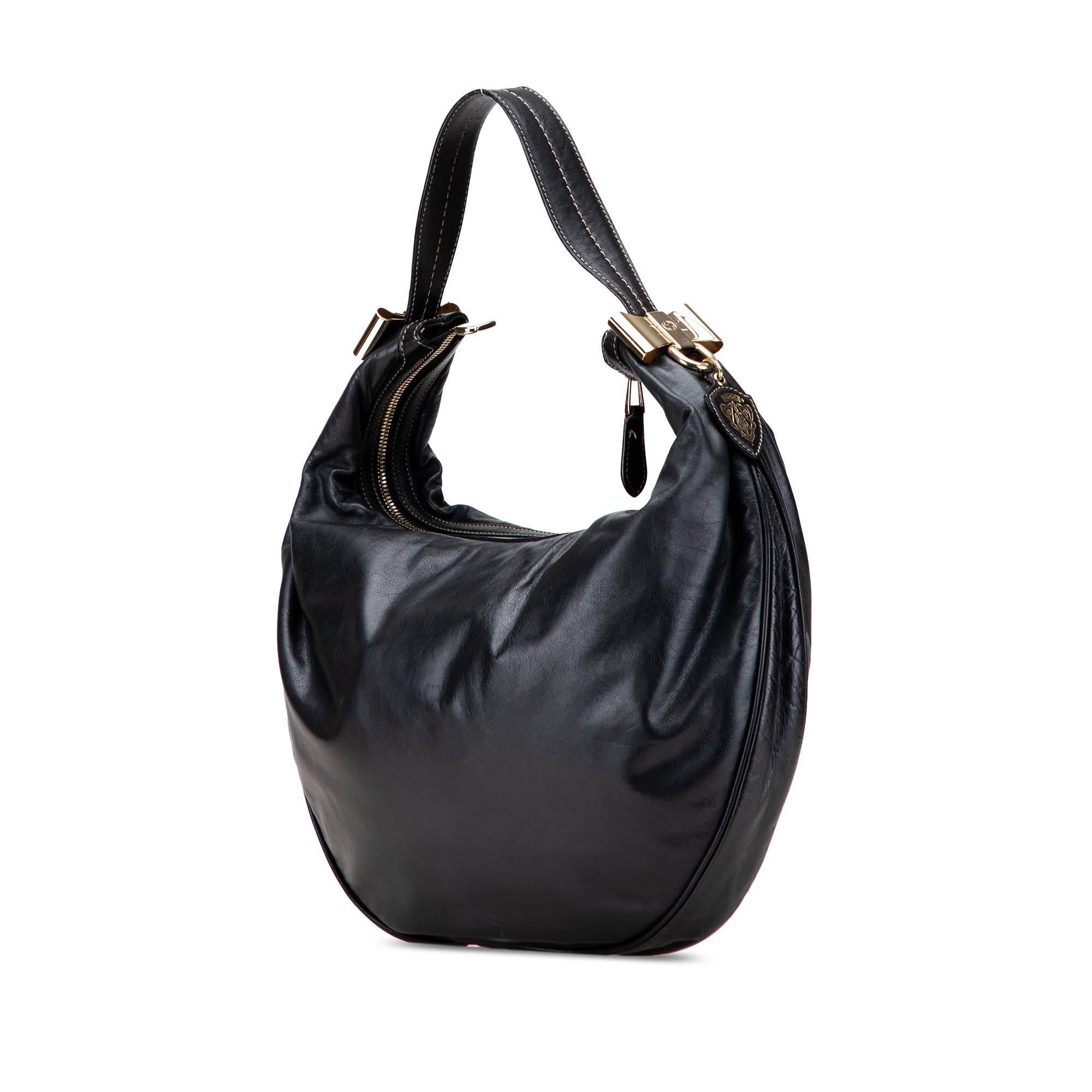 The Duchessa features a leather body, a flat leather strap, gold-tone hardware, a top zip closure, and interior zip and slip pockets. Retail Price: 1190.00