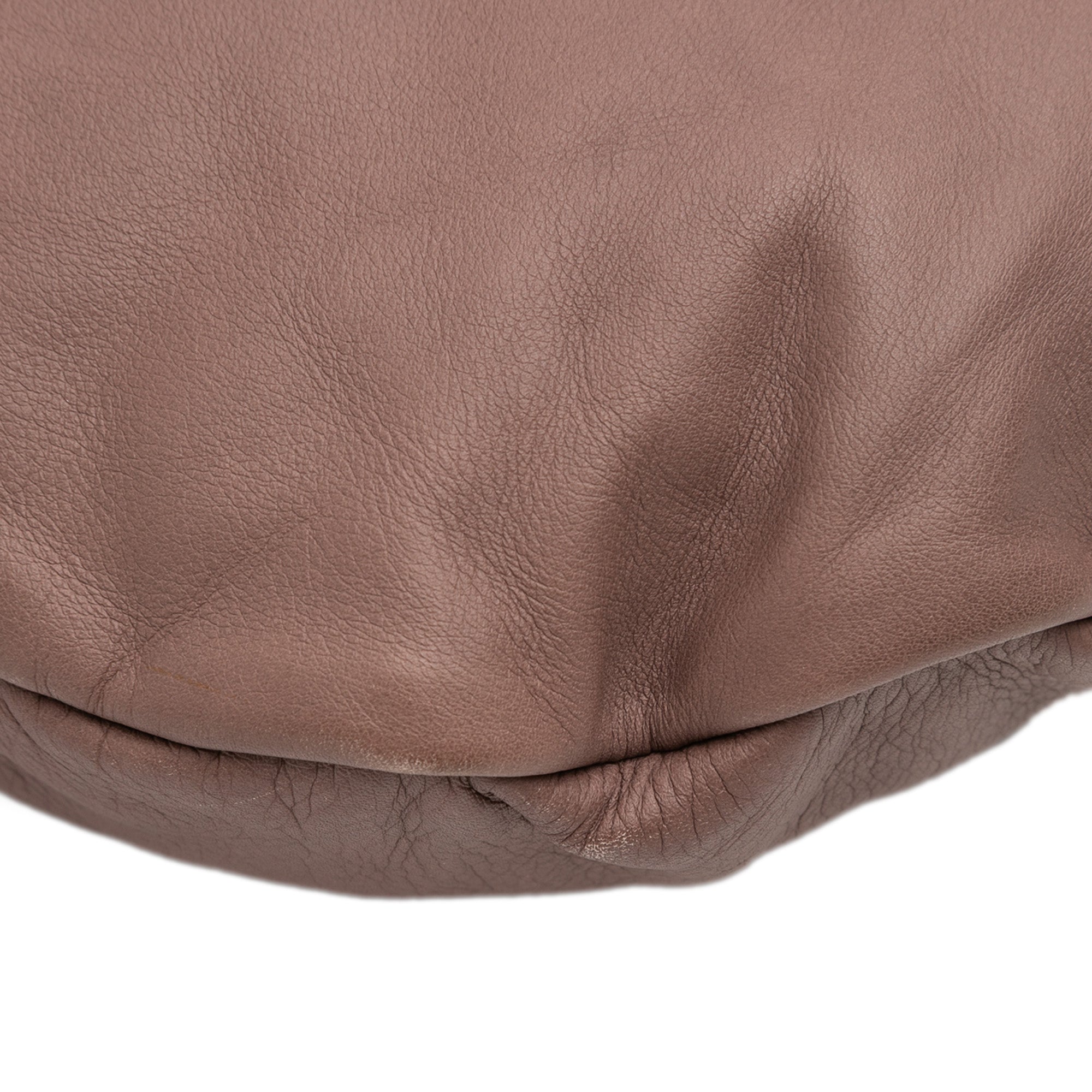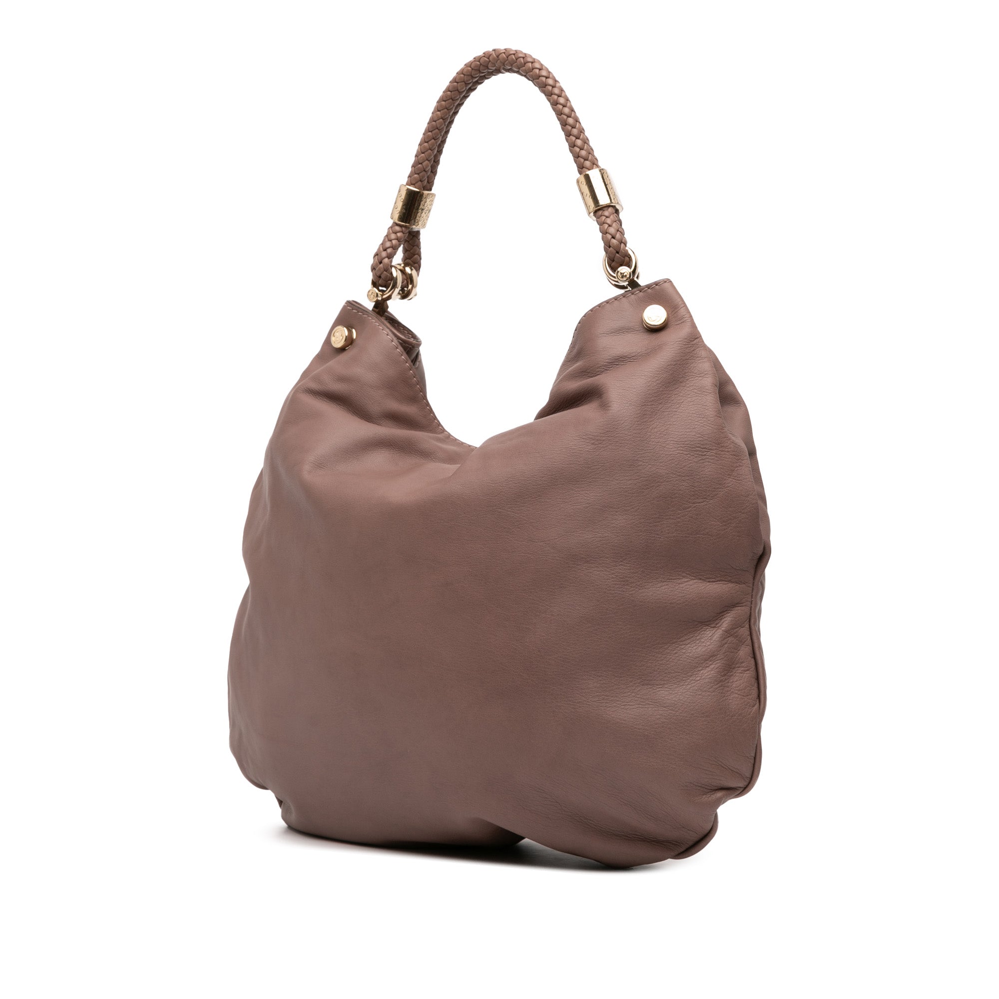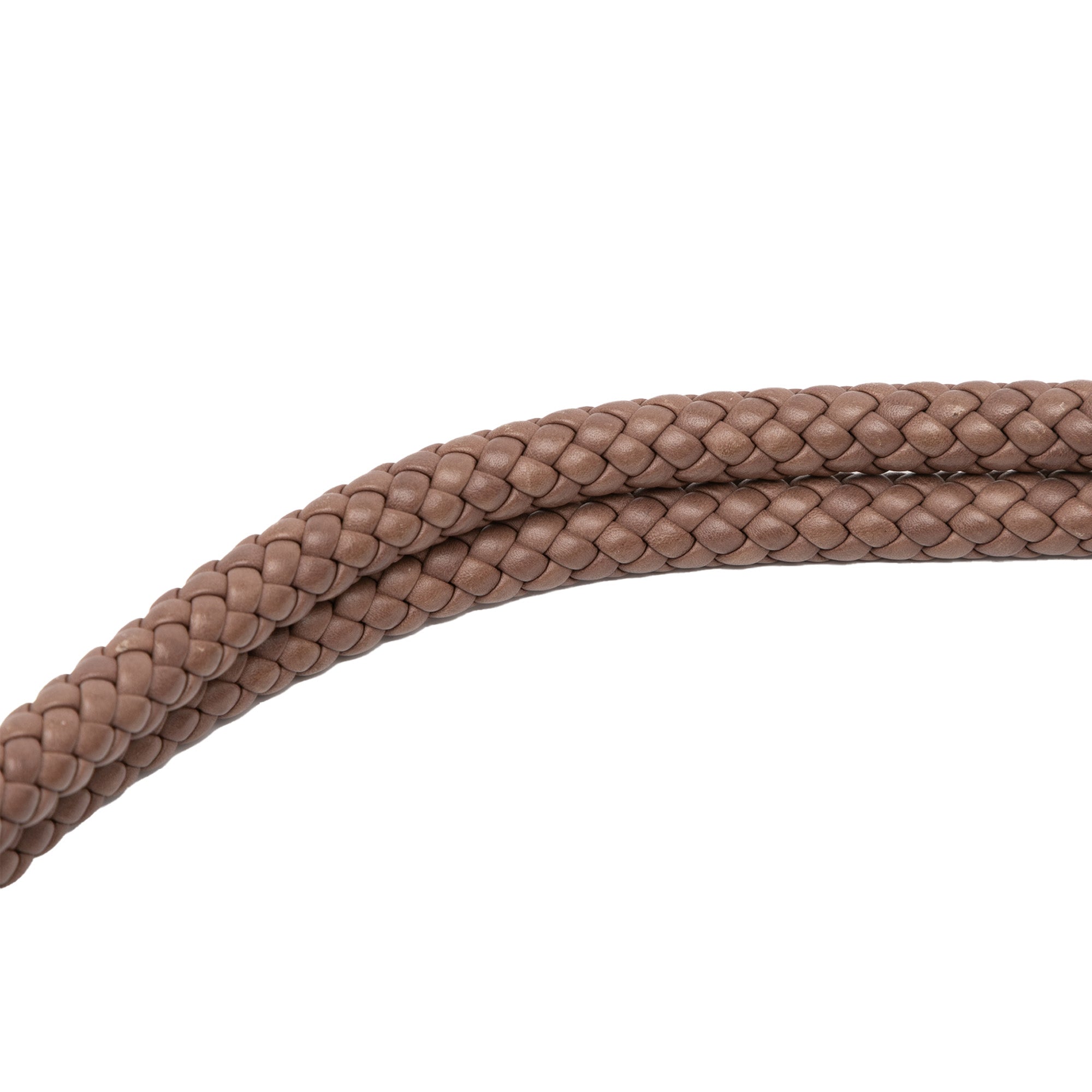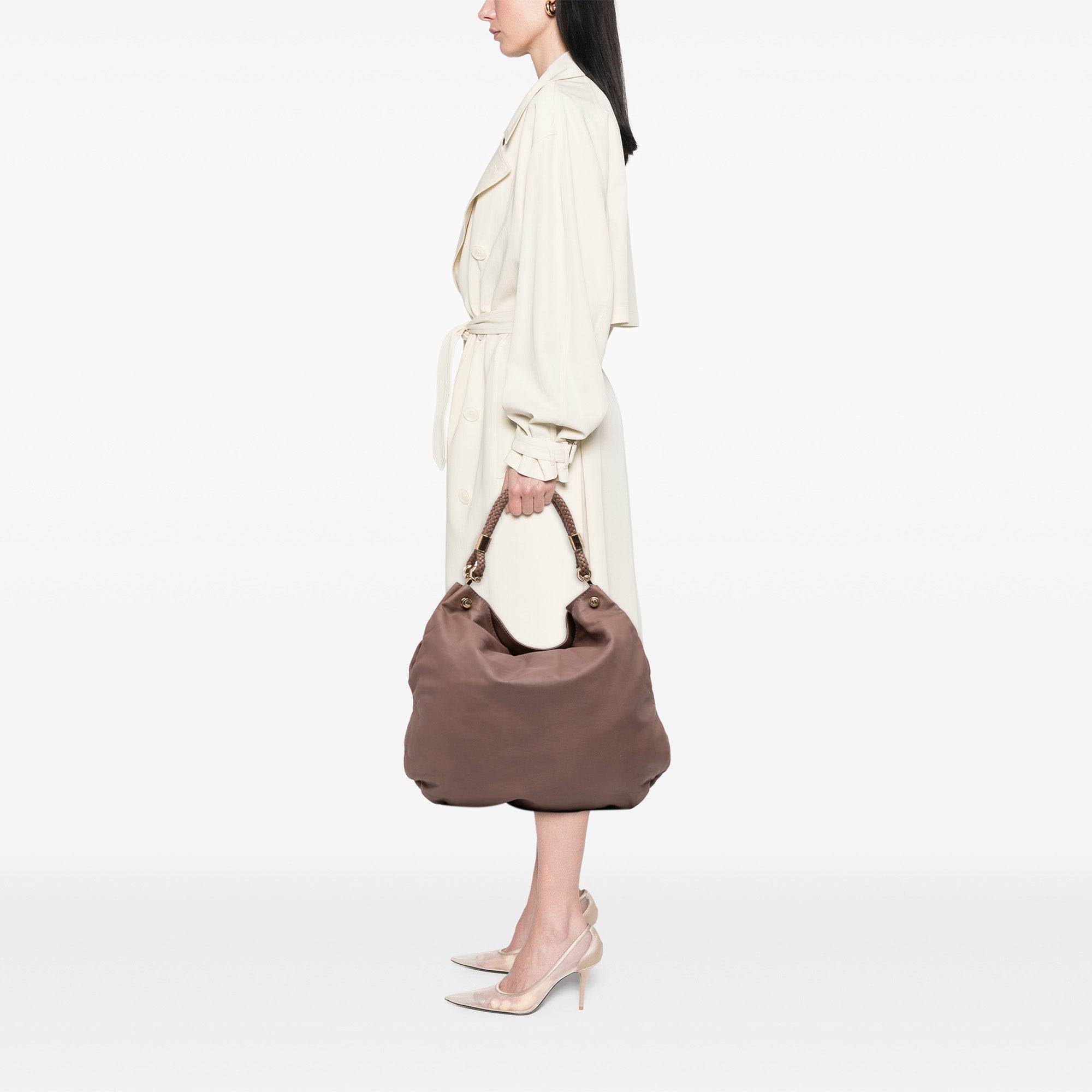 This shoulder bag features a leather body, braided leather handle, an open top, and an interior zip pocket. Retail Price: 1500.00