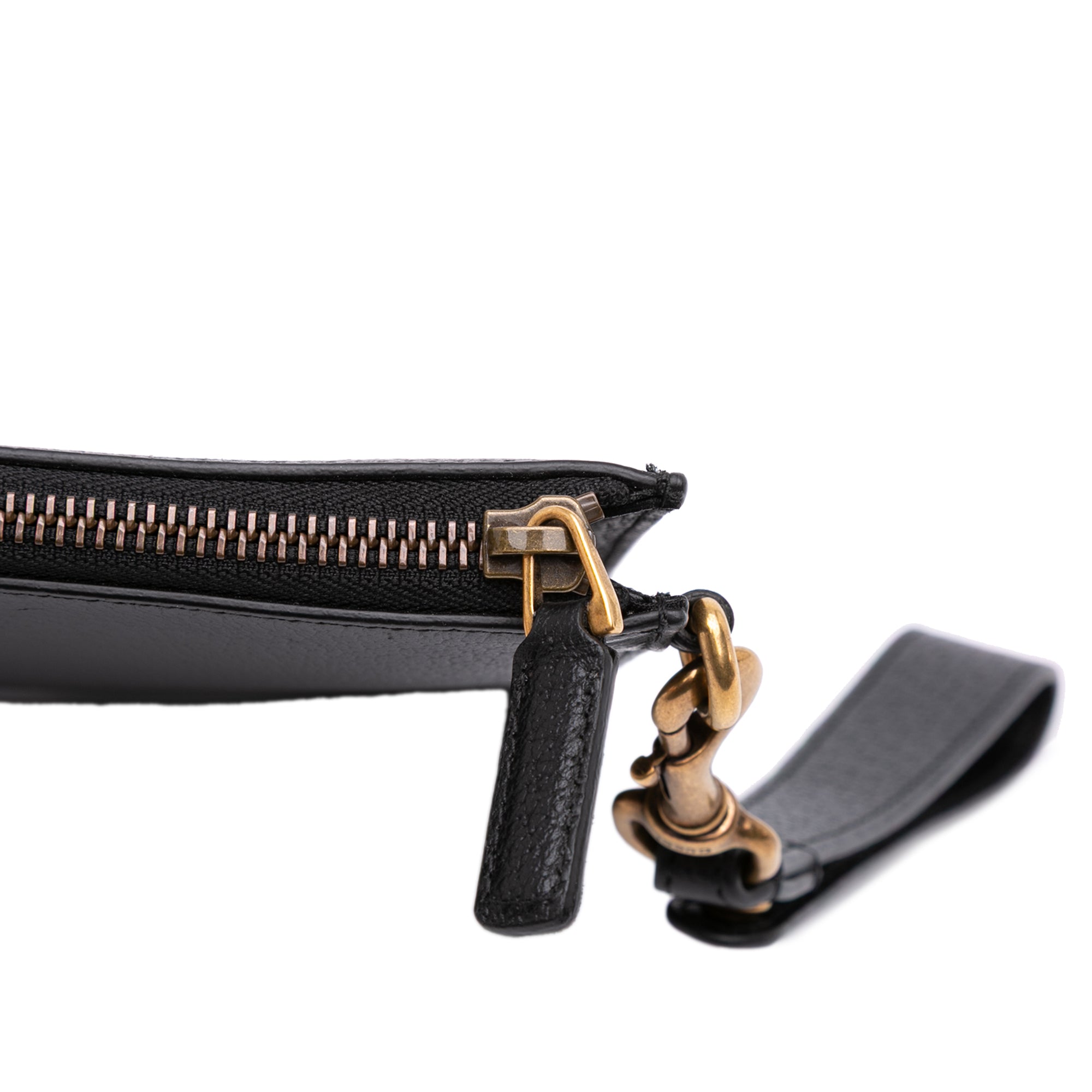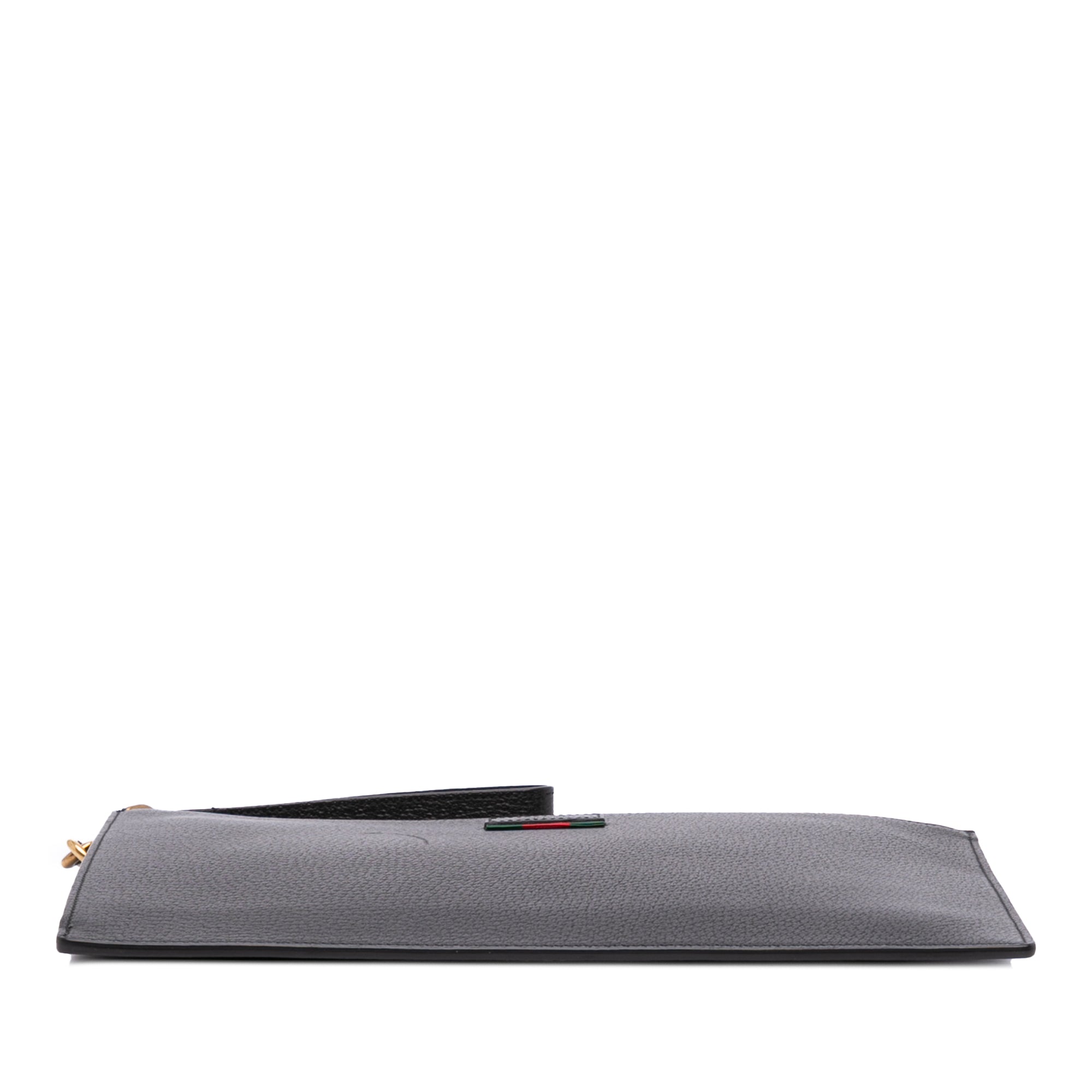 This clutch bag features a leather body, a detachable flat leather wrist strap, a top zip closure, and interior slip pocket. Retail Price: 1294.00