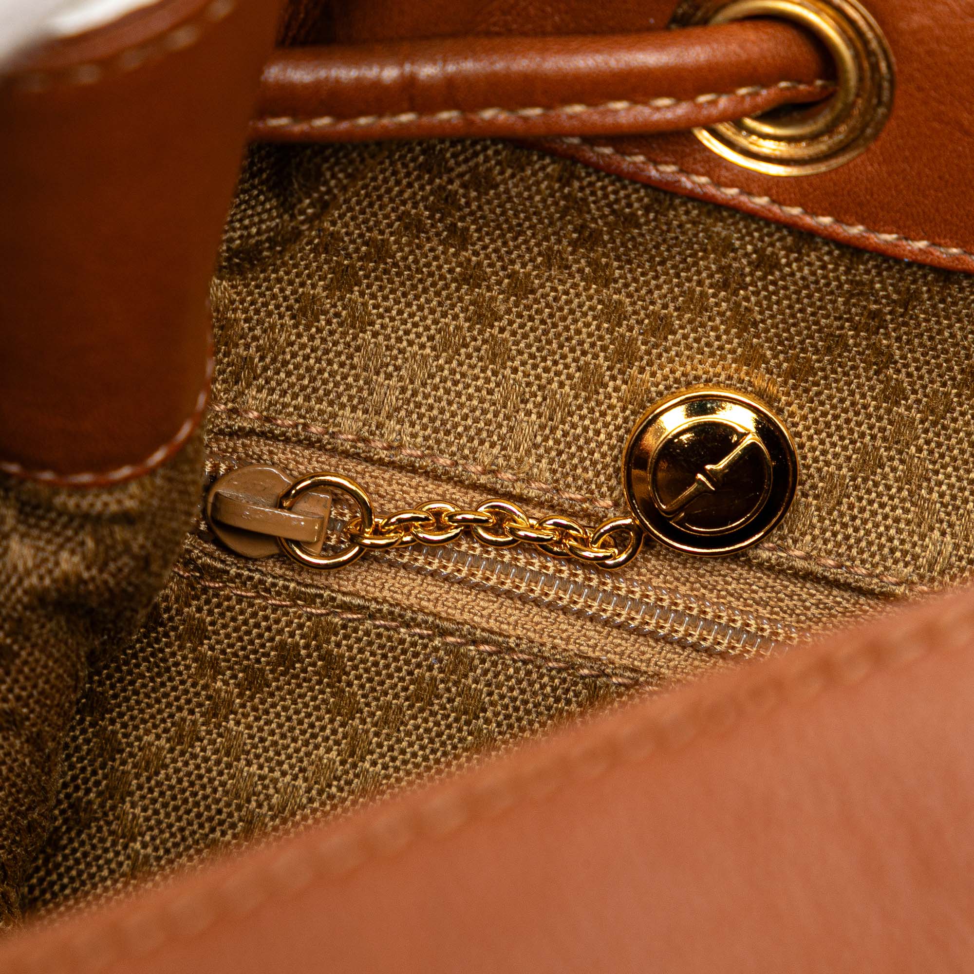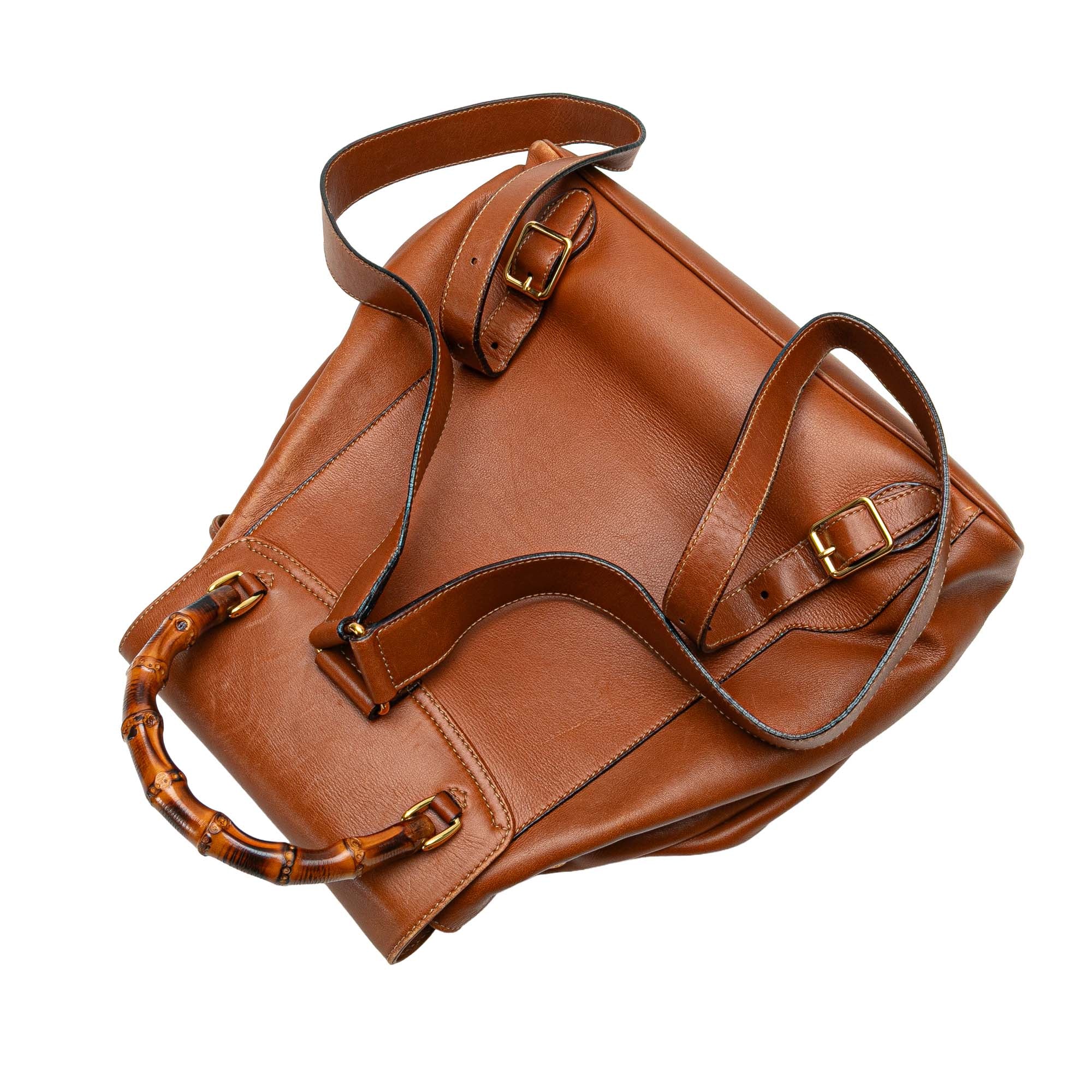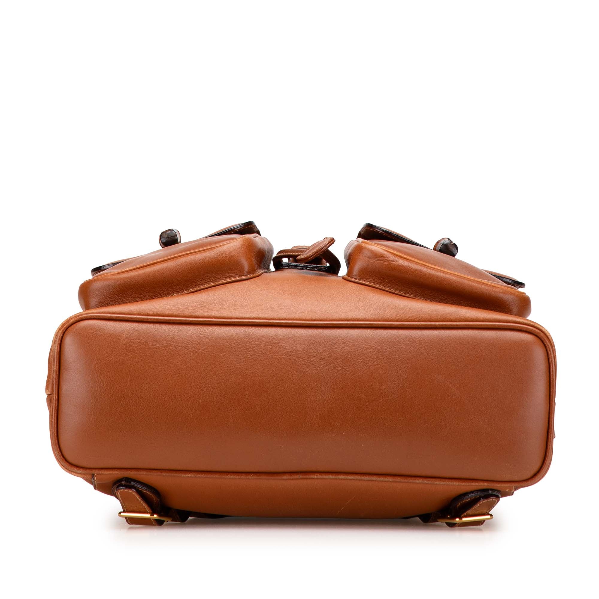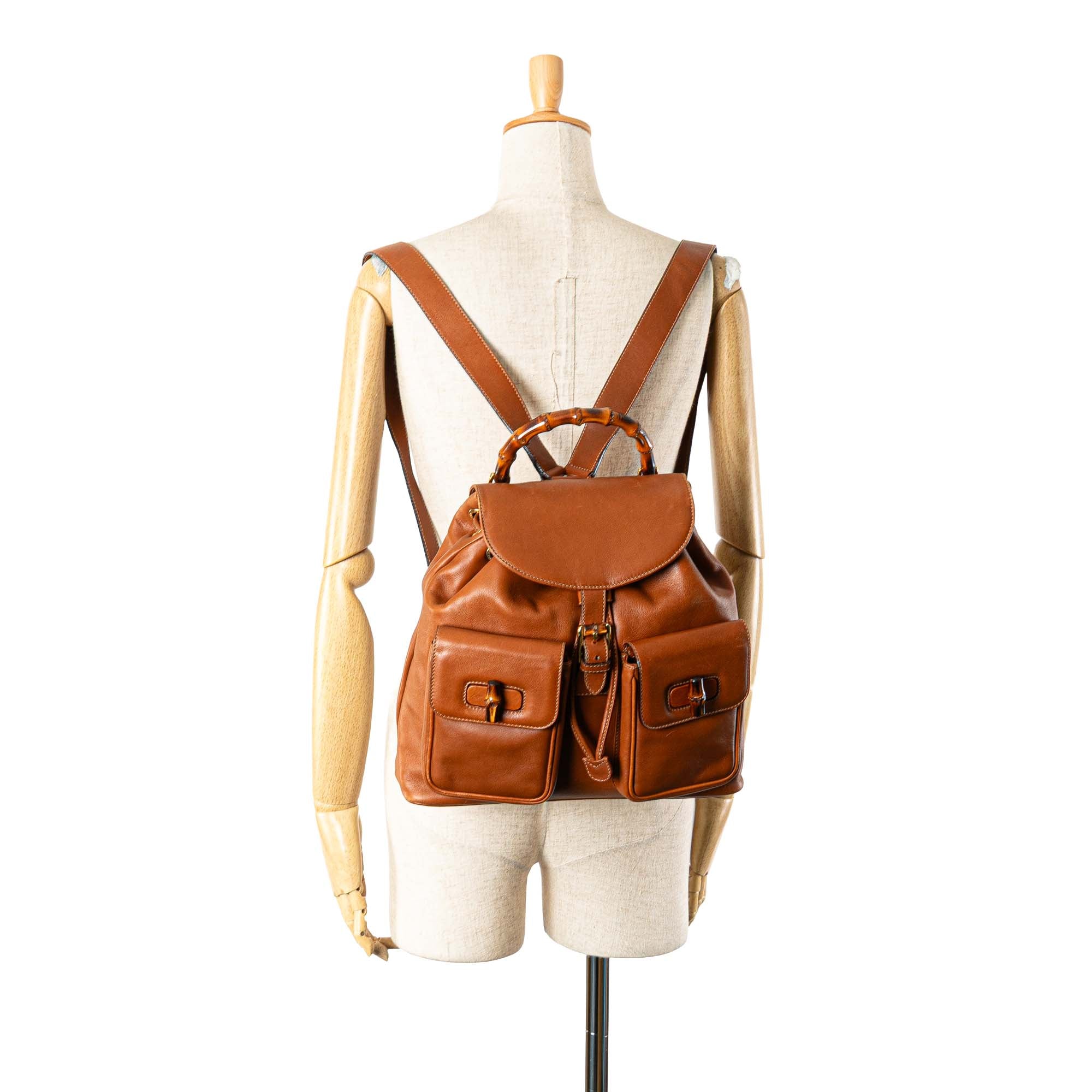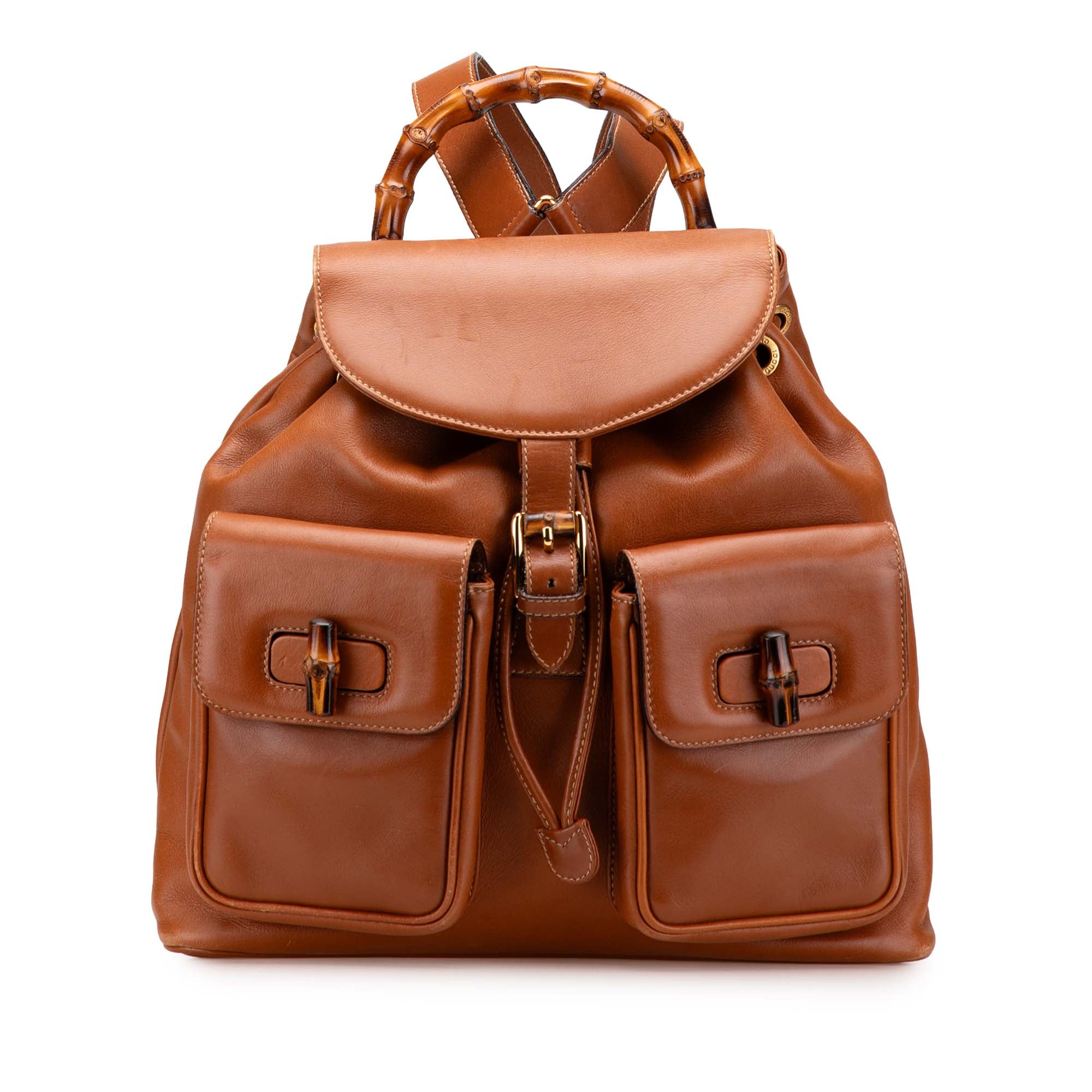 This backpack features a leather body, adjustable flat back straps, a bamboo top handle, a top flap with buckle closure, a drawstring closure, exterior front flap pockets with a bamboo twist lock closure, and an interior zip pocket. Retail Price: 1875.00