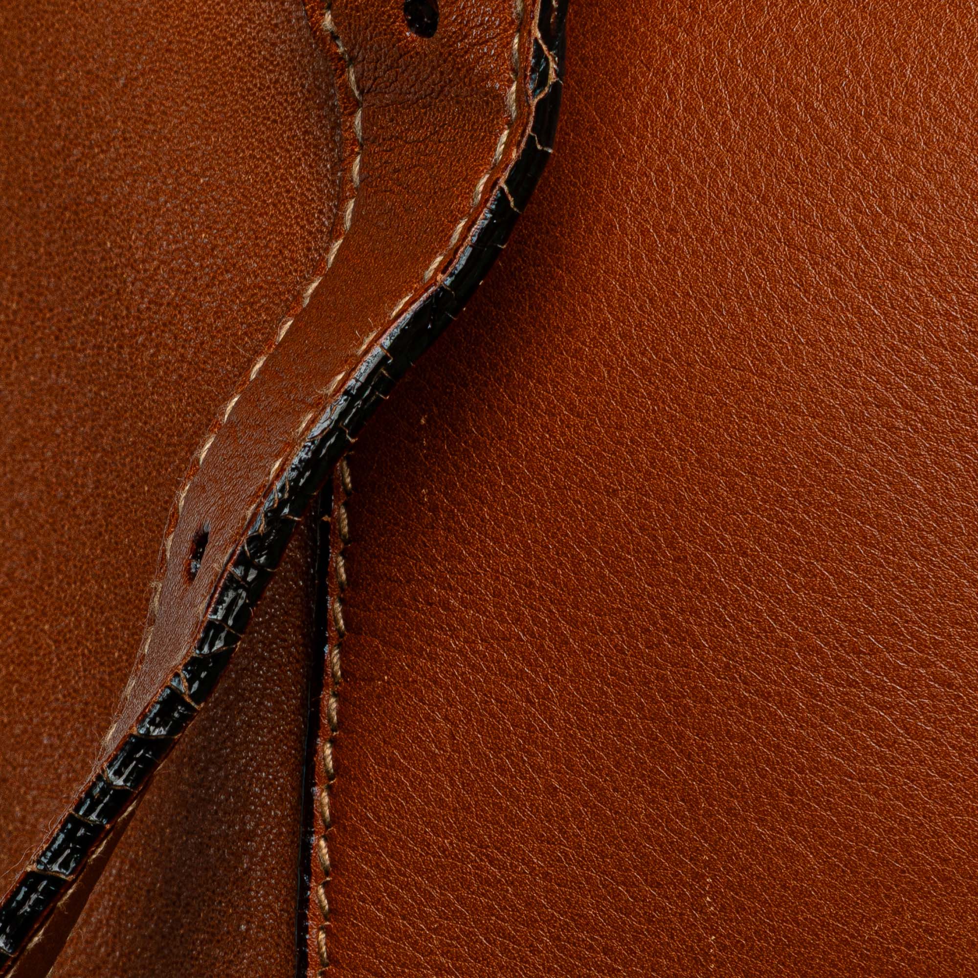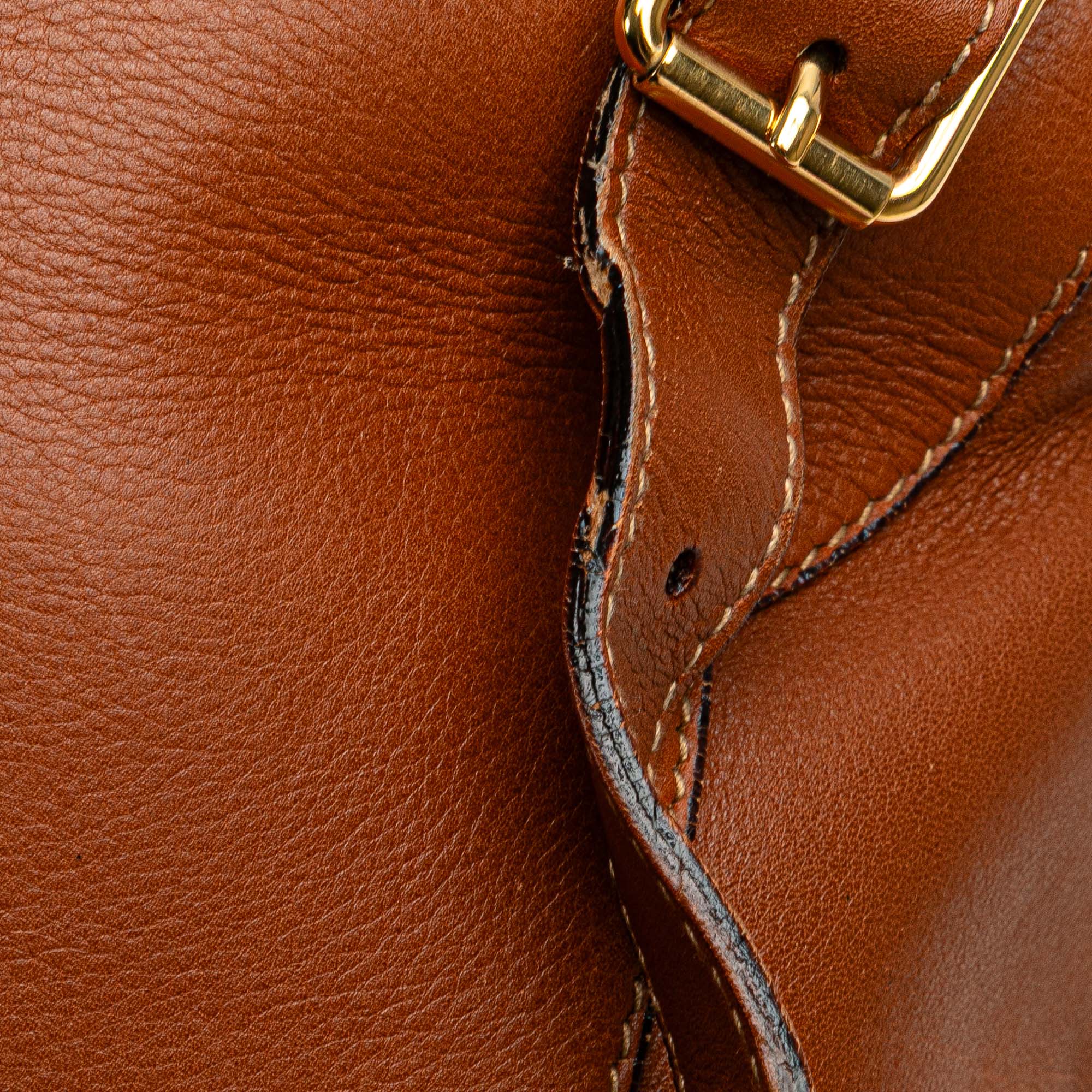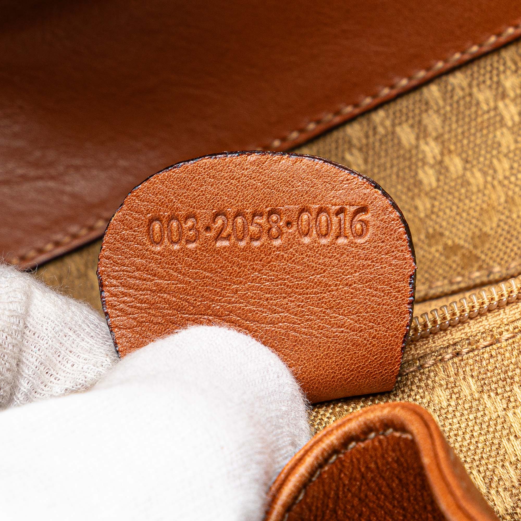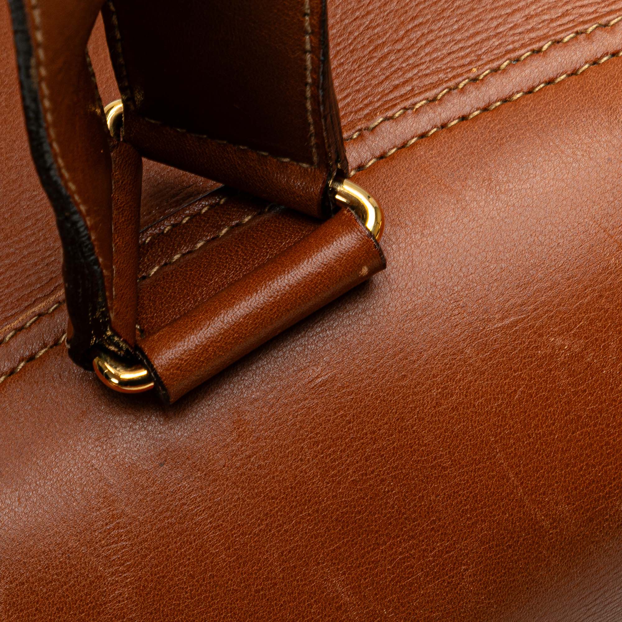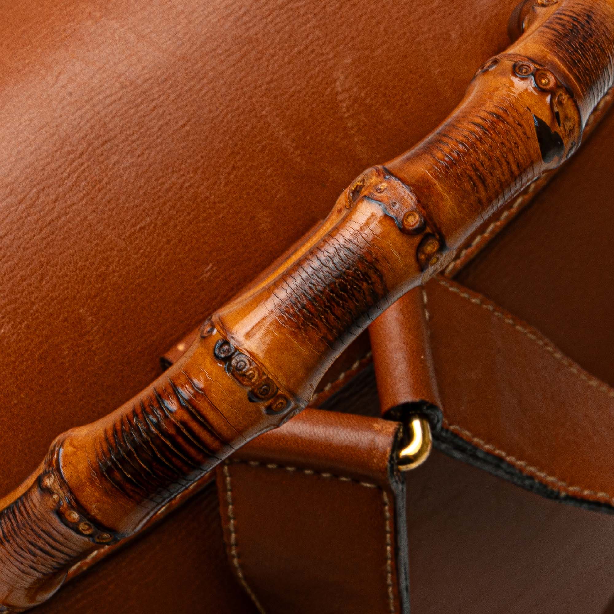 This backpack features a leather body, adjustable flat back straps, a bamboo top handle, a top flap with buckle closure, a drawstring closure, exterior front flap pockets with a bamboo twist lock closure, and an interior zip pocket. Retail Price: 1875.00
