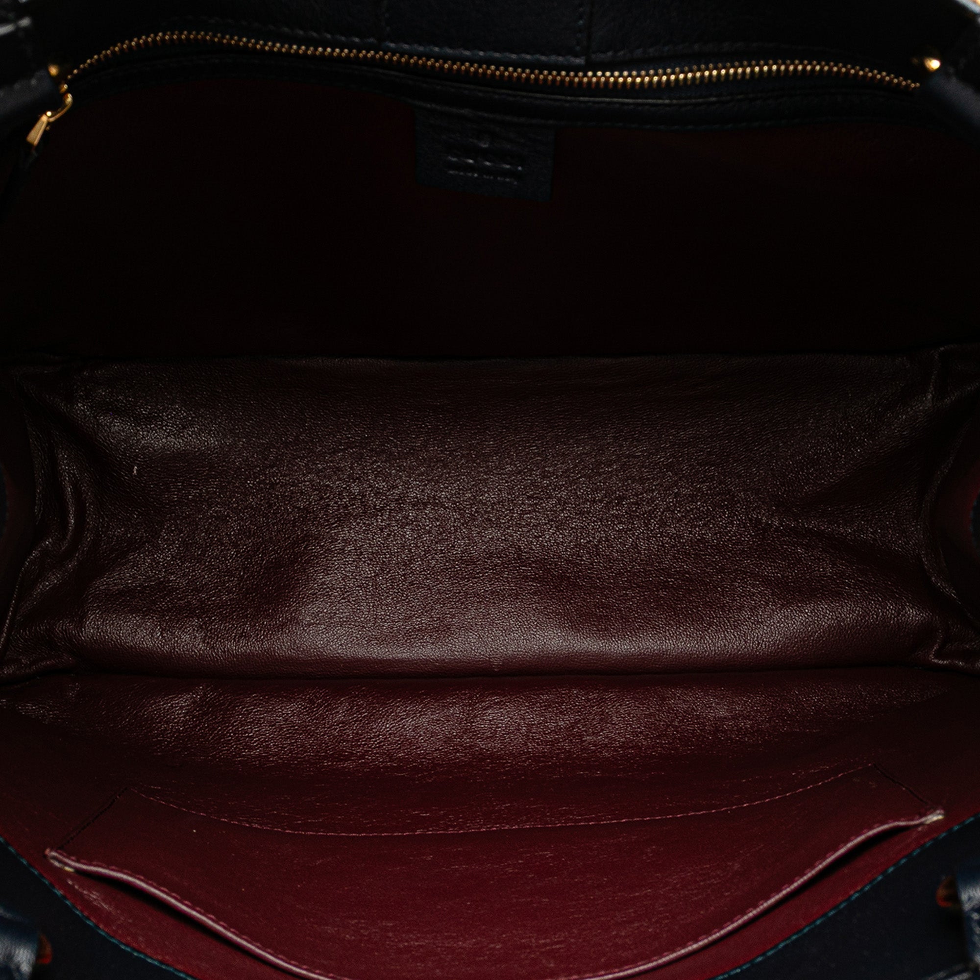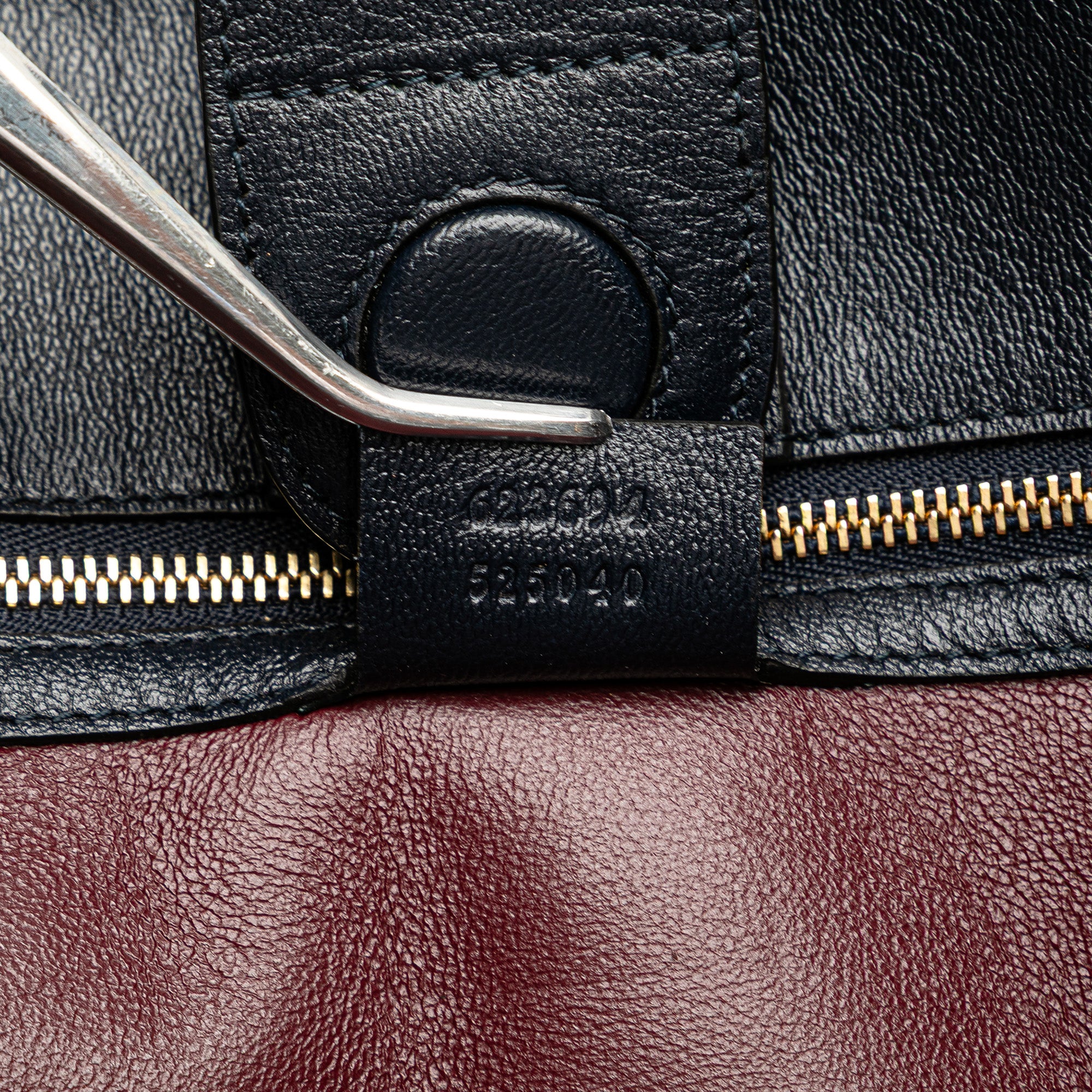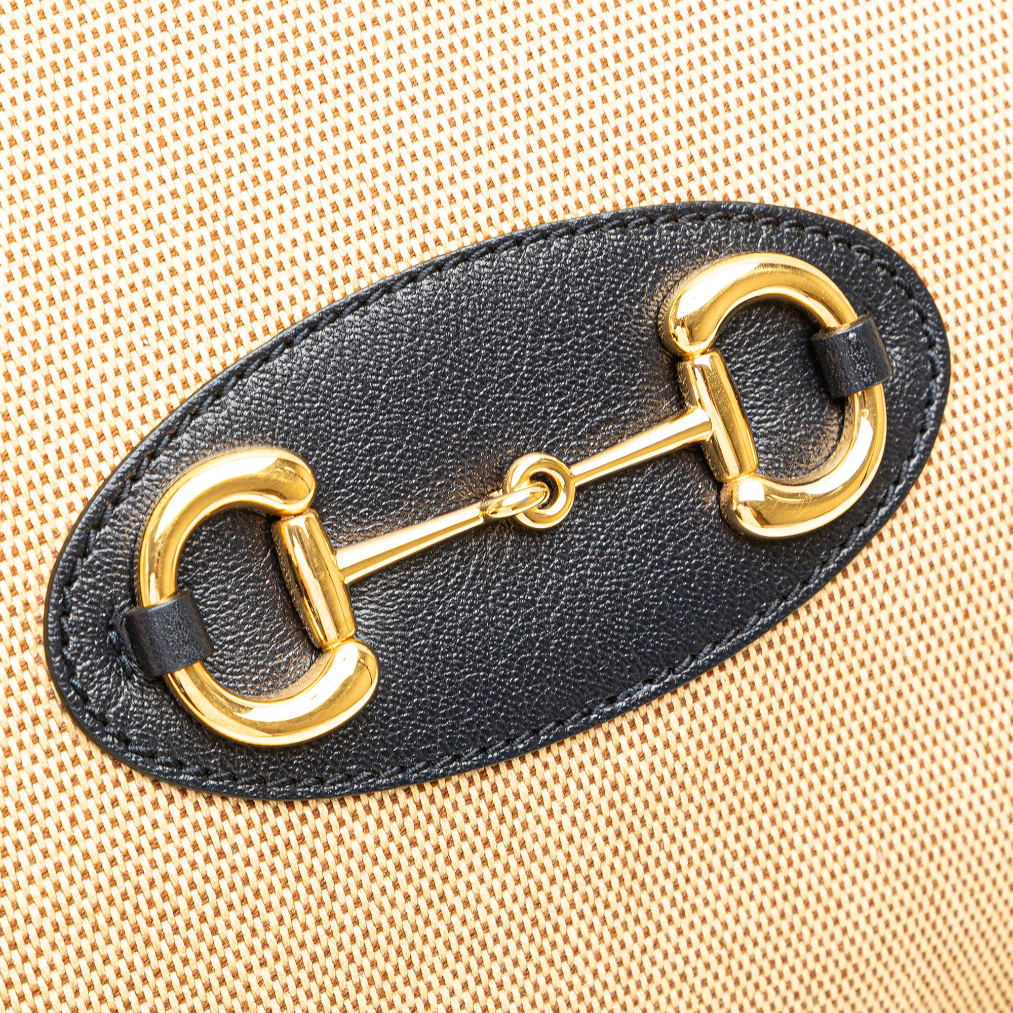 The 1955 tote bag features a canvas body with gold-tone hardware, flat leather straps, an open top with magnetic snap closure, and interior zip and slip pockets. Retail Price: 1890.00