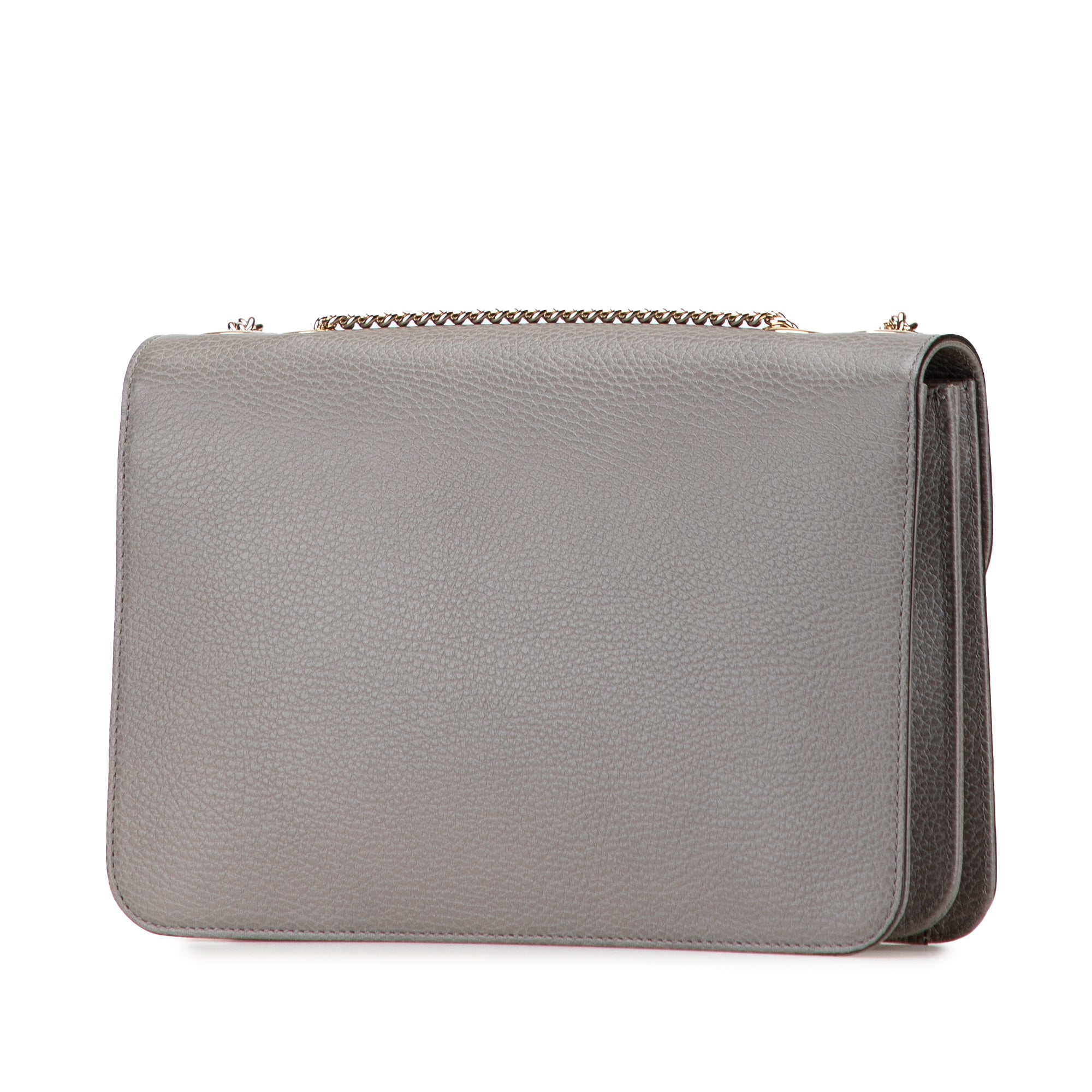 This crossbody bag features a leather body, a chain link strap with leather shoulder guard, a front flap with GG flip-lock closure, and an interior zip pocket. Retail Price: 2100.00