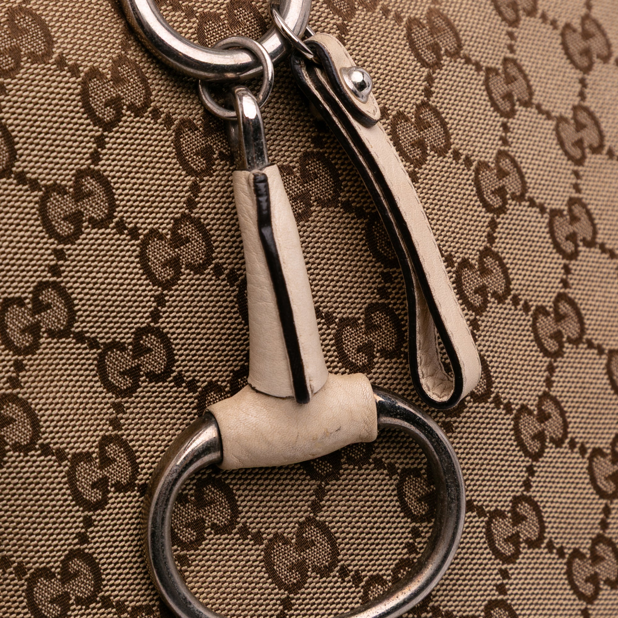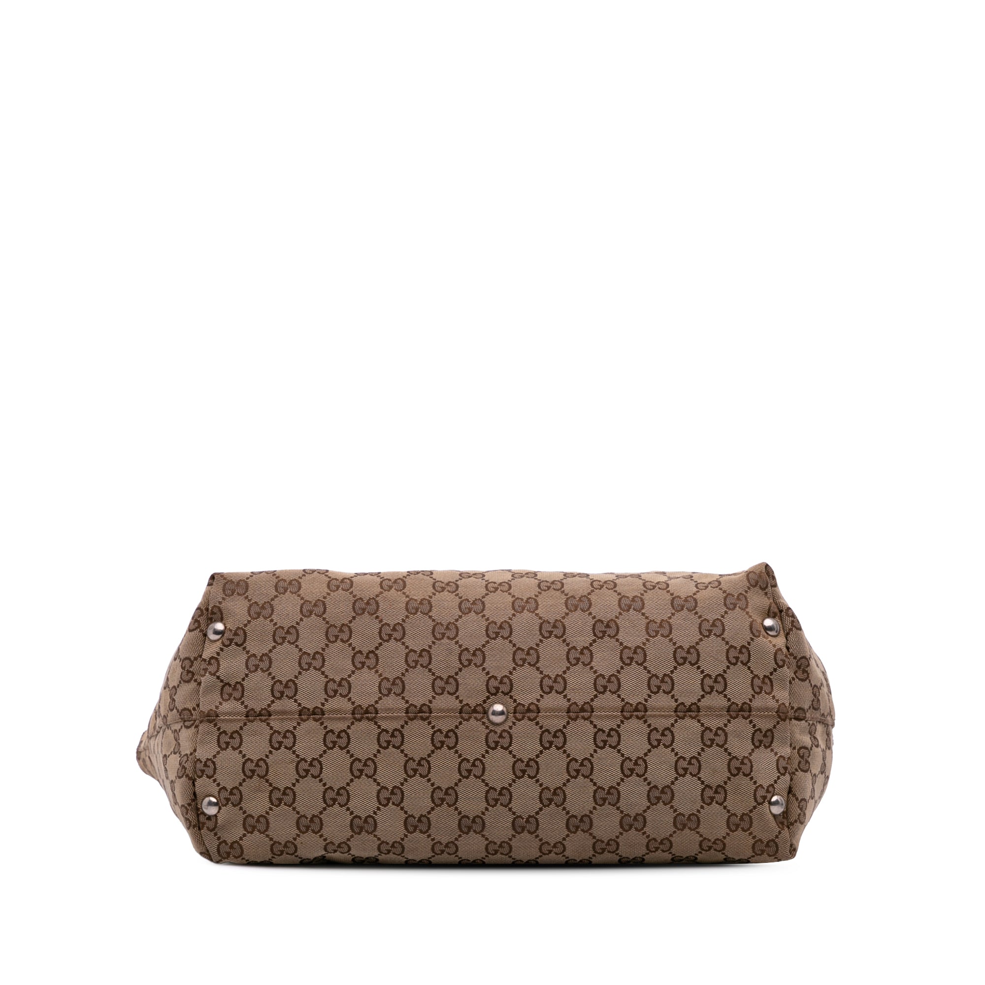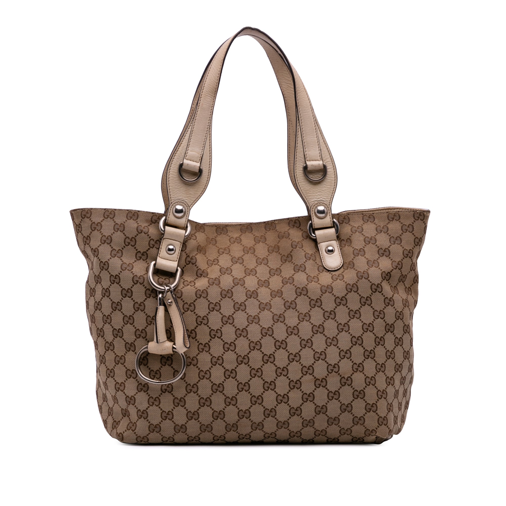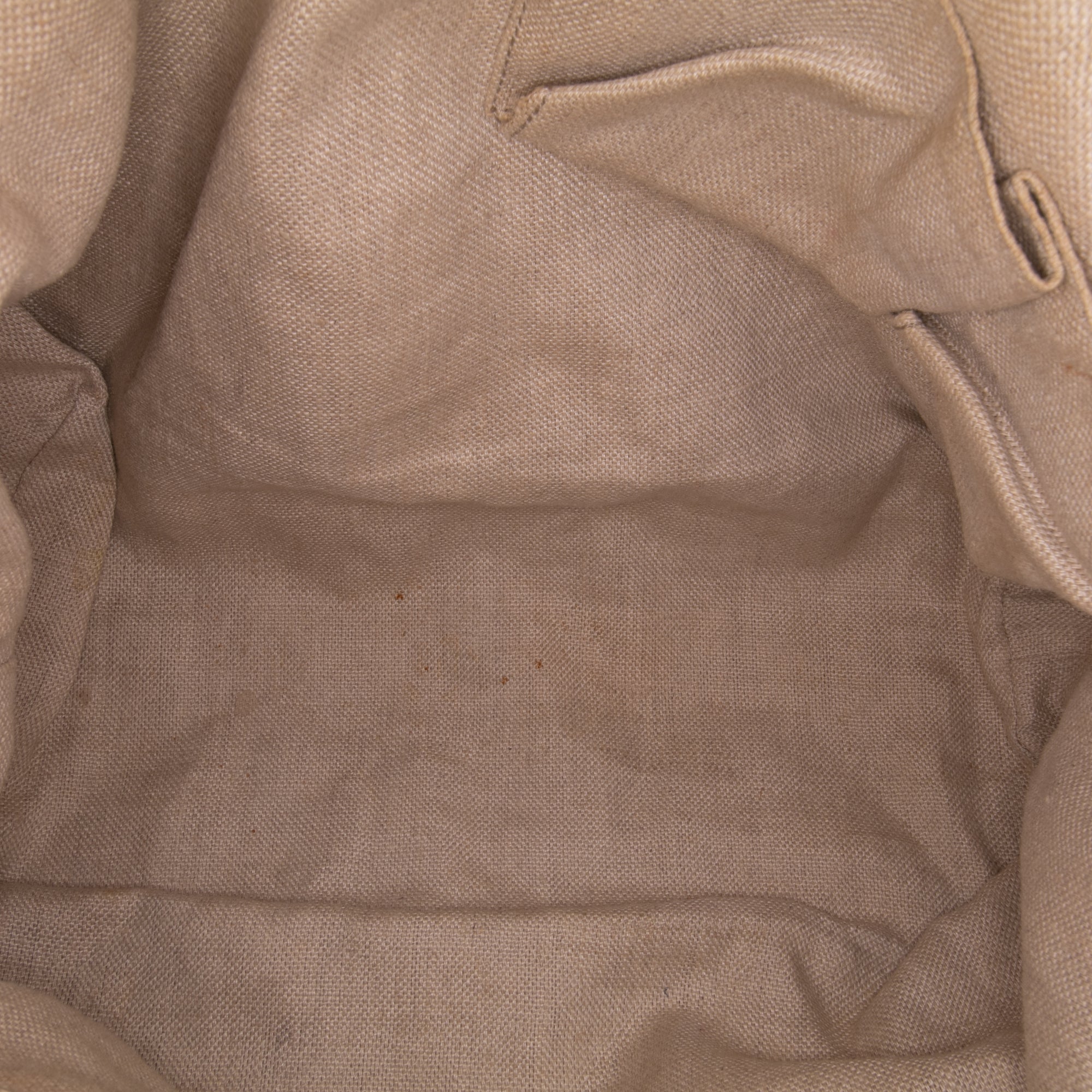 This tote bag features a canvas body with leather trim, flat leather straps, an open top with magnetic snap closure, and interior zip and slip pockets. Retail Price: 675.00