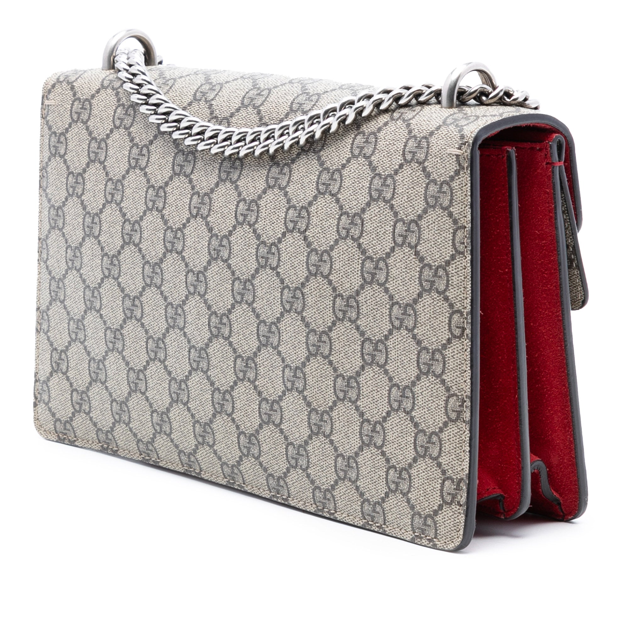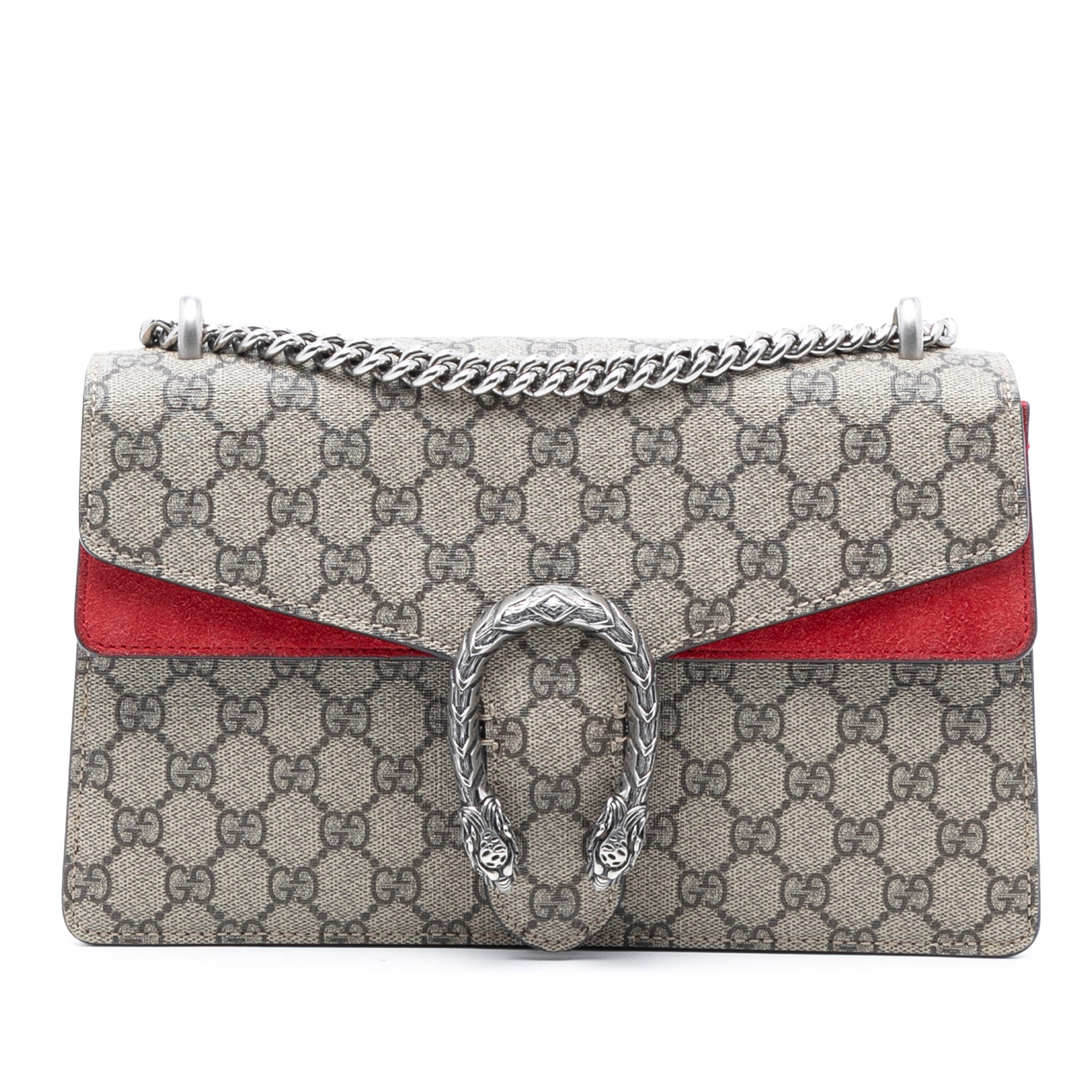 The Dionysus features a coated canvas body with suede leather trim, a silver-tone curb chain shoulder strap, a front flap with push lock closure, and an interior zip compartment. Retail Price: 3040.00