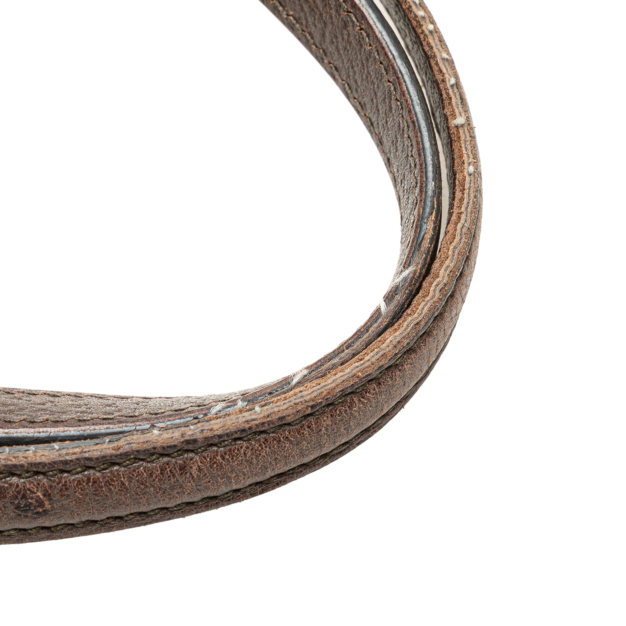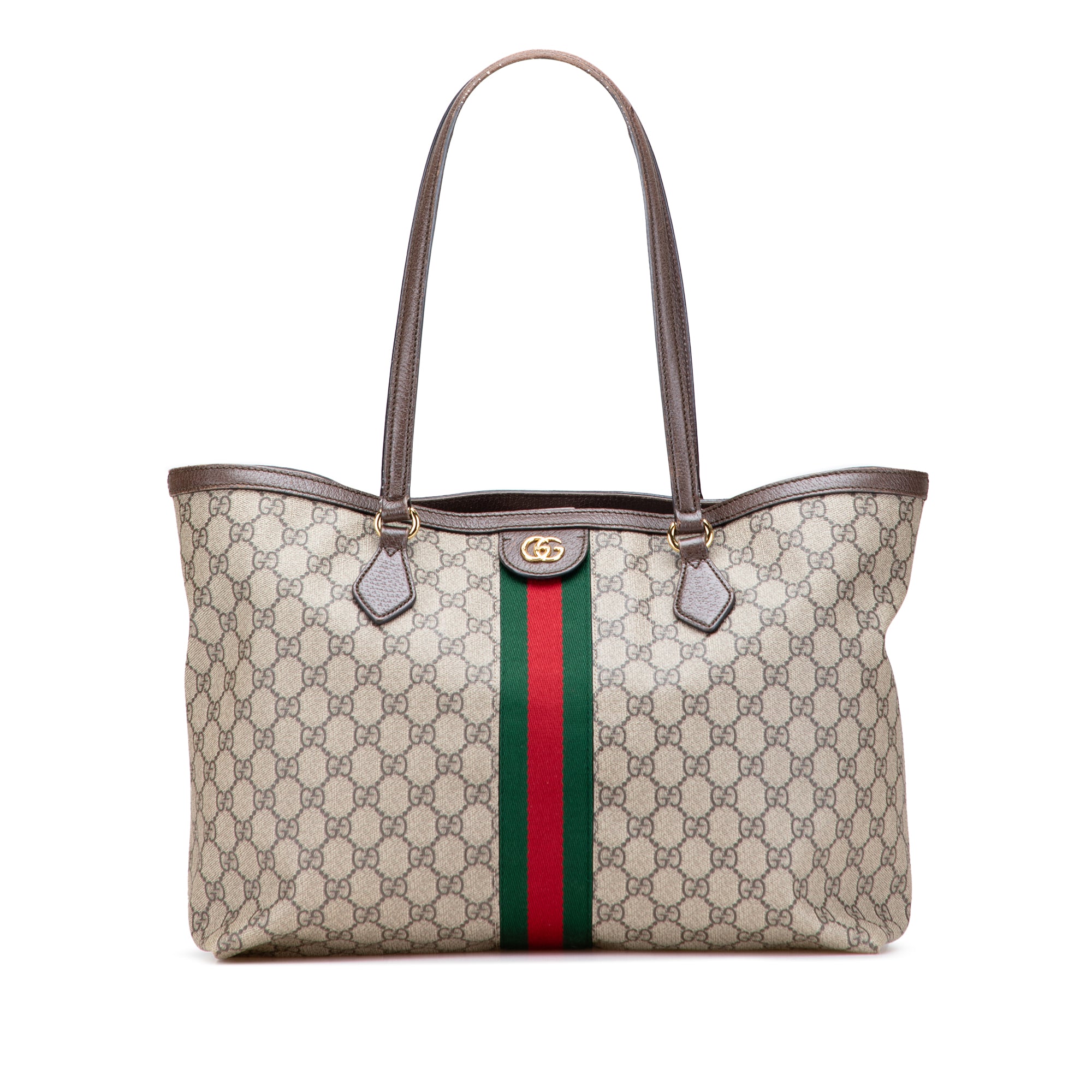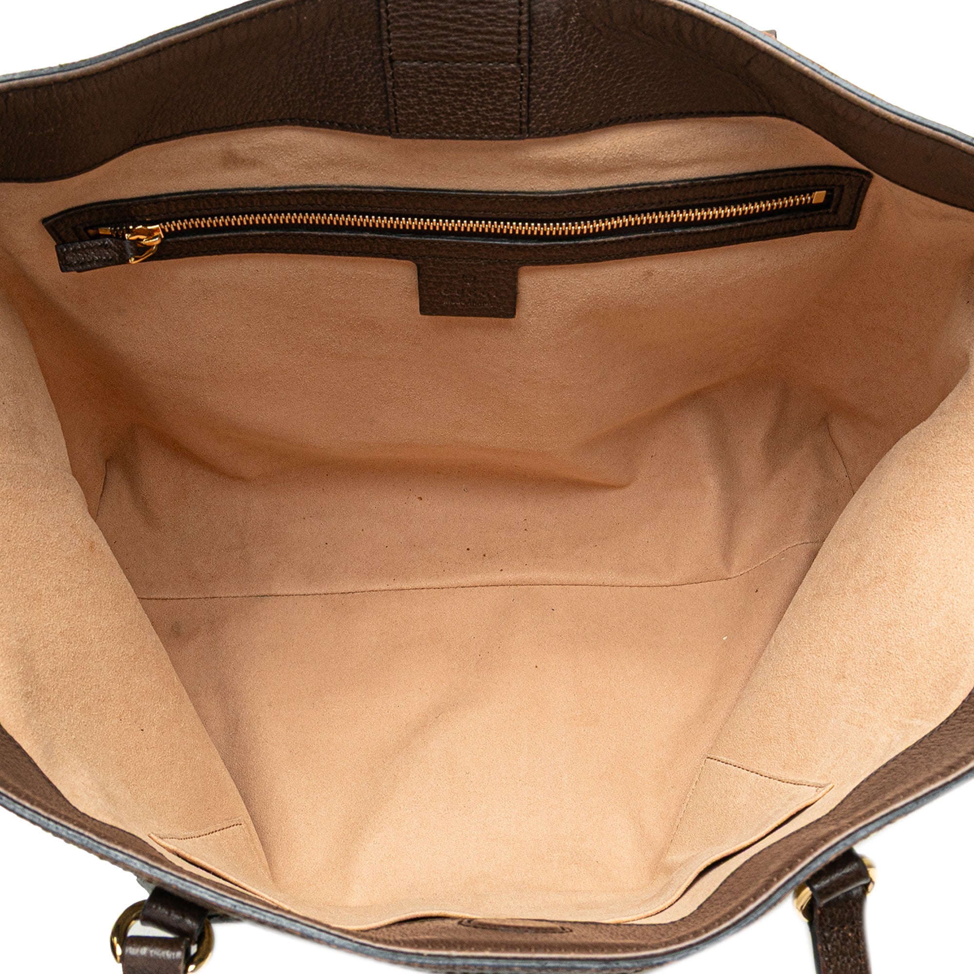 This tote bag features a coated canvas body with leather trim, flat leather shoulder straps, an open top with magnetic snap closure, and interior zip and slip pockets. Inclusion: Dust bag. Retail Price: 1750.00
