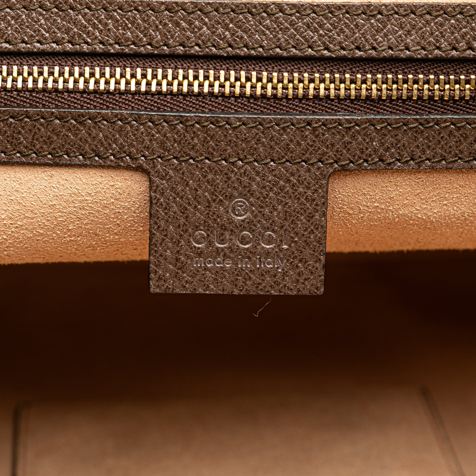 The Ophidia satchel features a coated canvas body with leather trim, flat leather handles, a detachable flat leather strap, a top zip closure, and interior zip and slip pockets. Retail Price: 2100.00
