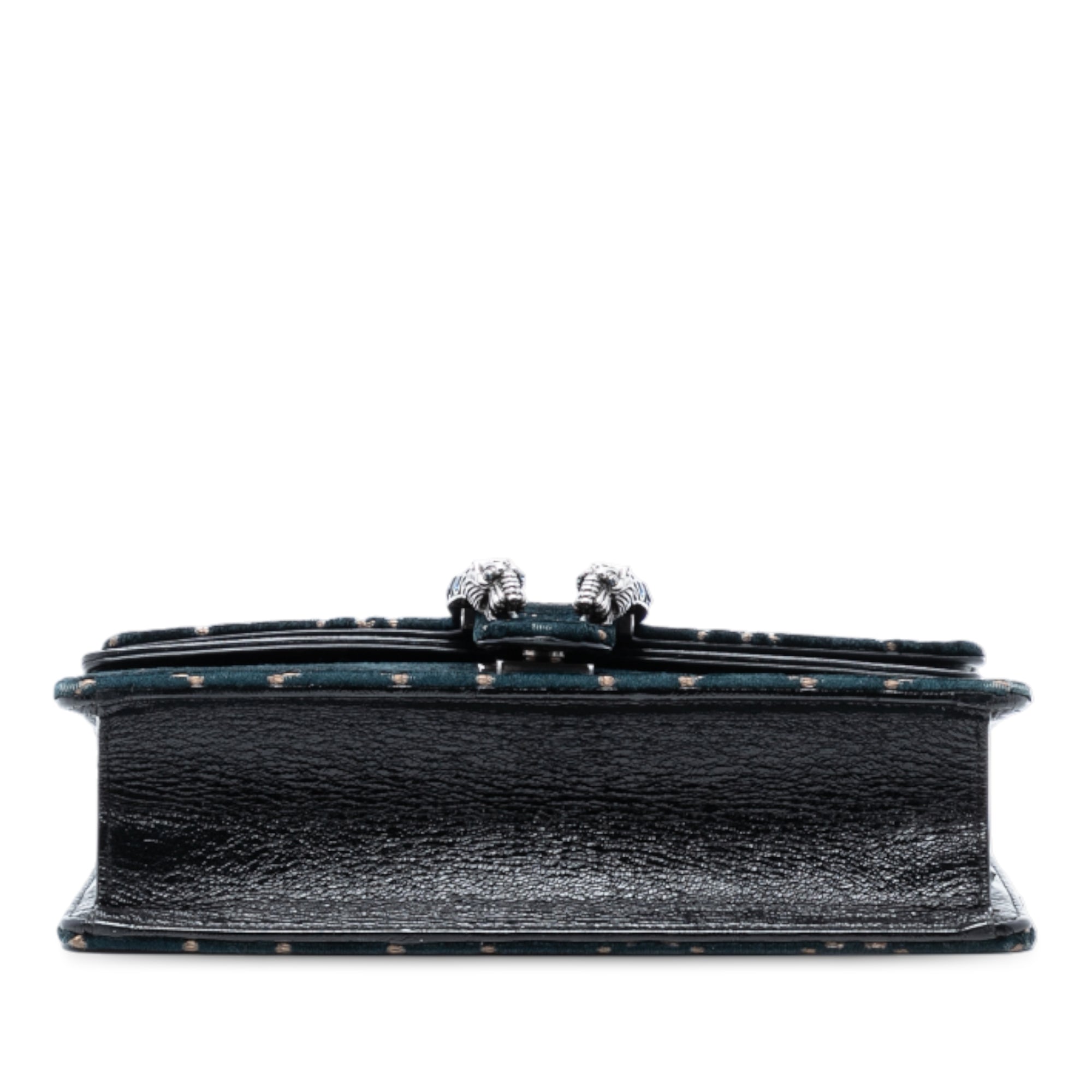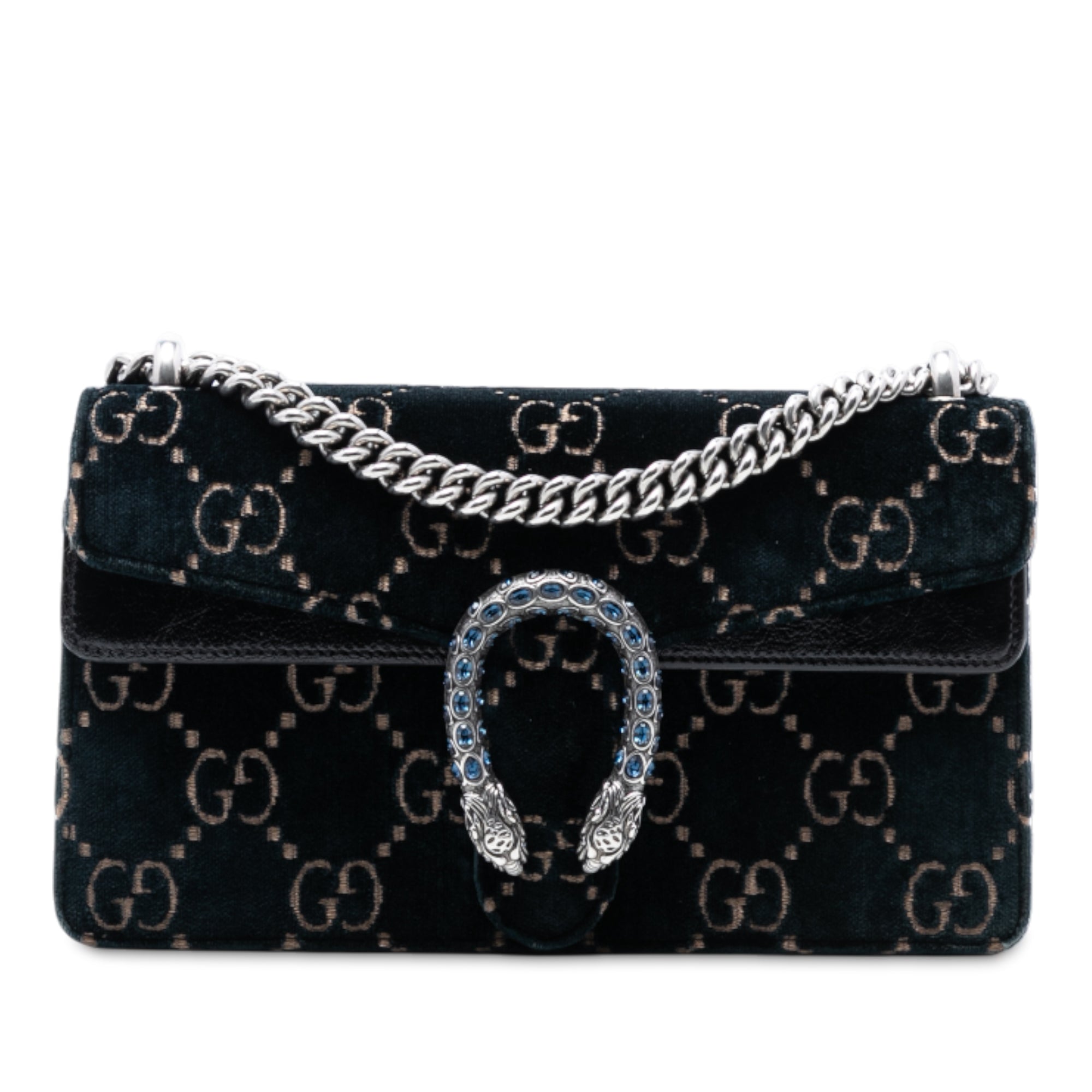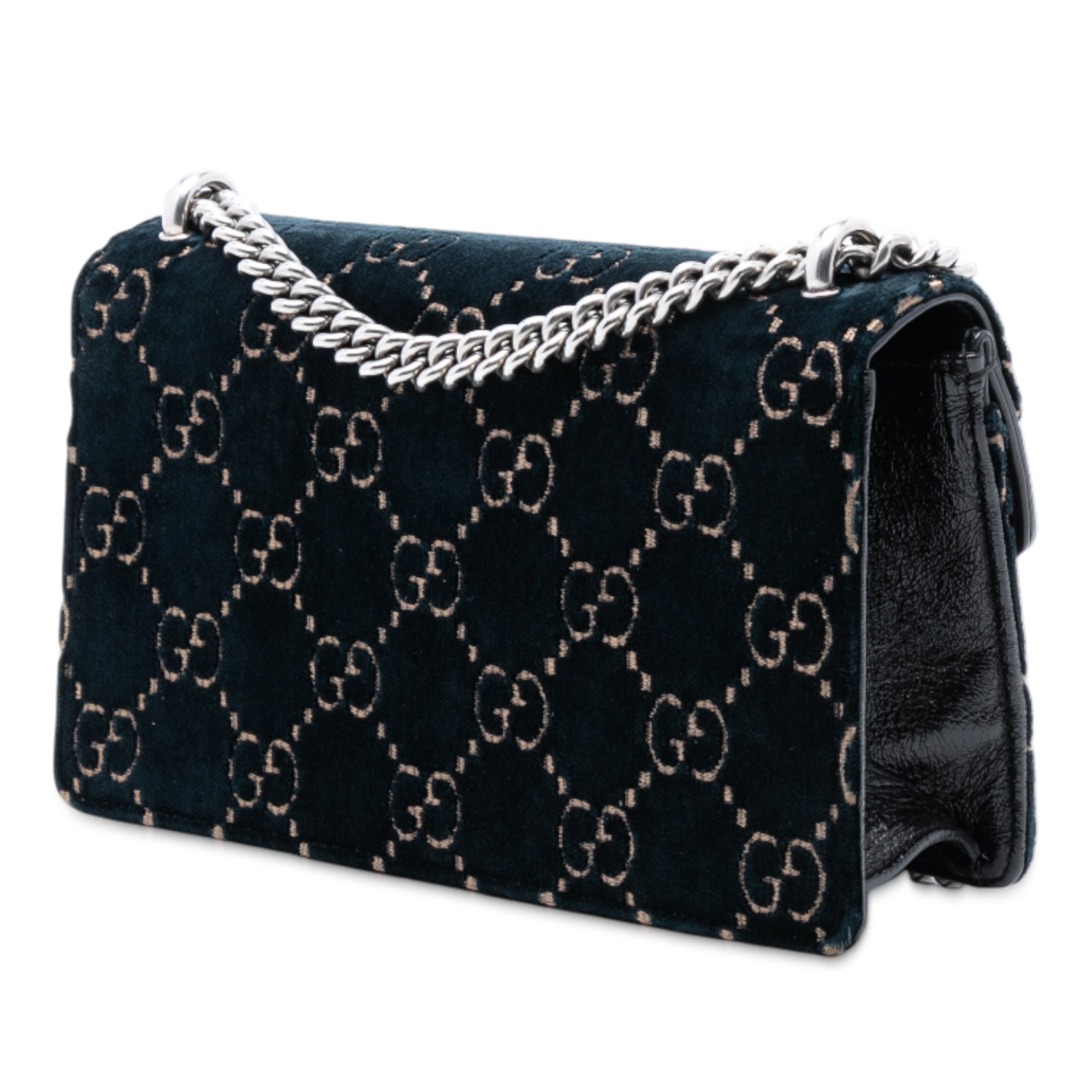 This shoulder bag features a velvet body with leather trim, silver-tone chain straps, a front flap with a magnetic snap button closure, and an interior pocket. Retail Price: 3432.00