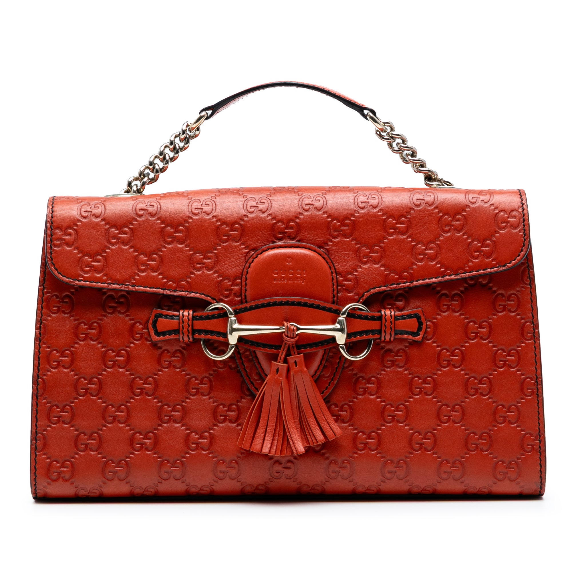 The Emily features an embossed leather body, a chain link shoulder strap with leather guard, a flap with pull-through closure, and interior slip pockets. Retail Price: 1250.00