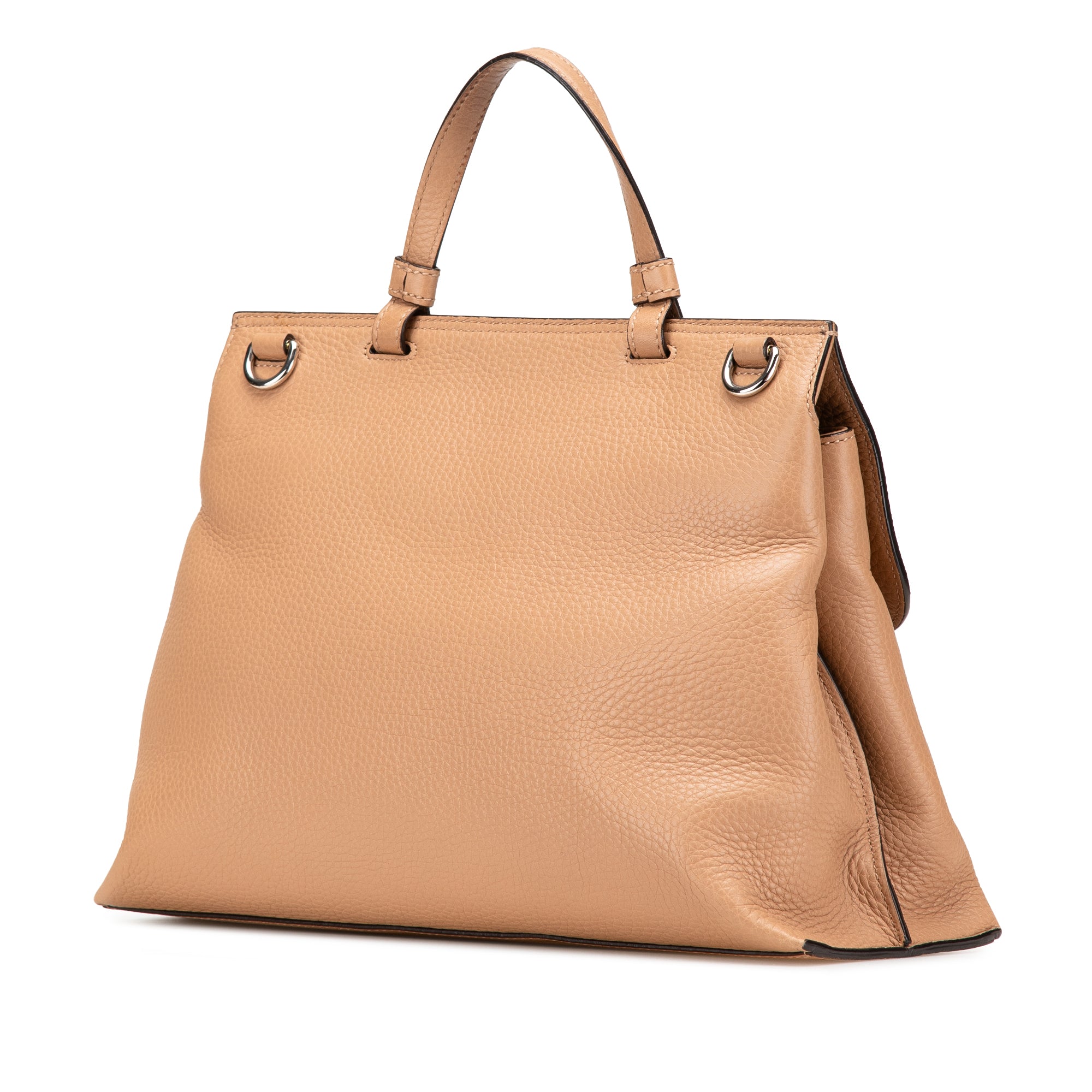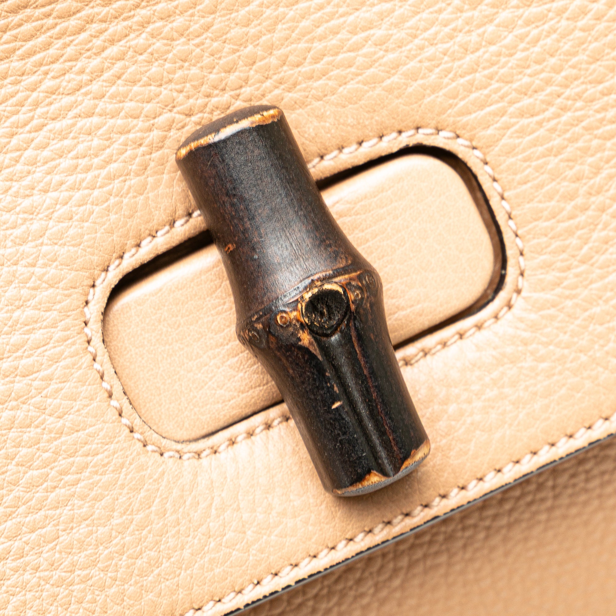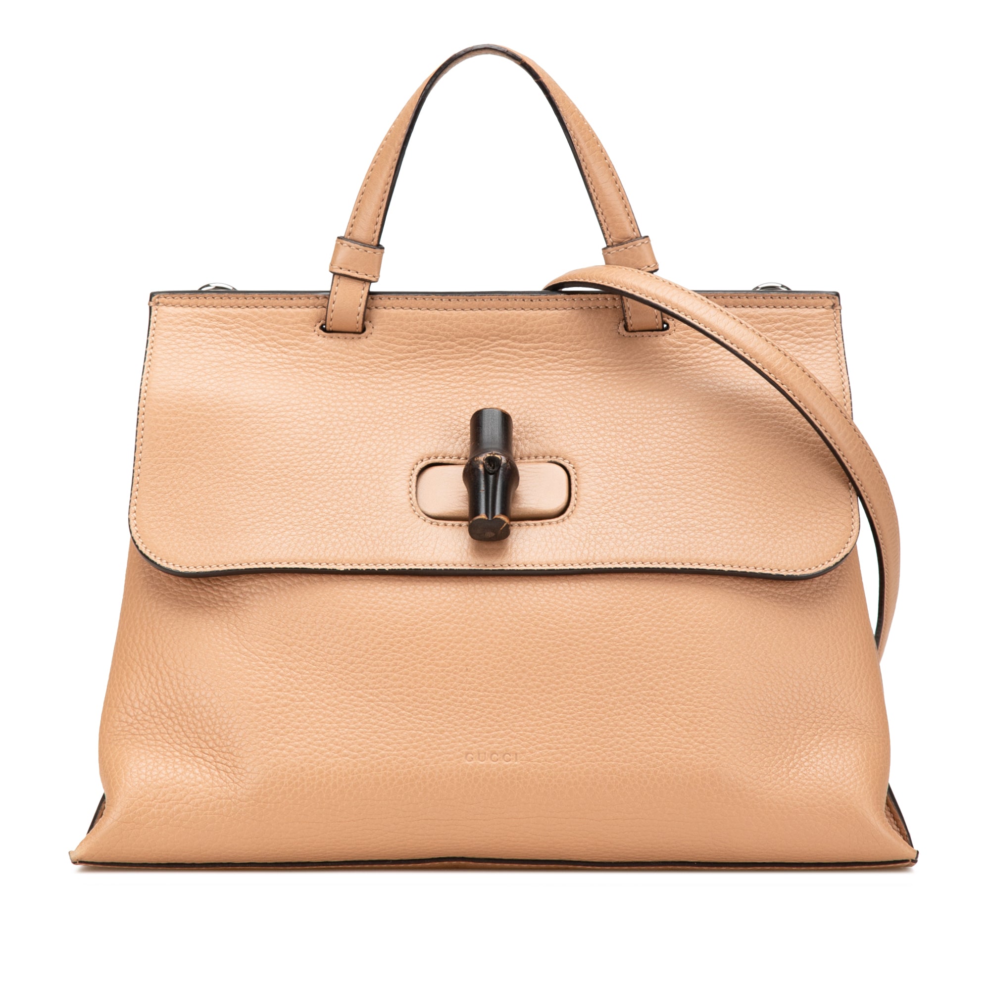 The Daily satchel features a leather body, a flat leather top handle, a detachable flat leather strap, a front flap with a bamboo bullet twist lock closure, and interior zip and slip pockets. Retail Price: 1950.00