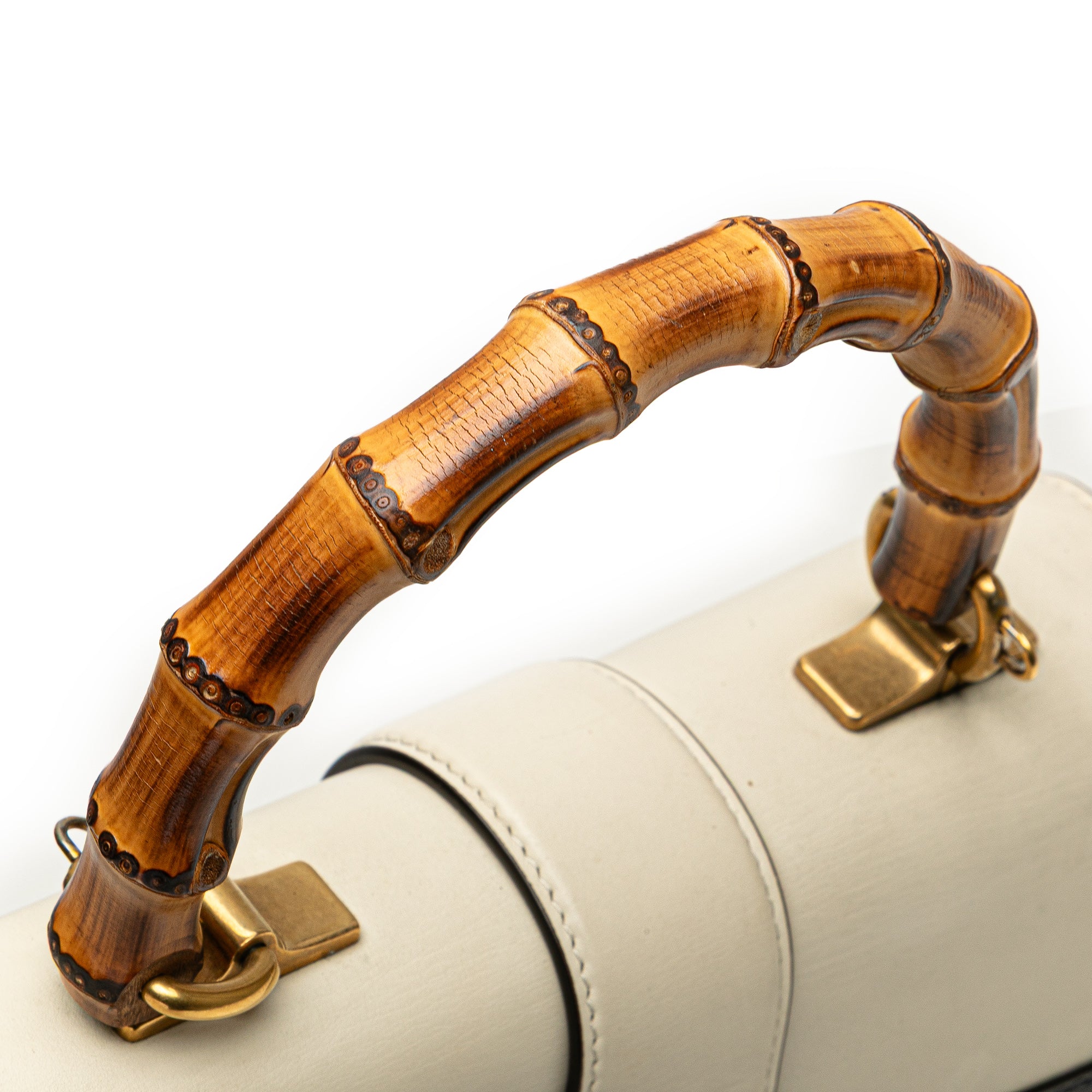 The Dionysus satchel features a leather body, a bamboo top handle, a detachable flat strap, a front flap with a magnetic closure, interior zip and slip compartments, and interior slip pockets. Retail Price: 2450.00