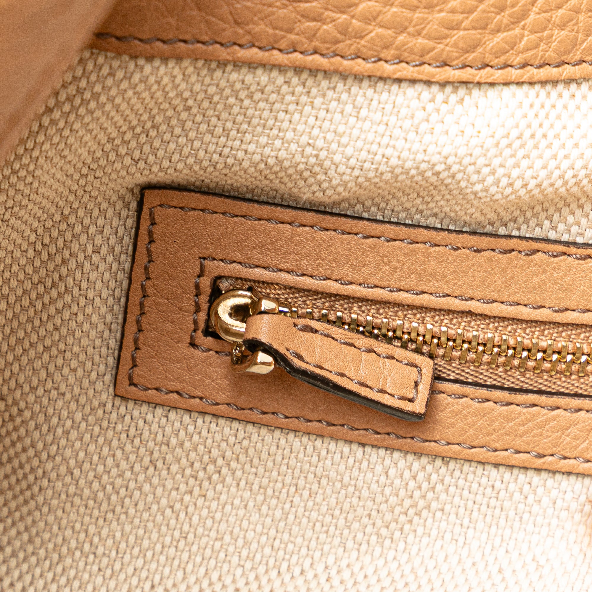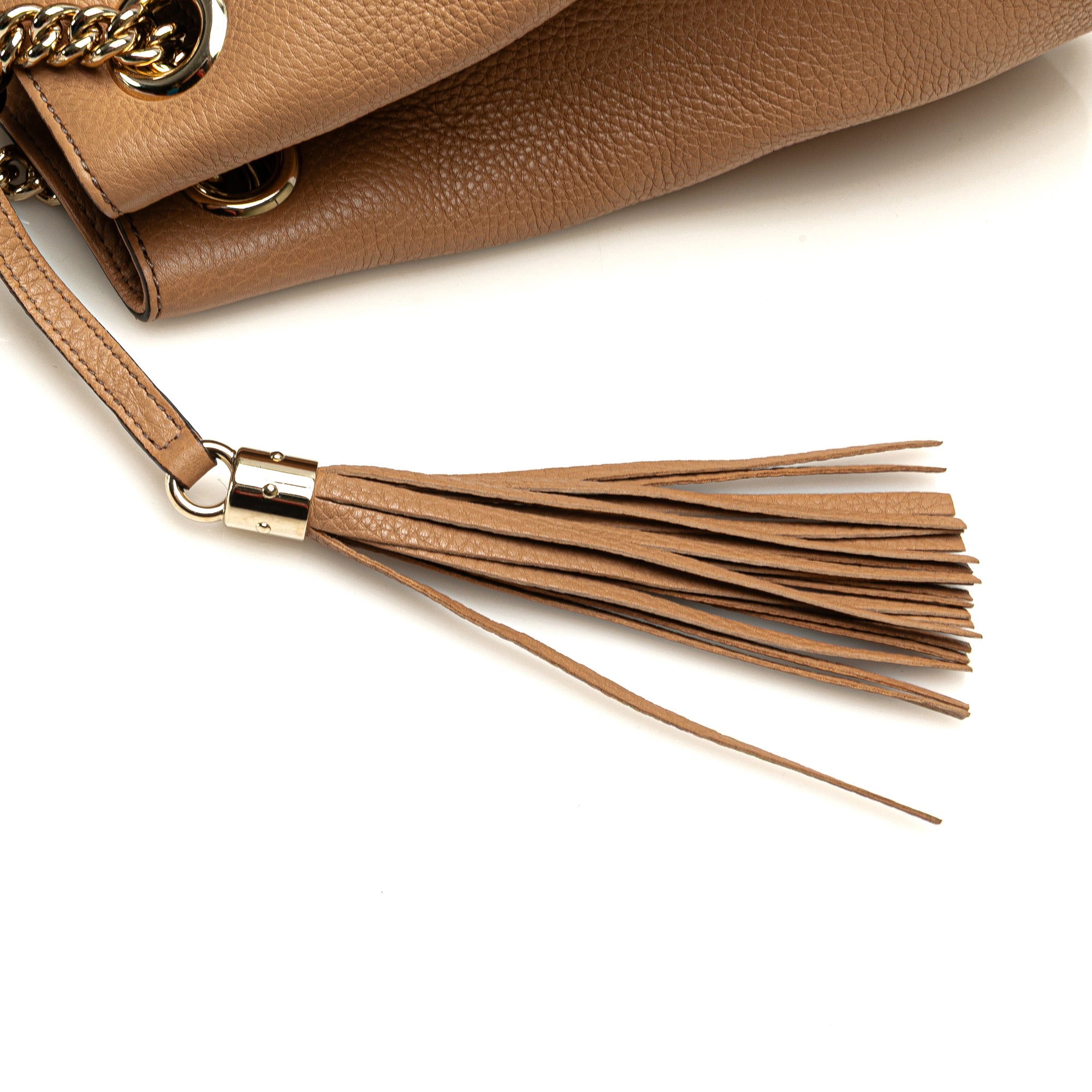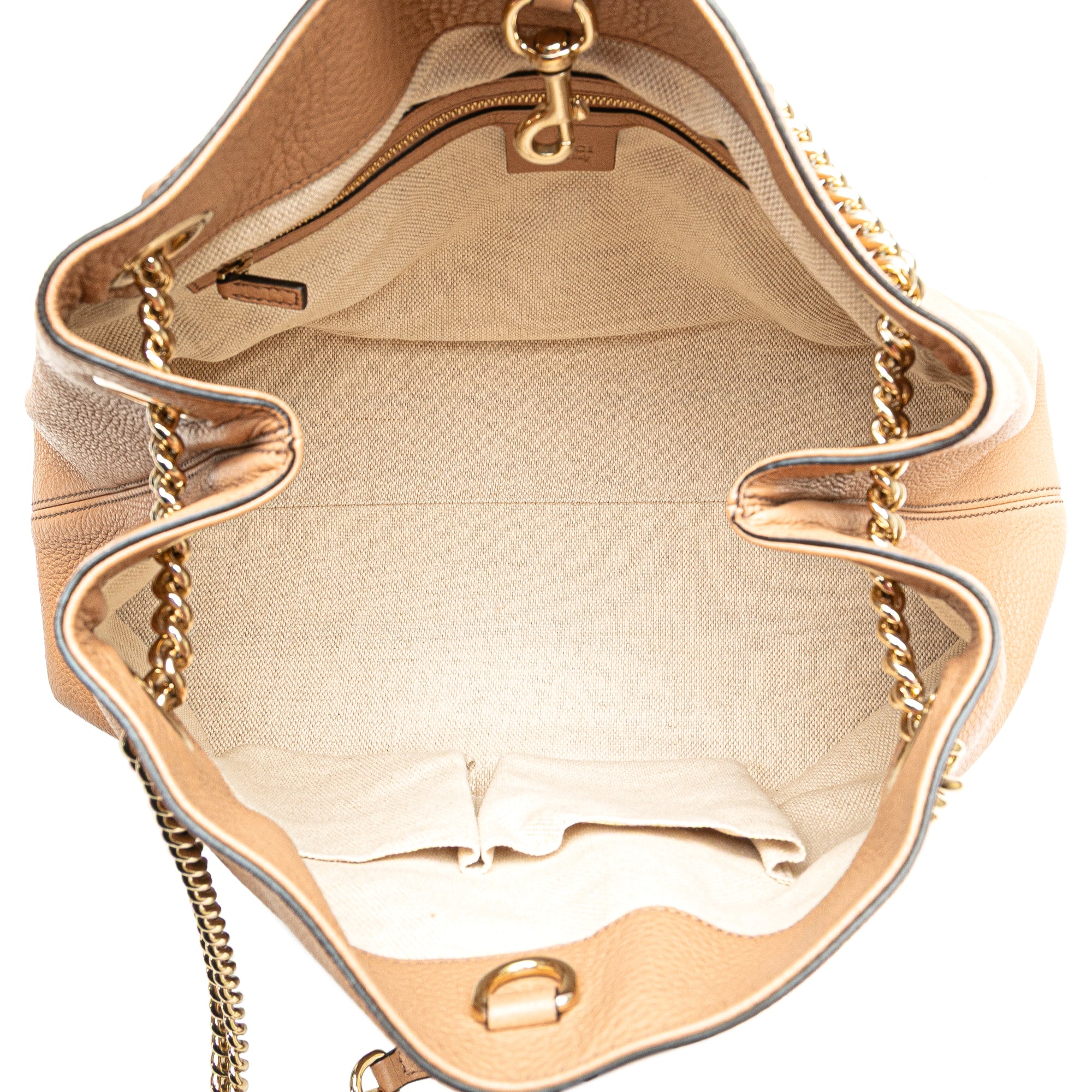 The Soho Chain tote bag features a leather body, chain link straps with leather guard, a tassel detail, an open top with hook closure, and interior zip and slip pockets. Retail Price: 1650.00