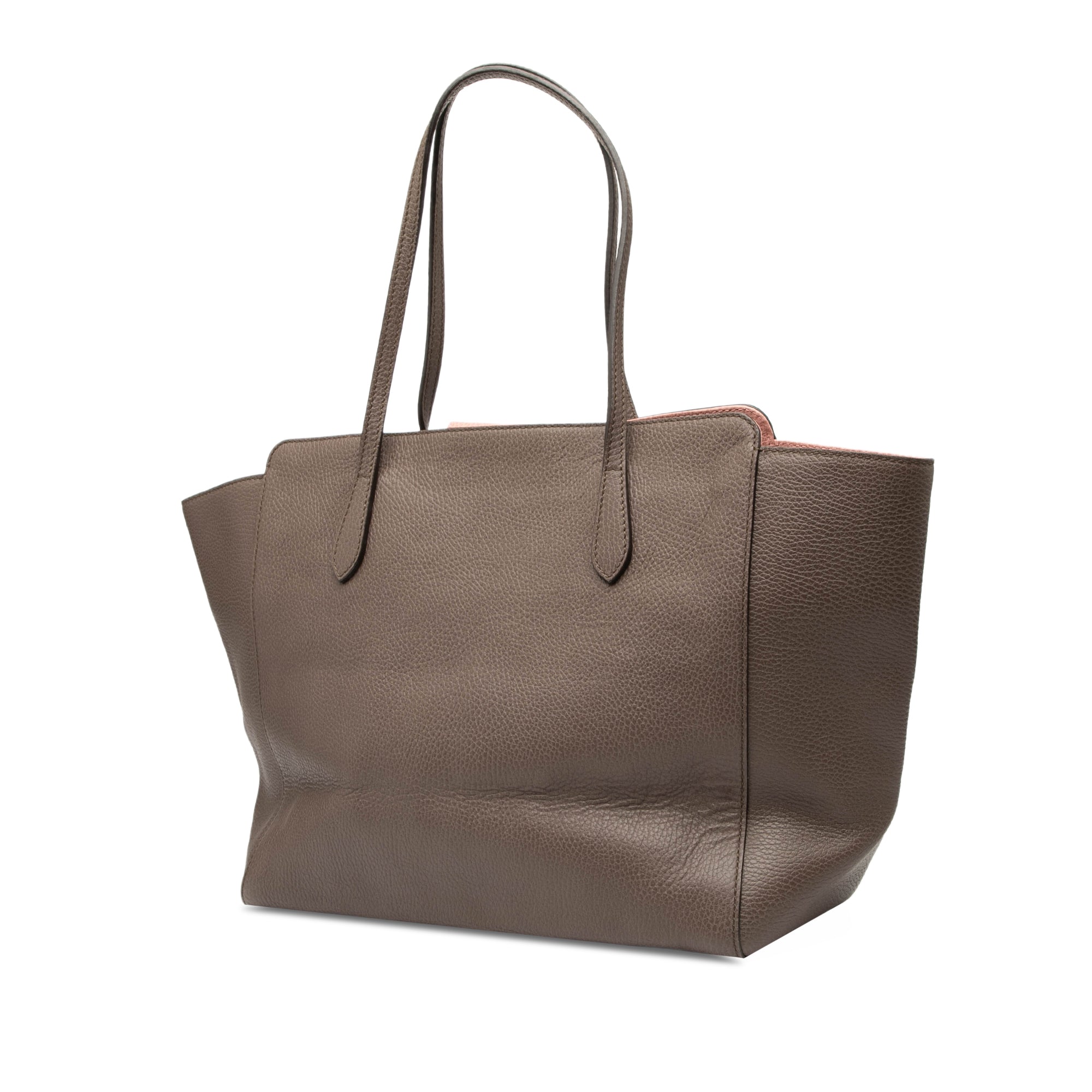 The Swing tote bag features a leather body with tags, flat leather shoulder straps, an open top with magnetic closure, and interior zip and slip pockets. Retail Price: 1350.00