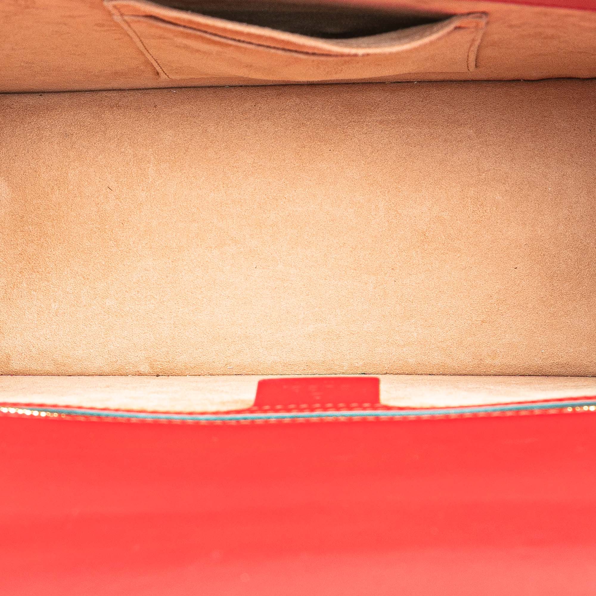 The Sylvie satchel features a leather body, a web trim, a flat top handle, a detachable strap, a front flap with a metal closure, and interior zip and slip pockets. Retail Price: 3088.00