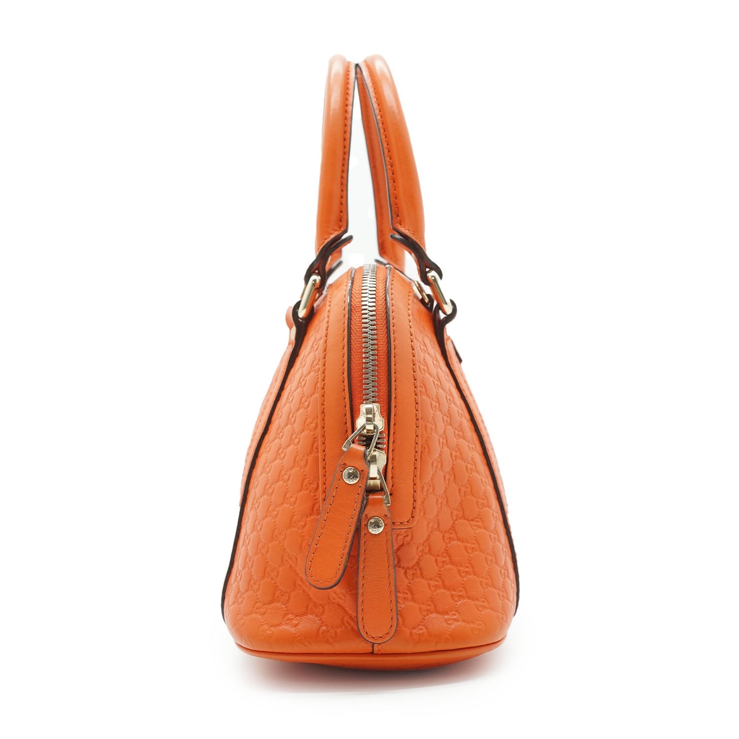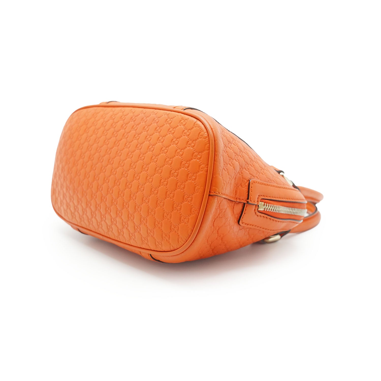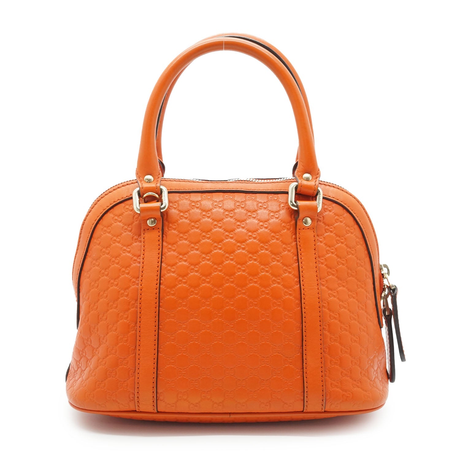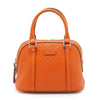 Microguccissima Dome 2way Handbag Orange LeatherDepth: 12.5cmHeight: 18cmWidth: 24cmShoulder Drop: 45cmHand Drop: 10cmOutside Rank: ABInside Rank: BStain: Some yellow stains on the inside fabric, small stain at the top near the zipperInclude: Leather shoulder strapSerial code: 449654 498075