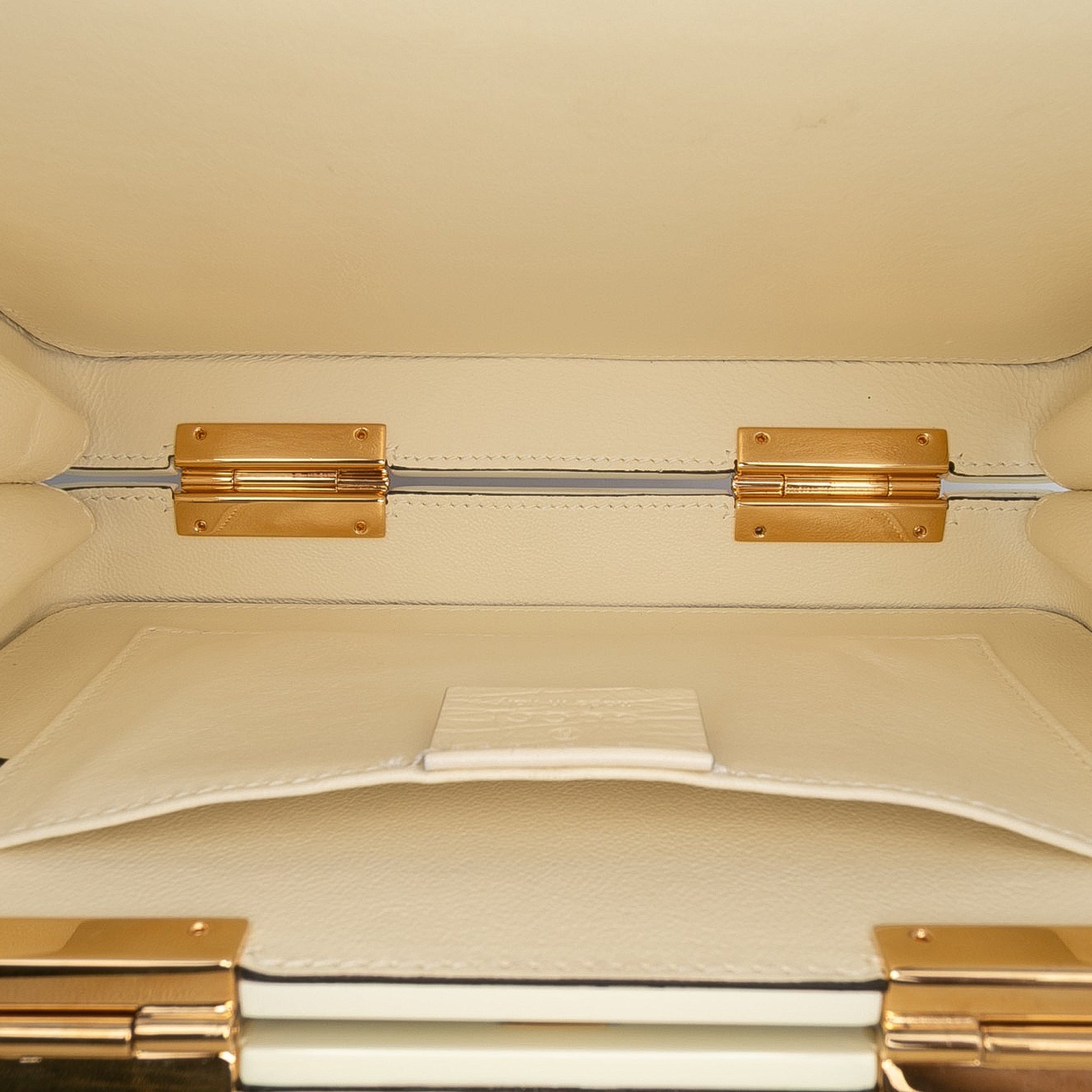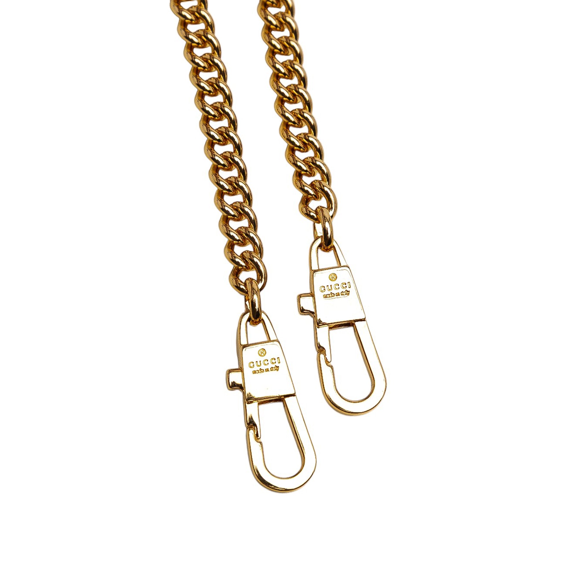 This satchel features an acrylic body, a flat top handle, a detachable chain link shoulder strap, a flap with buckle lock closure, and an interior slip pocket. Retail Price: 2350.00