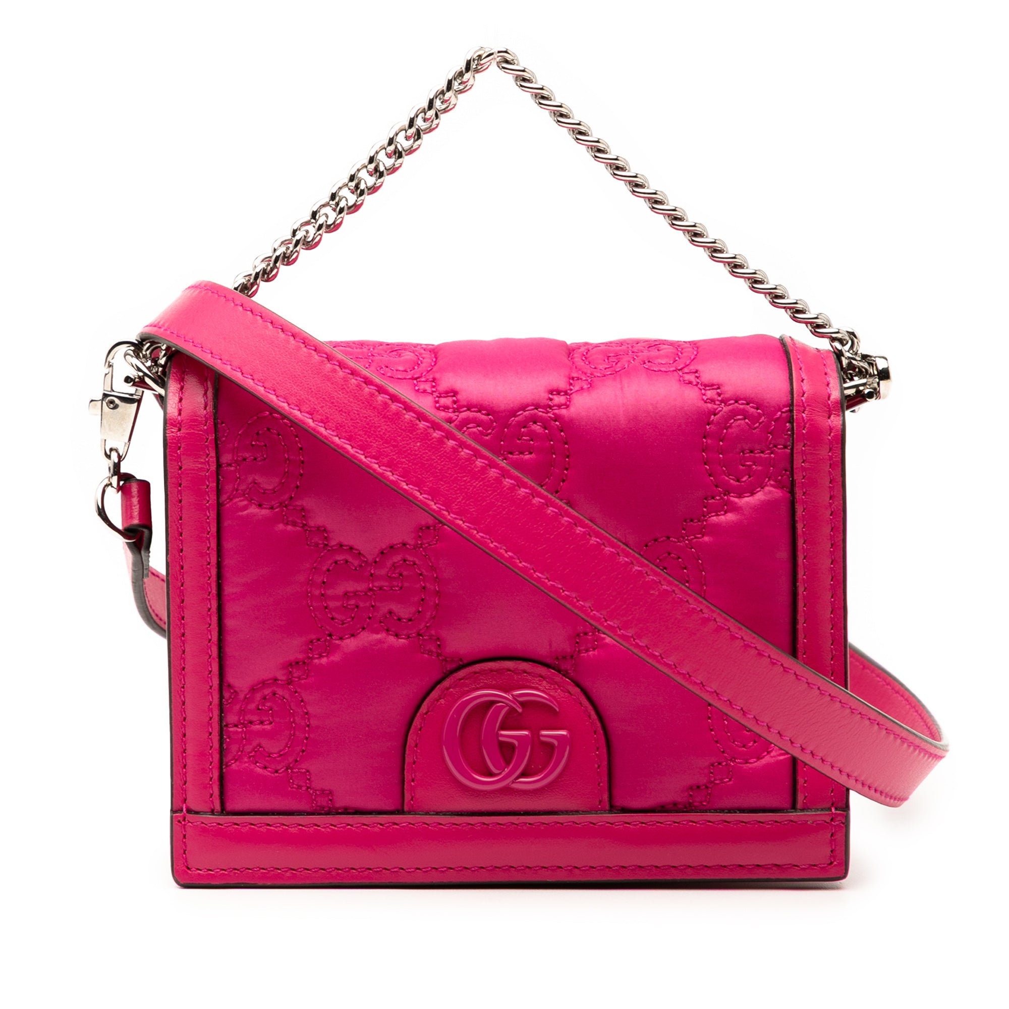 This satchel features an embossed leather body, a silver tone chain link handle, a detachable and adjustable flat leather strap, a front flap with magnetic snap closure, and interior slip pockets. Retail Price: 1690.00