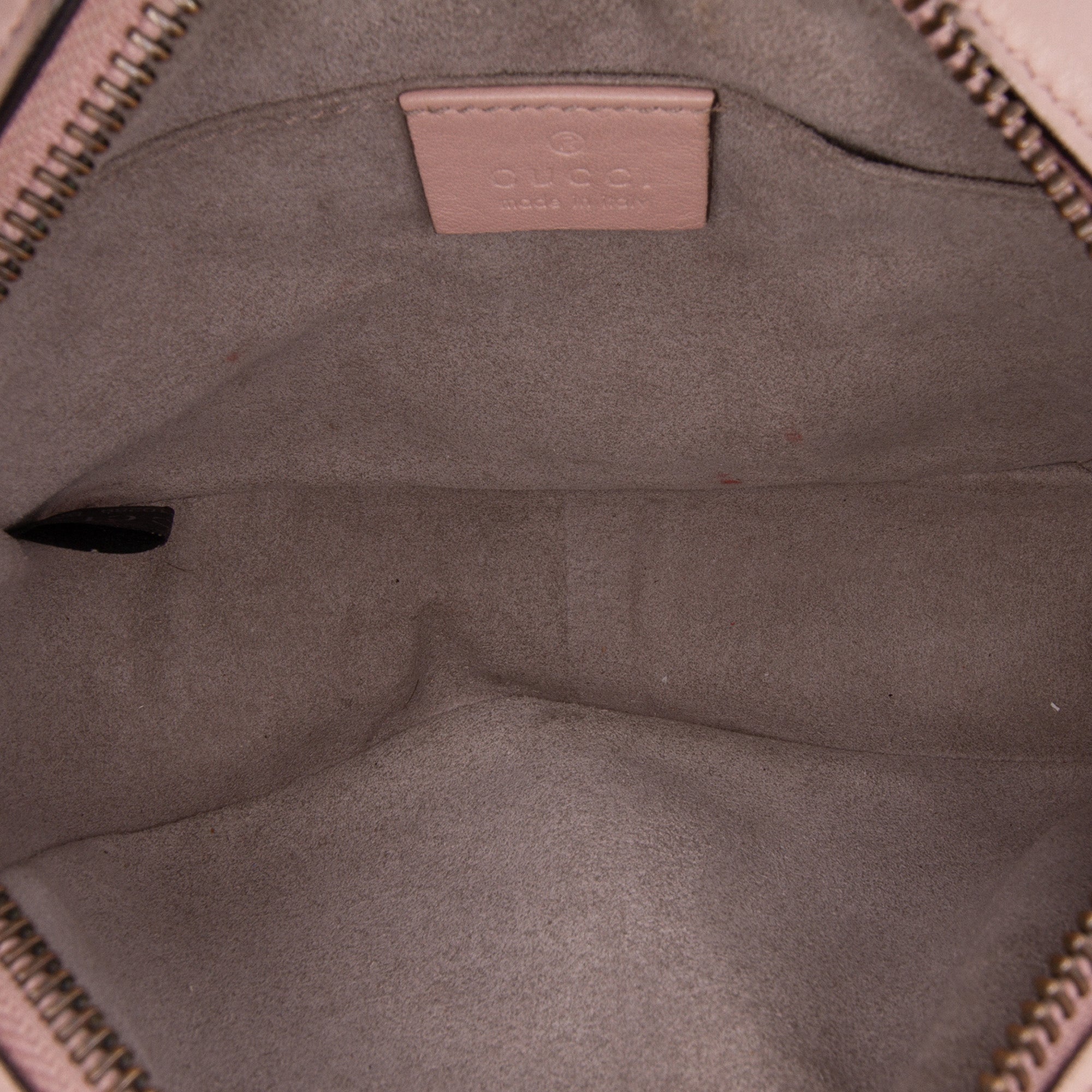 The Mini Marmont Crossbody bag features a quilted leather body, a curb chain strap with leather guard, a top zip closure, and an interior slip pocket. Retail Price: 2550.00