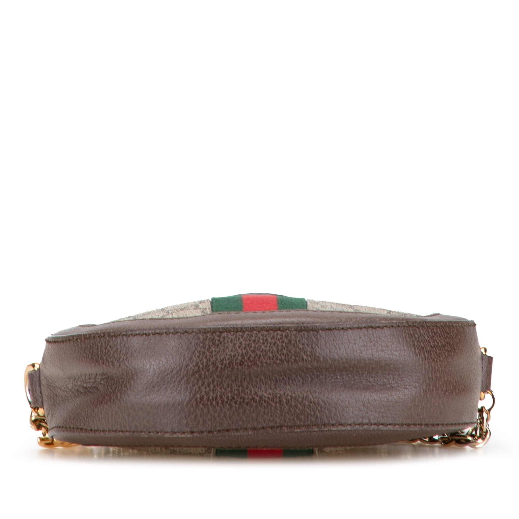 The Ophidia crossbody features a coated canvas body with leather and web trim, a chain link and a flat leather strap, and a top zip closure. Retail Price: 1650.00