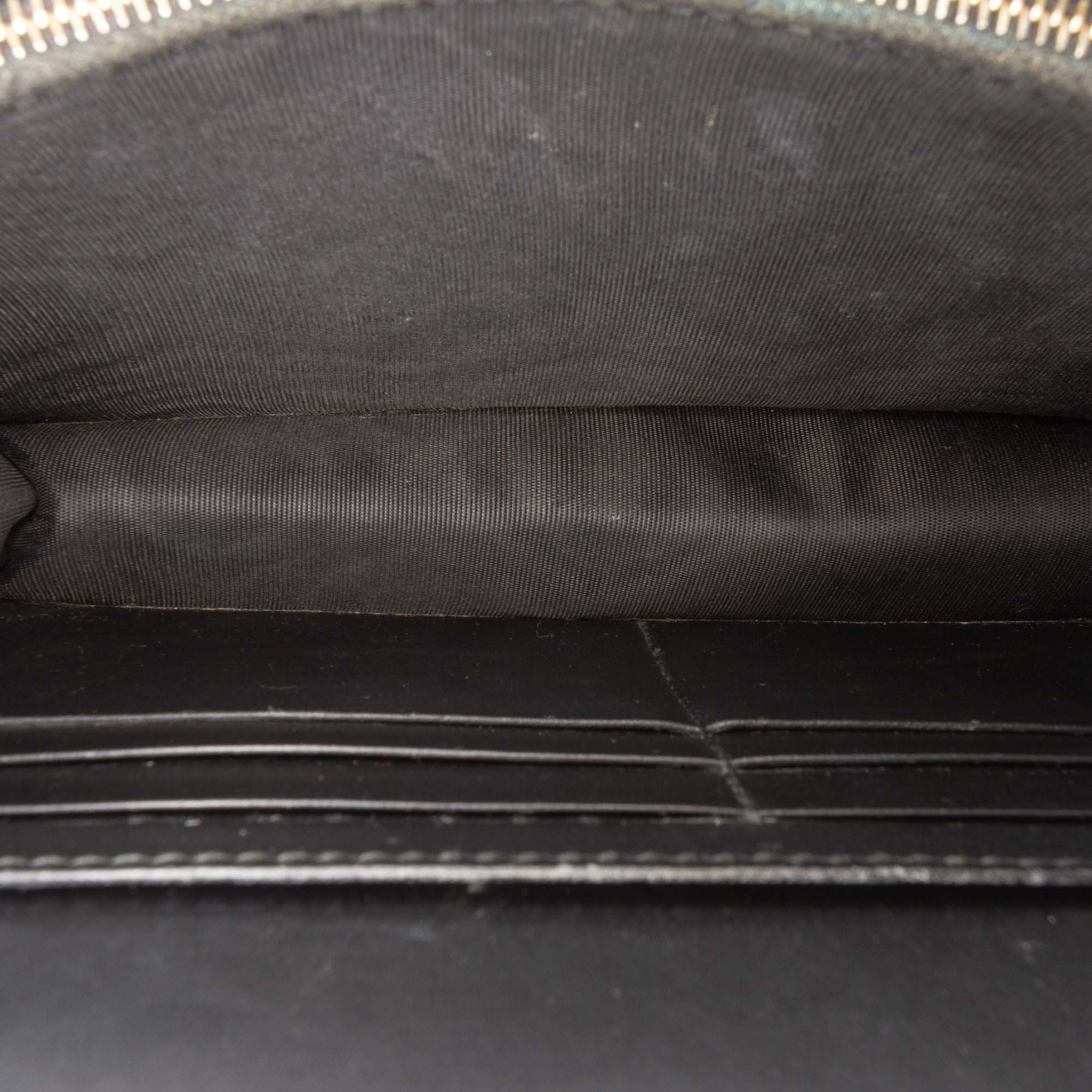 This wallet on chain features an embossed leather body, a curb chain shoulder strap, a flap with magnetic snap closure, and interior zip and slip pockets. Retail Price: 895.00