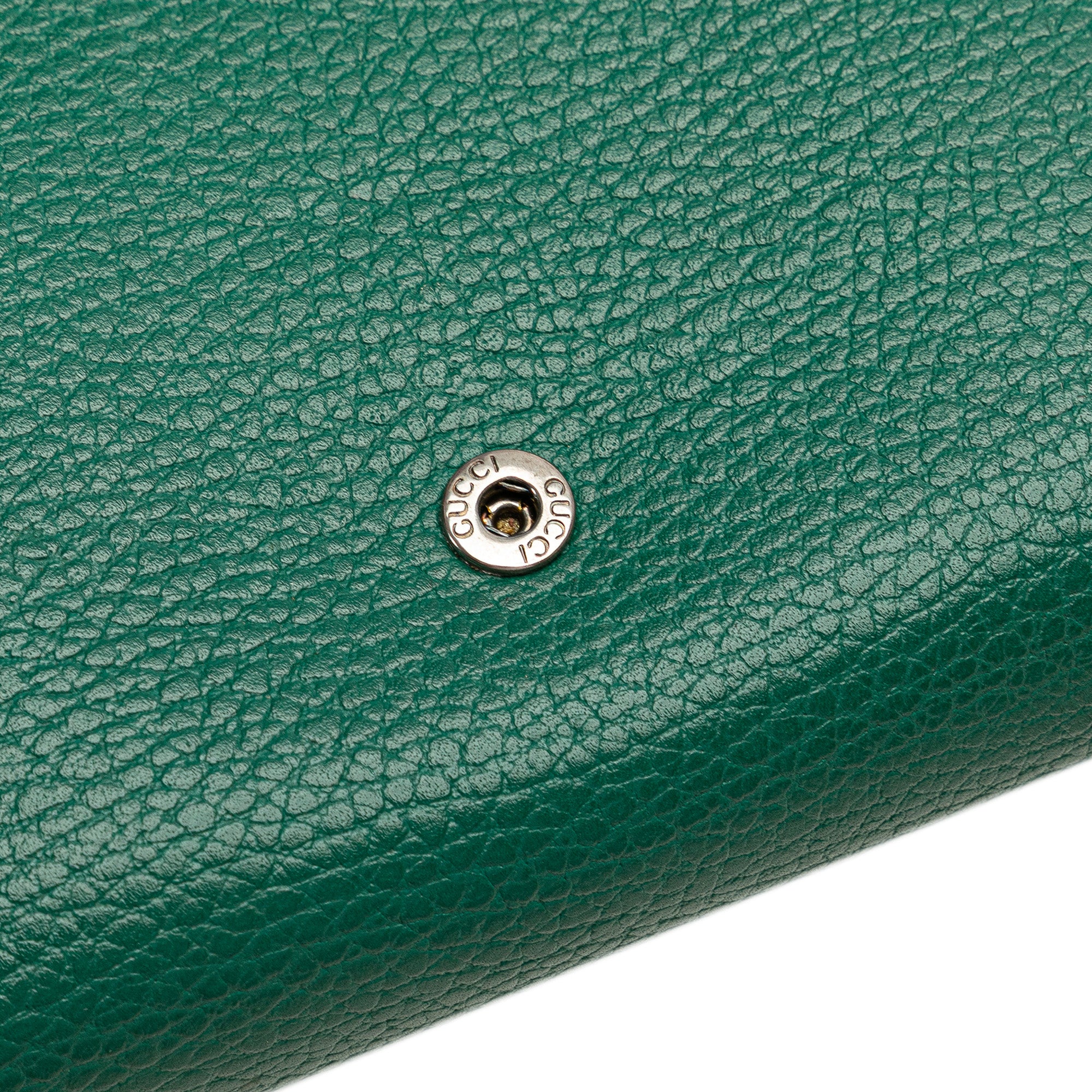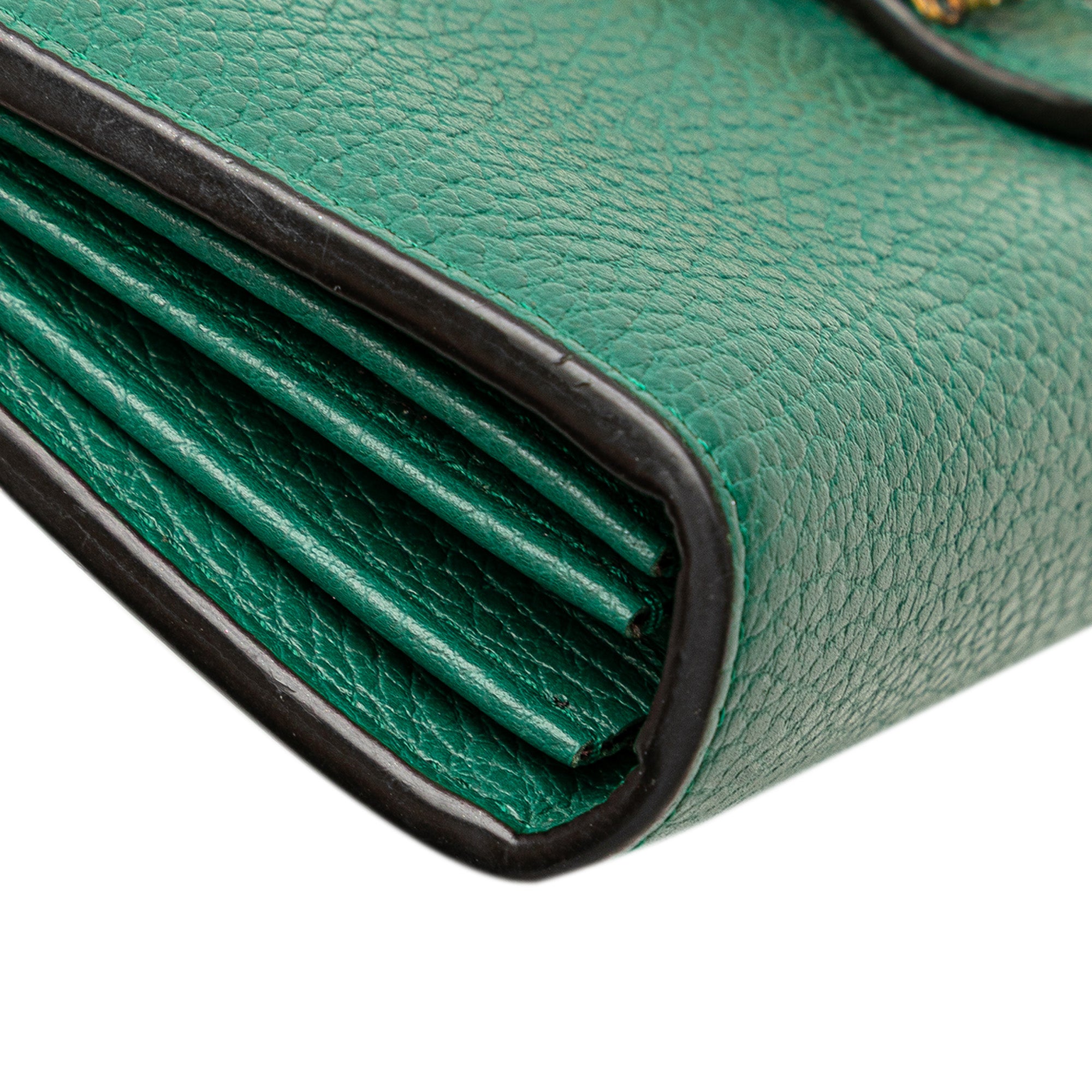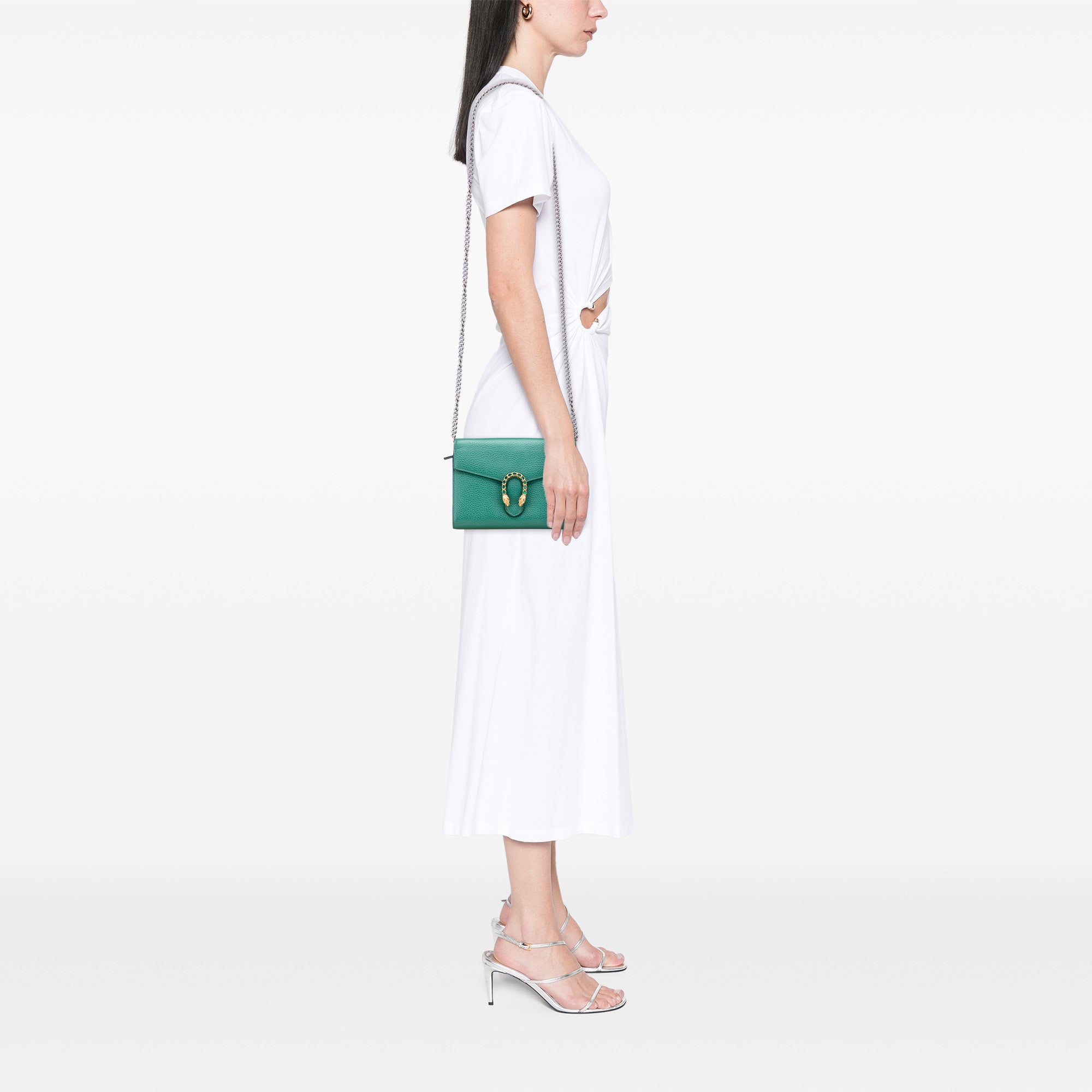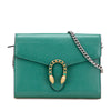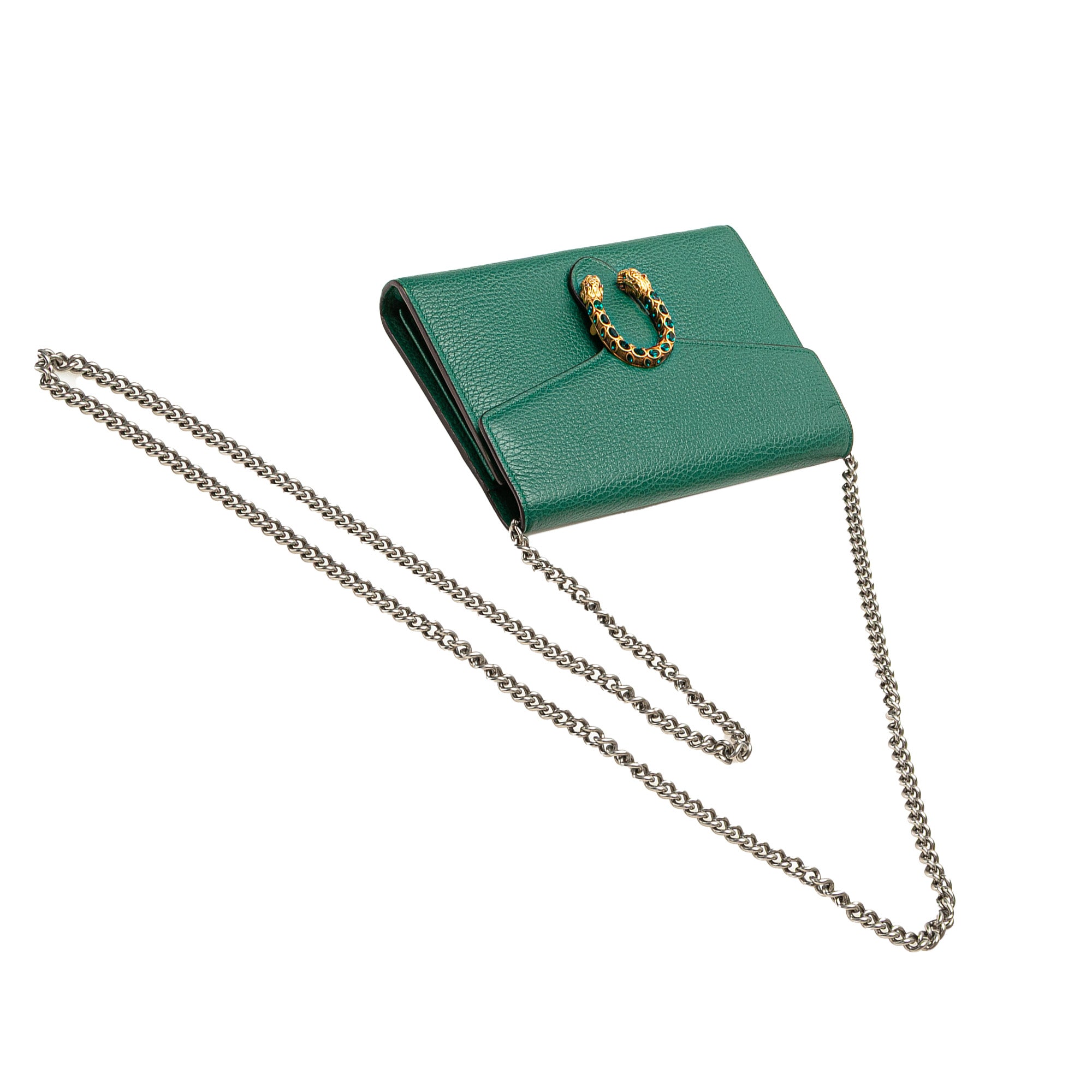The Dionysus features a leather body, a chain link shoulder strap, a front flap with a snap button closure, and interior zip and slip pockets. Retail Price: 1800.00