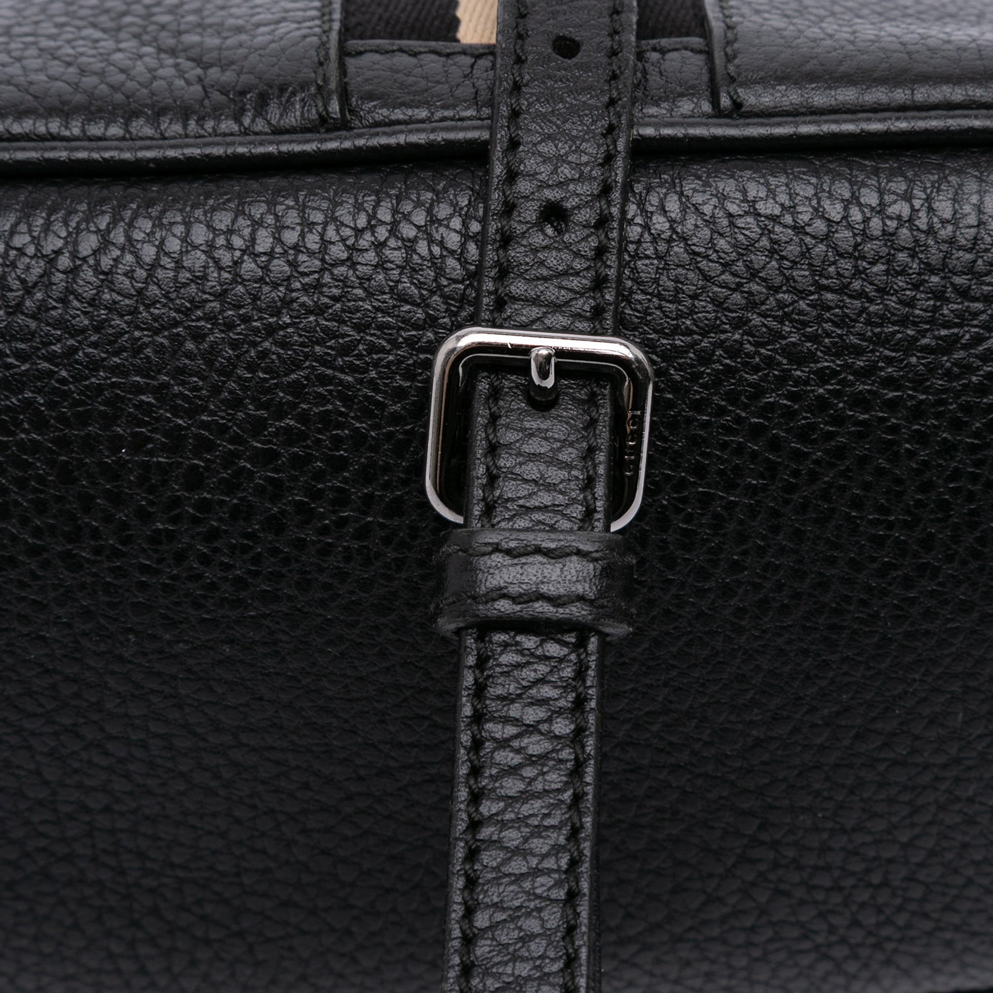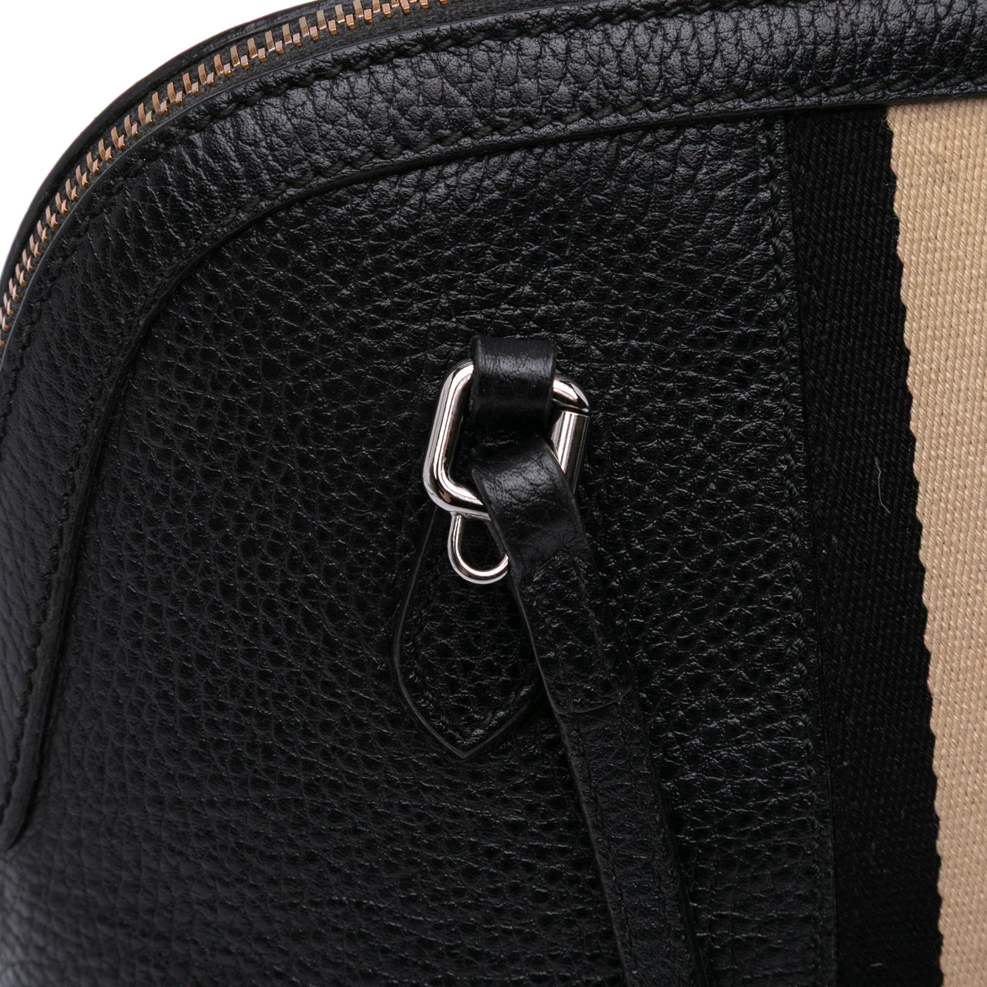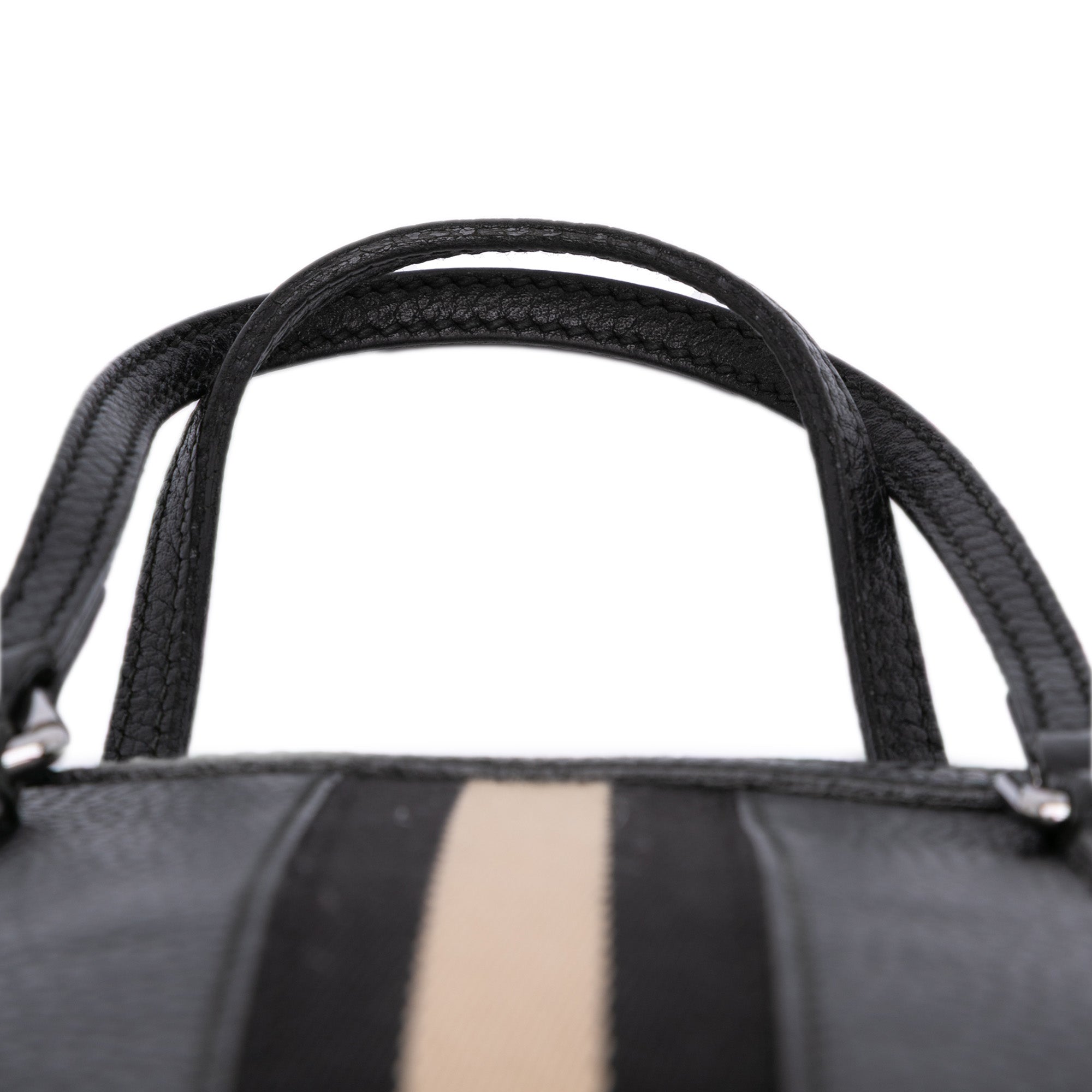 This satchel features a leather body with web details, flat leather handles, a detachable flat leather strap, a top zip closure, and an interior slip pocket. Retail Price: 1195.00