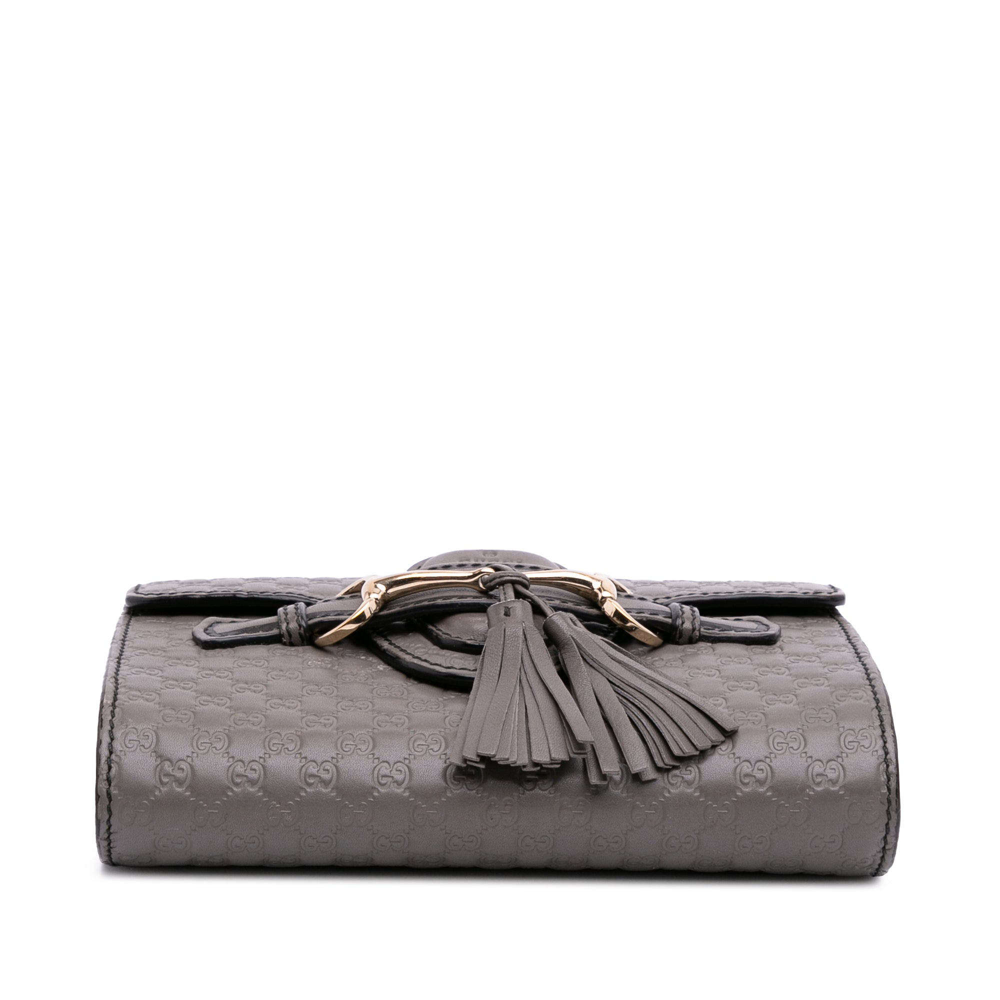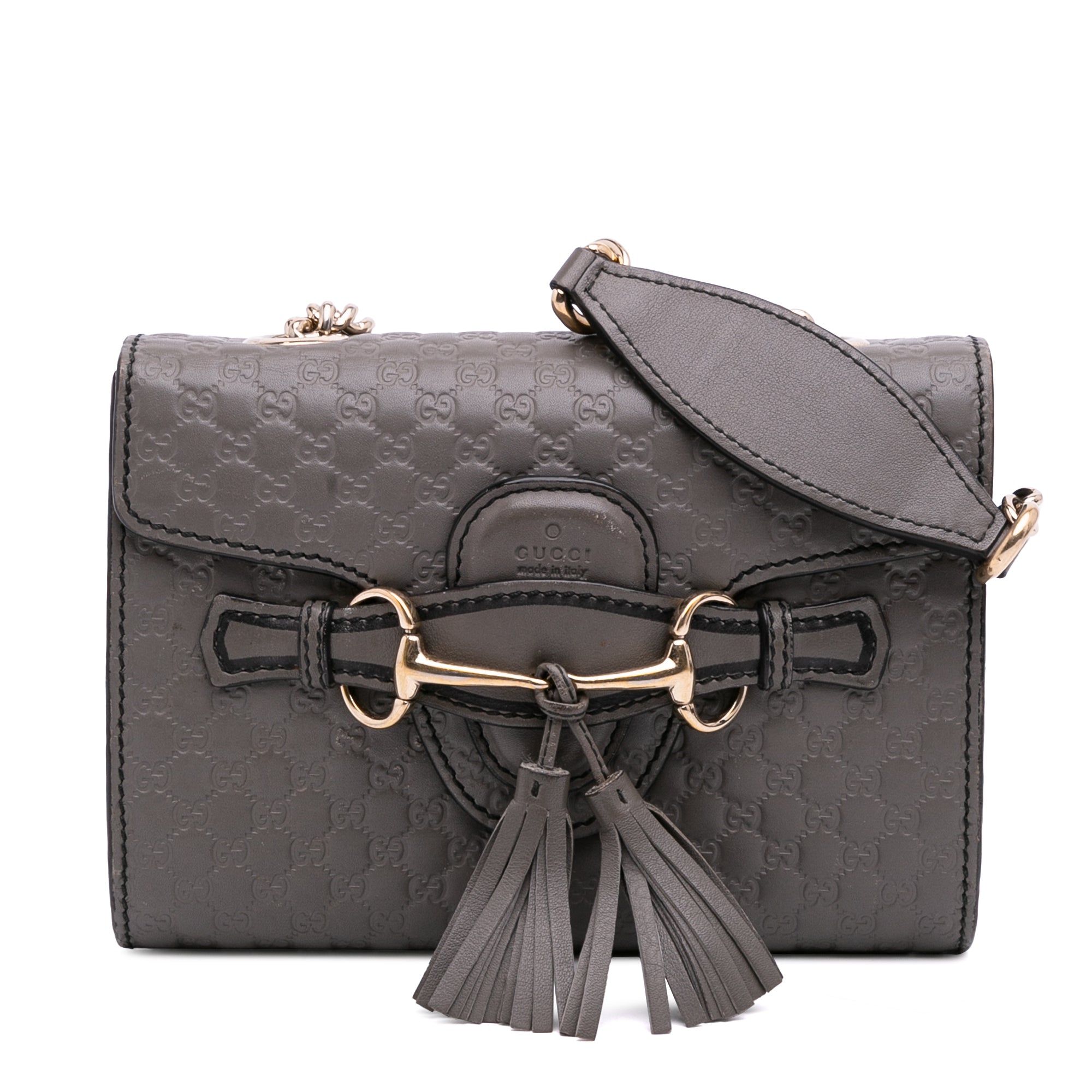 The Mini Emily features an embossed leather body, curb chain strap, a front flap with a slip through closure and a tassel detail, and an interior slip pocket. Retail Price: 1425.00