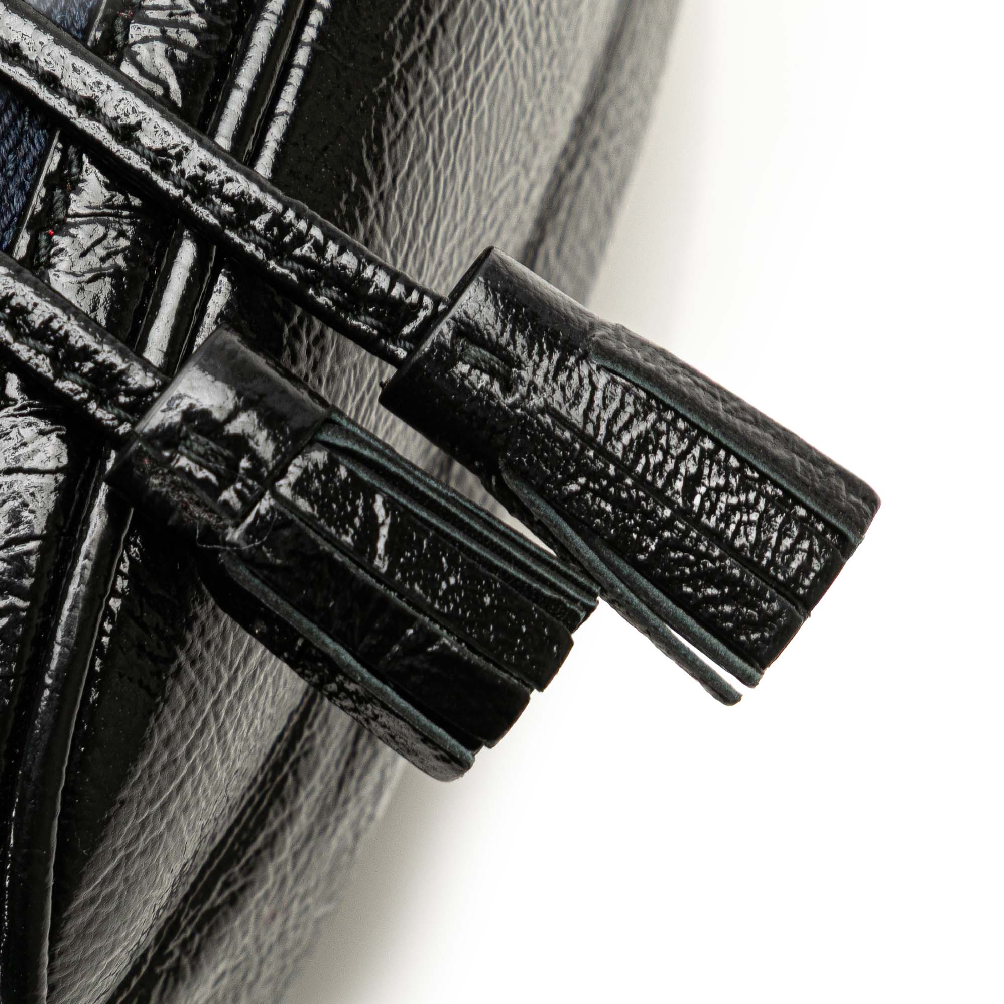 The Ophidia bucket bag features a suede body with patent leather trim, an adjustable flat leather strap, and an open top with a drawstring closure. Retail Price: 1390.00