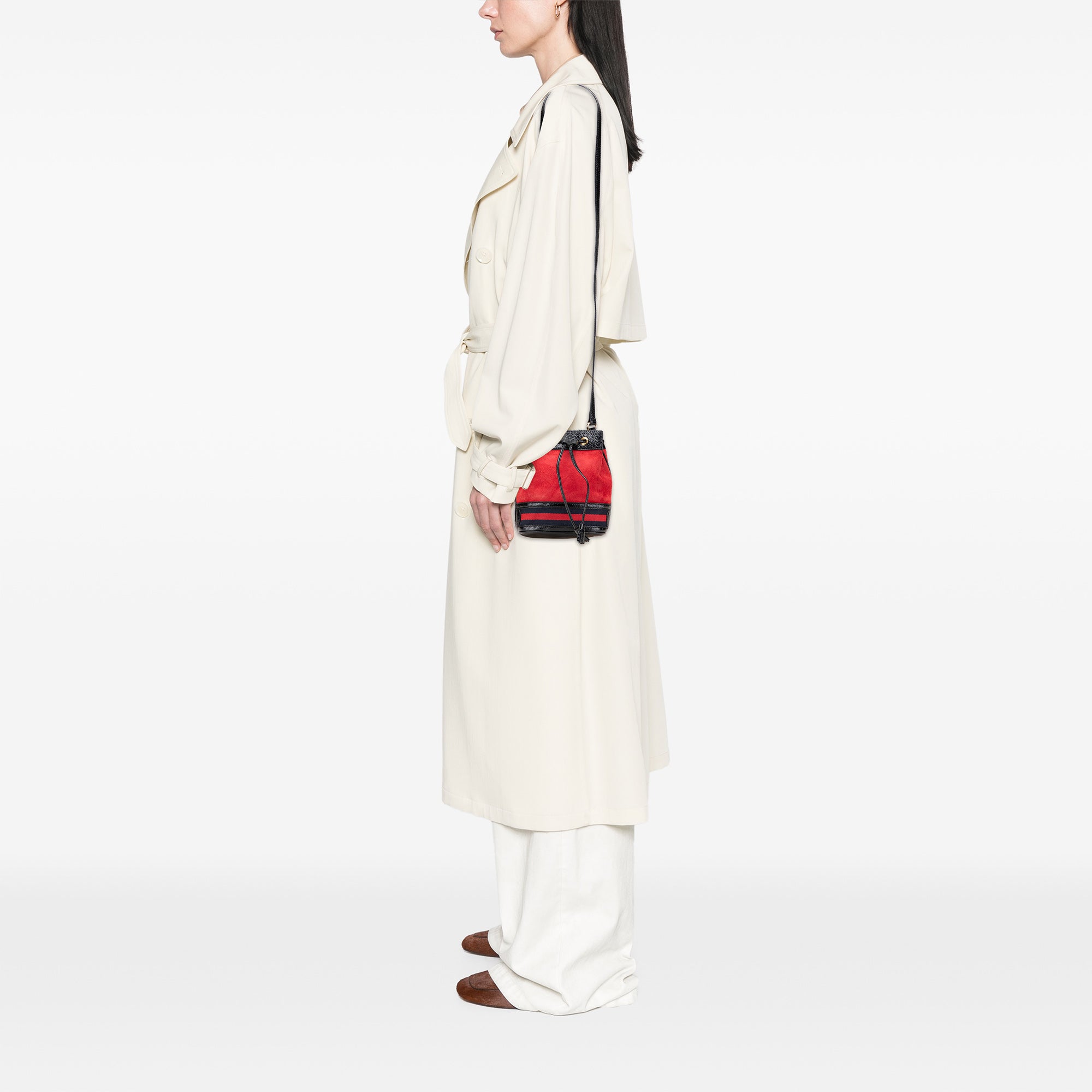 The Ophidia bucket bag features a suede body with patent leather trim, an adjustable flat leather strap, and a top drawstring closure. Retail Price: 1390.00